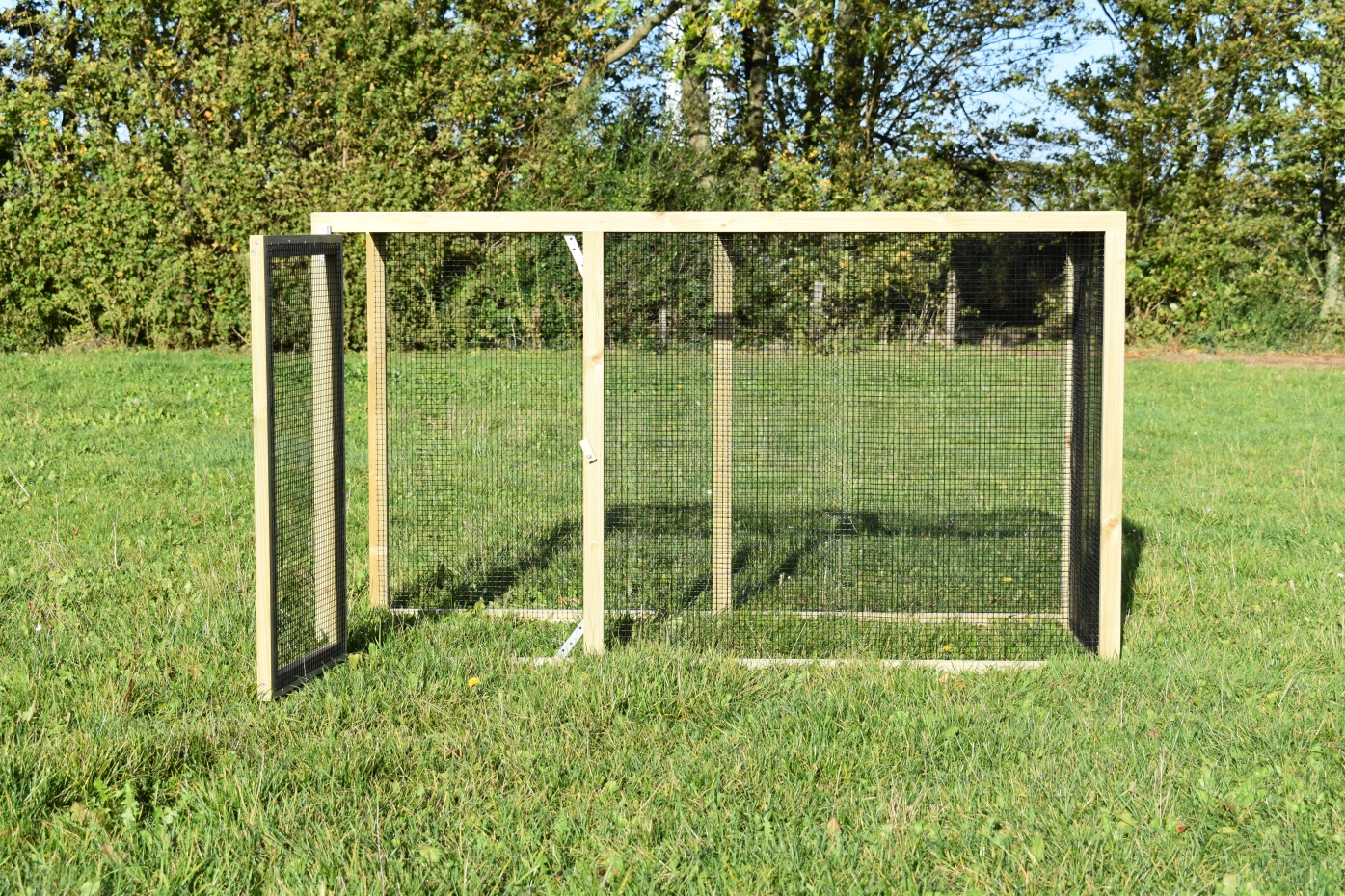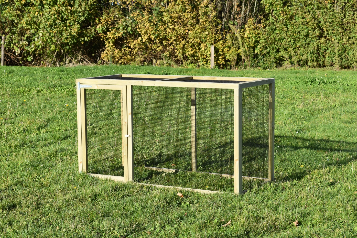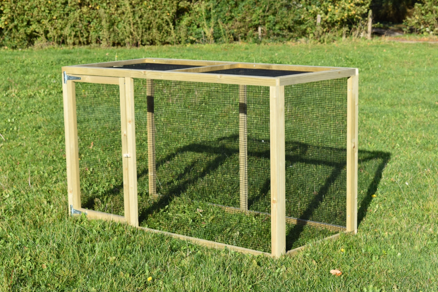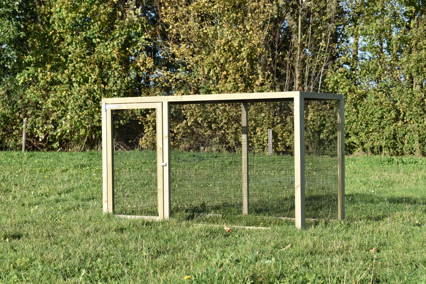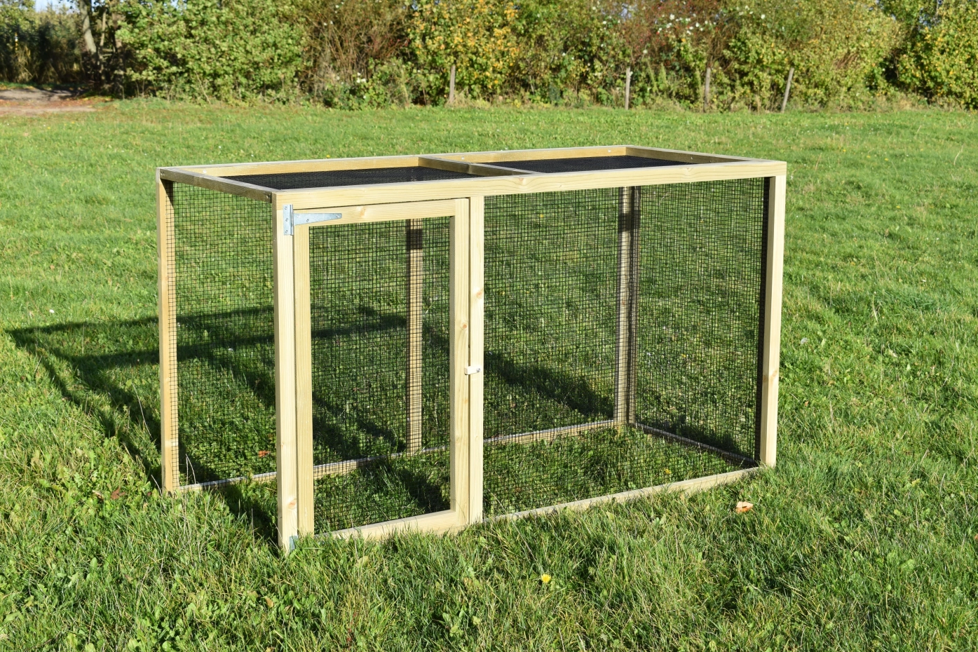 Der Anbau-Auslauf Rosa, mit Gitterdach, hat ein große Tür. Der Auslauf ist geeignet für die Heuhaufen Rosa und Rosalynn. Diese Auslauf kann einfach, mit 4 Schrauben, verbunden werden.