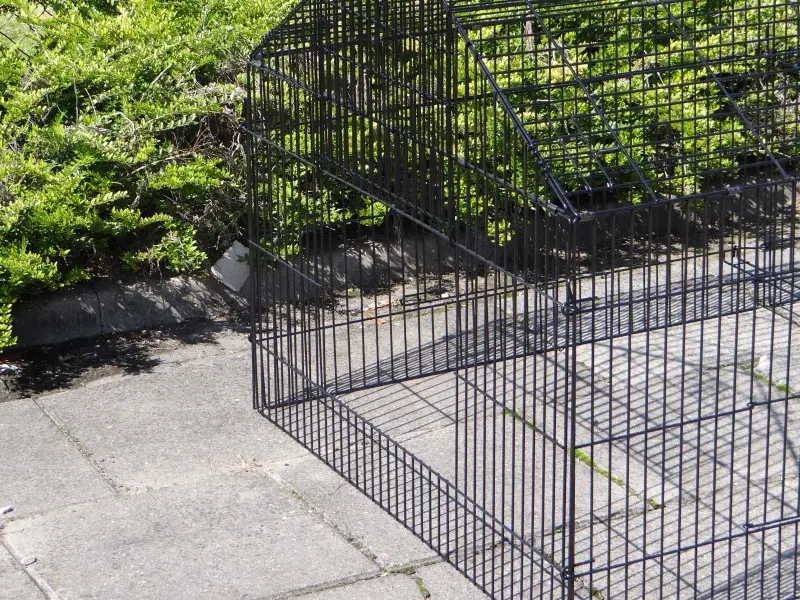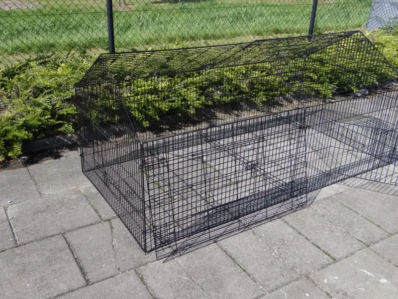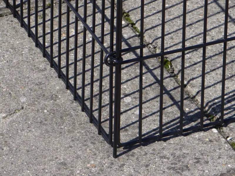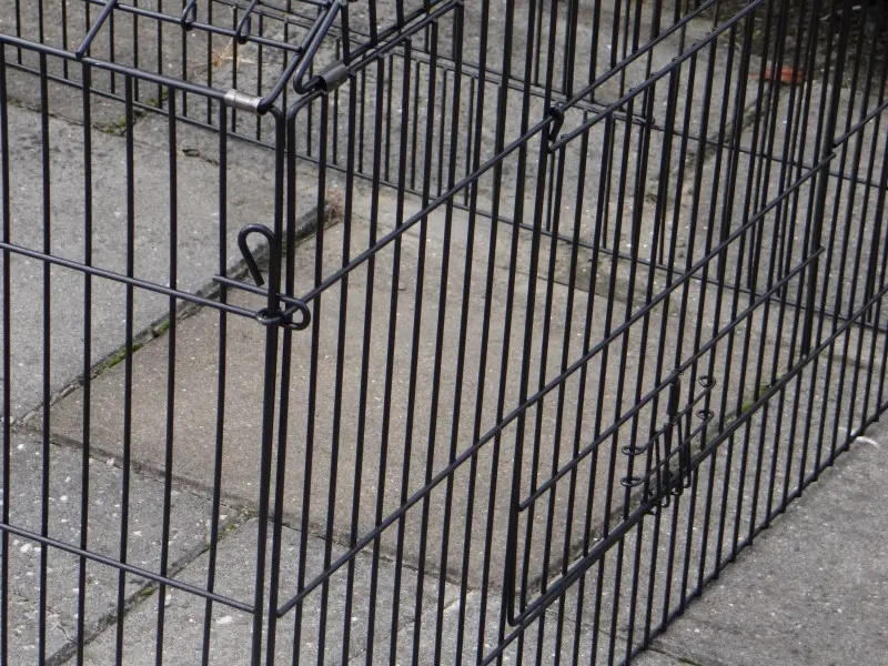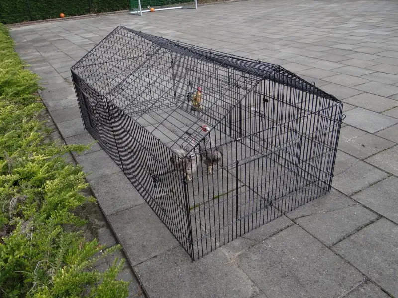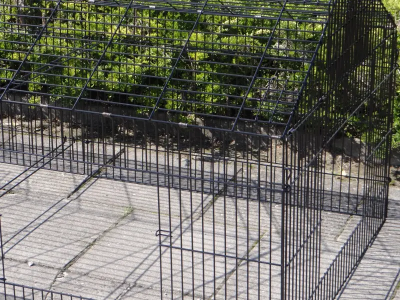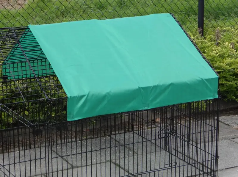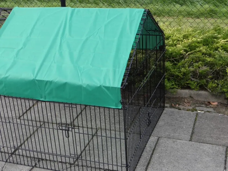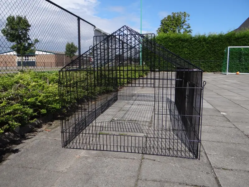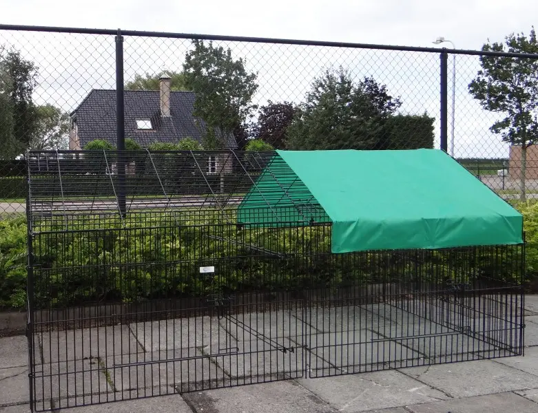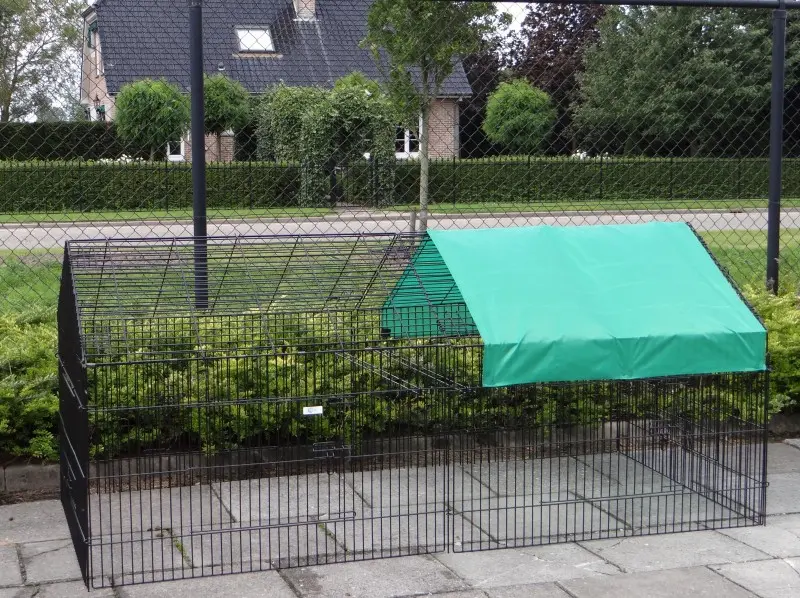 Freilaufgehege Louis mit Sonnenschutz ist ein sehr stabiler Auslauf aus pulverbeschichtetem Stahlgitter. Er eignet sich als Kaninchen-, Hühner- und Katzenauslauf sowie für kleine Hunde. Dieser praktische Laufstall mit Sonnenschutz verfügt über satte 6 (!) große Türen im stabilen Gitter. Tierlauf Louis ist beliebig erweiterbar und in der Regel einfach mit einem Hühnerstall, Kaninchenstall oder einem anderen Tierheim kombinierbar. Die Dachpaneele dieses praktischen Laufstalls können über die gesamte Länge des Laufstalls aufgeklappt werden. Die Seitenwand dieses Laufstalls (der steile Teil) ist ca. 71 cm hoch.