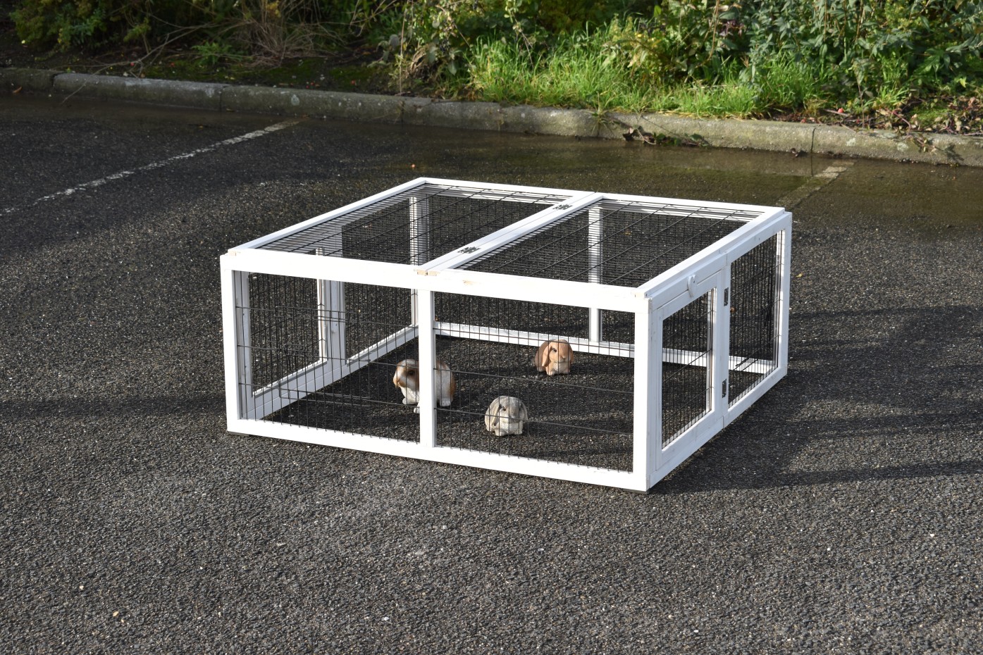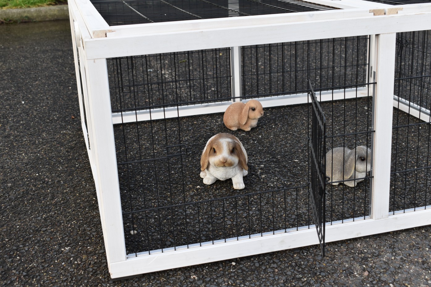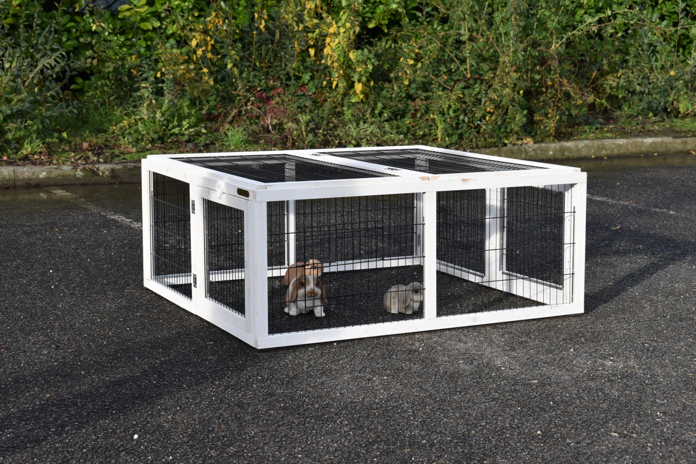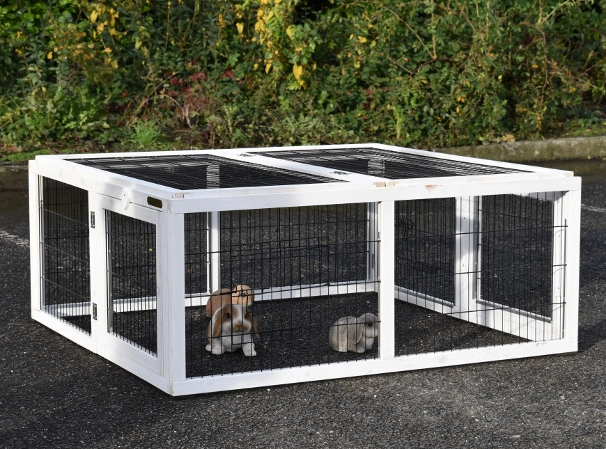 Kaninchenauslauf Multirun Anti-Nagen, Farbe Weiß. Der Auslauf Multirun ist mit Aluminiumstreifen an den meisten Kanten ausgestattet, um das Nagen zu verhindern. Das Kaninchengehege ist praktisch faltbar und kann problemlos an verschiedenen Kaninchenställen befestigt werden. Der Kaninchenauslauf Multirun kann auch unabhängig von Ihrem Kaninchenstall aufgestellt werden. Dieses praktische Auslauf hat an 3 Seiten eine Tür im Gitterwerk und an 2 Seiten ein herausnehmbares Paneel. Dadurch können mehrere Ausläufe beliebig kombiniert werden. Auch das Oberteil des Kaninchengeheges lässt sich leicht hochklappen und einfach entfernen. Ein multifunktionales Gehege also!