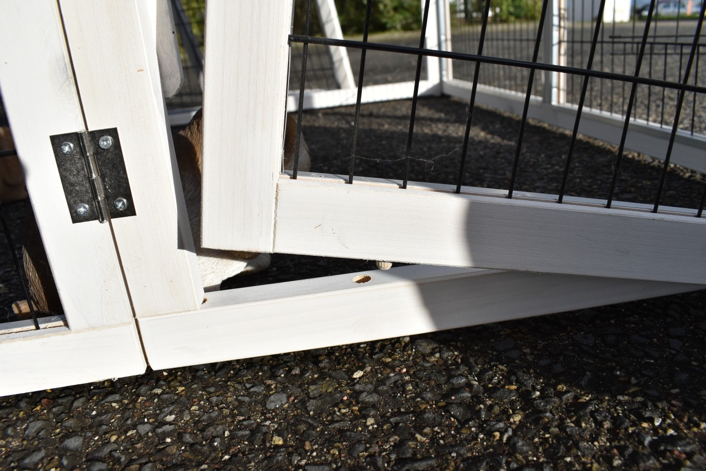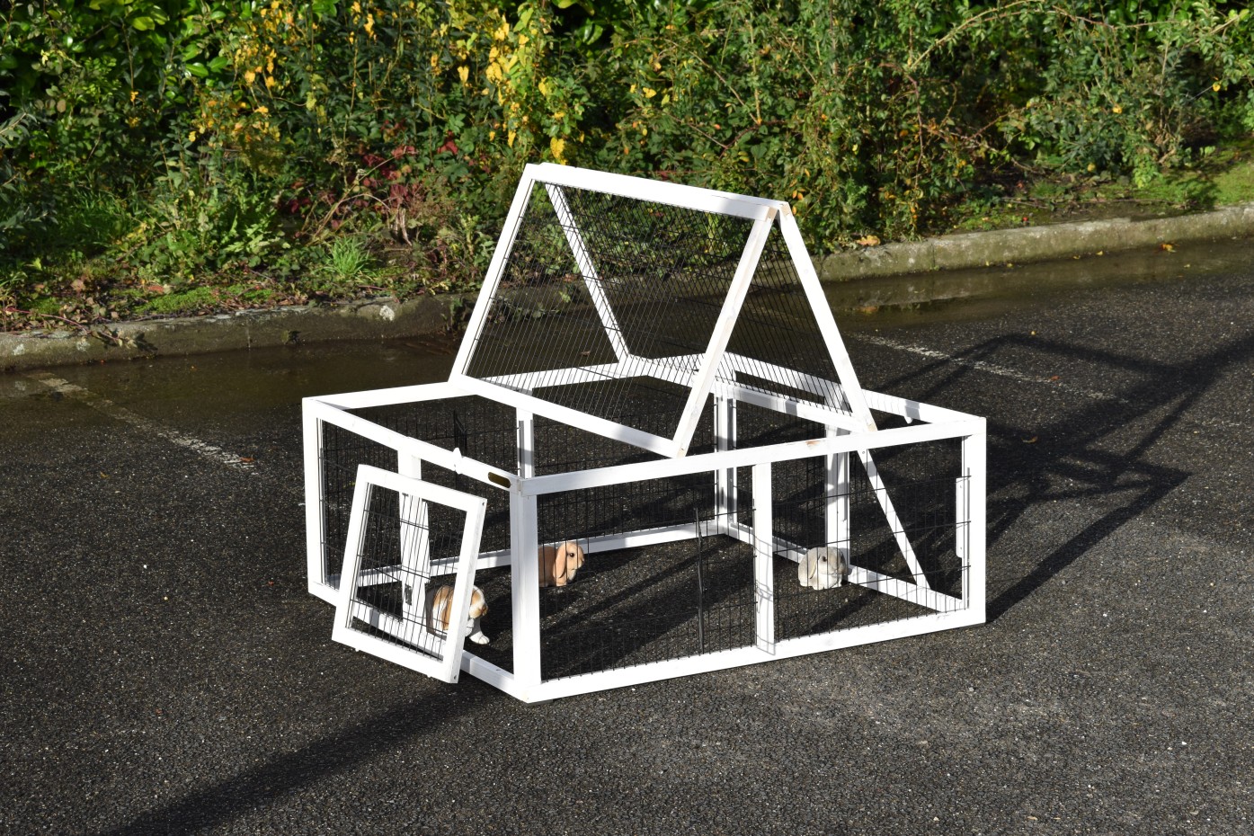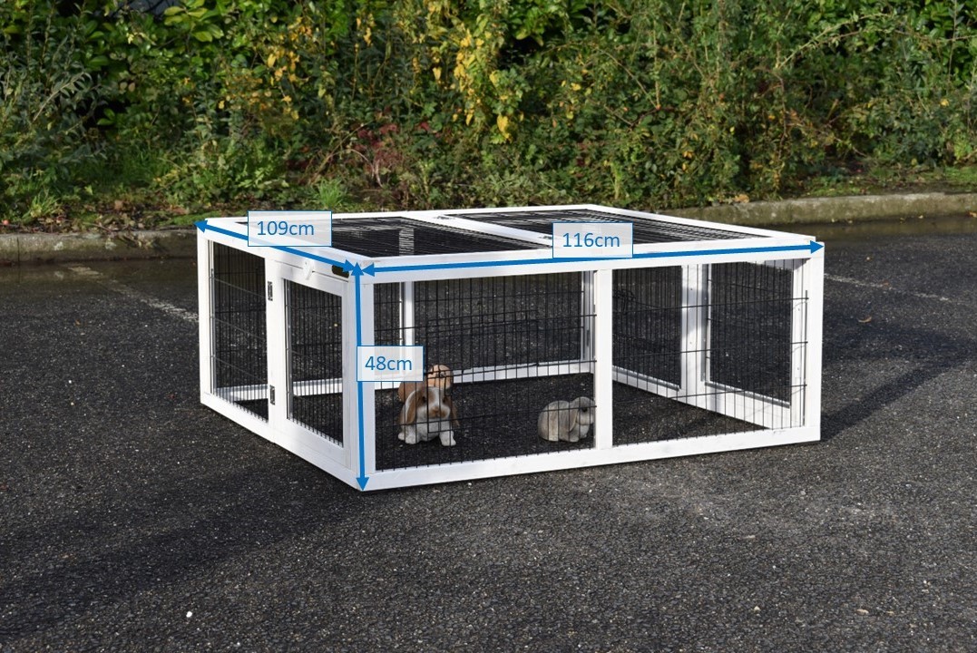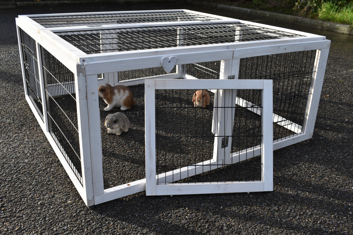 Kaninchenauslauf Multirun Anti-Nagen, Farbe Weiß. Der Auslauf Multirun ist mit Aluminiumstreifen an den meisten Kanten ausgestattet, um das Nagen zu verhindern. Das Kaninchengehege ist praktisch faltbar und kann problemlos an verschiedenen Kaninchenställen befestigt werden. Der Kaninchenauslauf Multirun kann auch unabhängig von Ihrem Kaninchenstall aufgestellt werden. Dieses praktische Auslauf hat an 3 Seiten eine Tür im Gitterwerk und an 2 Seiten ein herausnehmbares Paneel. Dadurch können mehrere Ausläufe beliebig kombiniert werden. Auch das Oberteil des Kaninchengeheges lässt sich leicht hochklappen und einfach entfernen. Ein multifunktionales Gehege also!