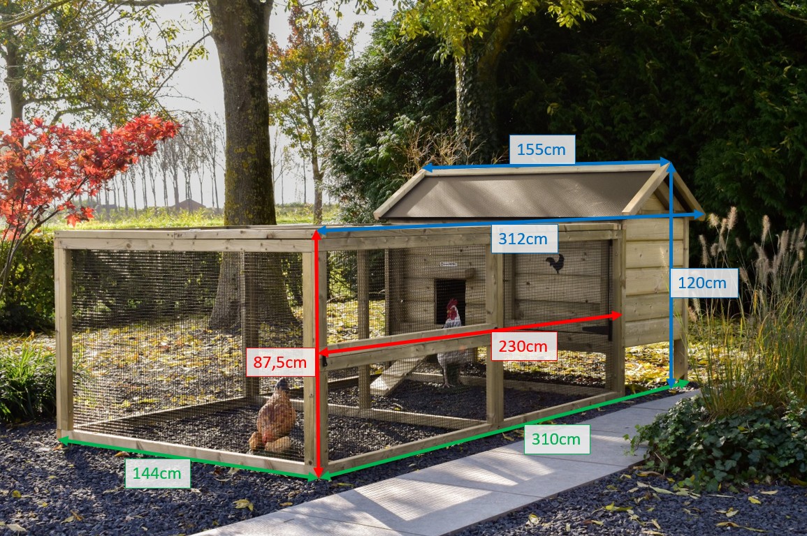 Dieses niedrige Modell mit großzügigem Auslauf bietet Ihren Hühnern viel Platz zum Scharren und Aktivsein. Stall und Auslauf lassen sich dank des aufklappbaren Dachs und der praktischen Tür an der Vorderseite des Stalls leicht reinigen. Das hübsche Detail mit einem Hahn auf der Tür verleiht diesem Stall mit Auslauf eine besonders charmante Ausstrahlung!
