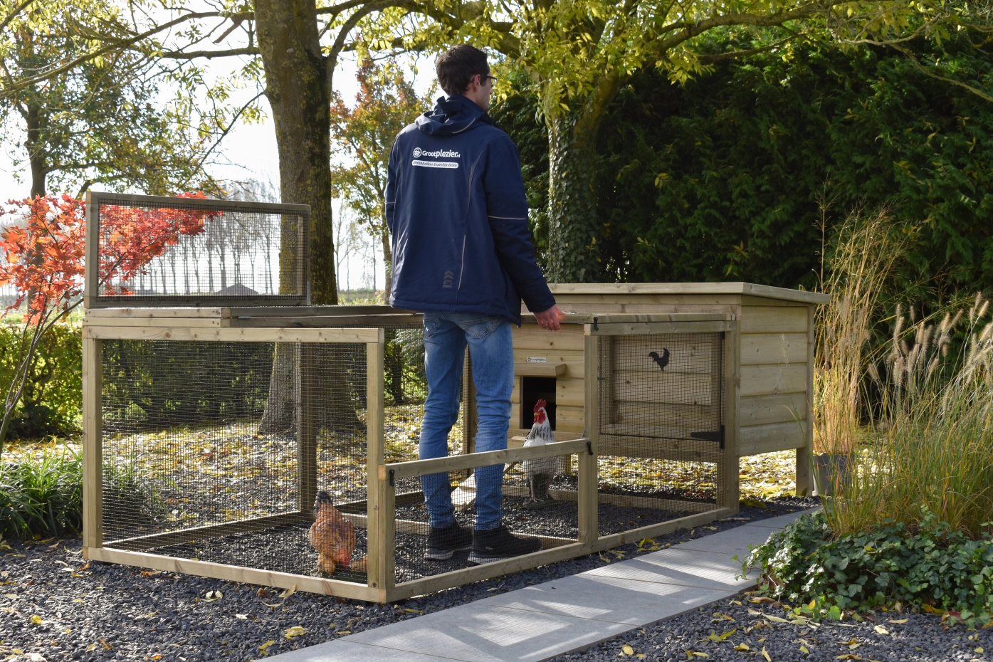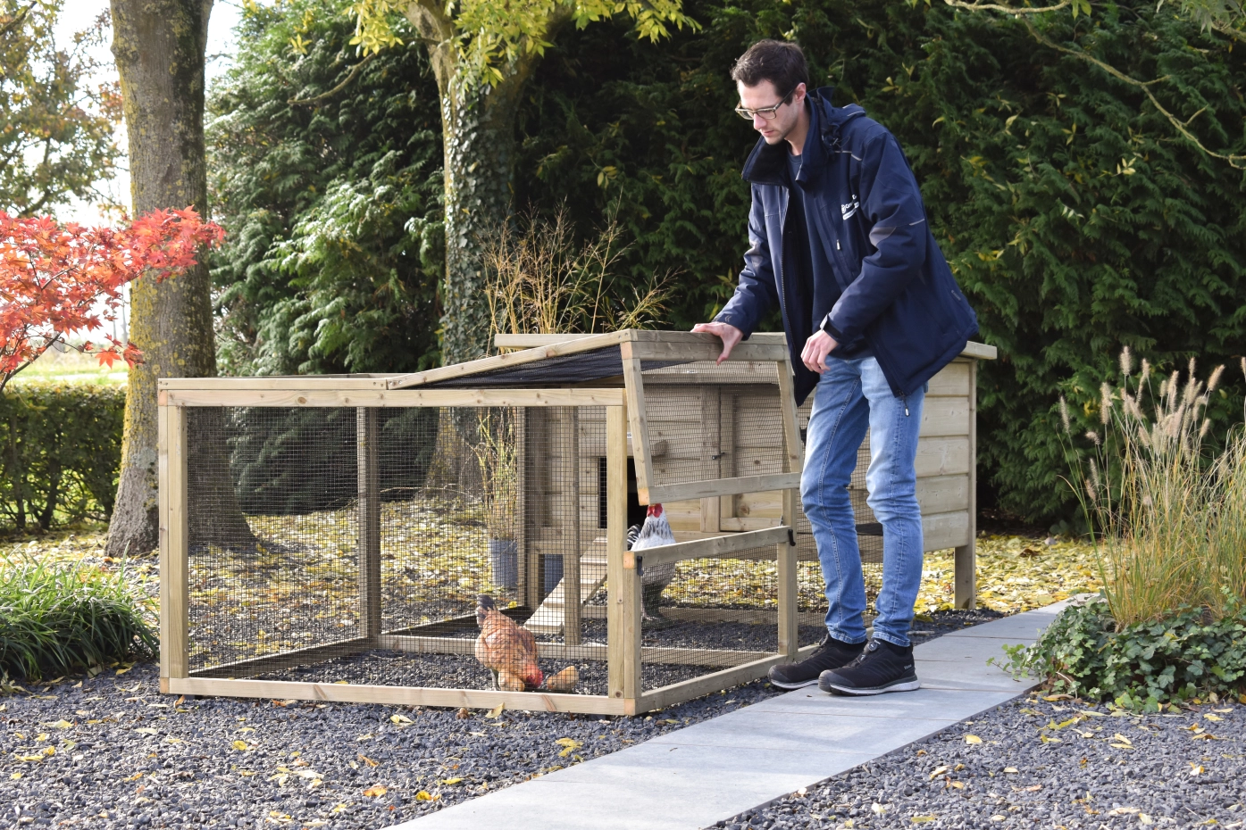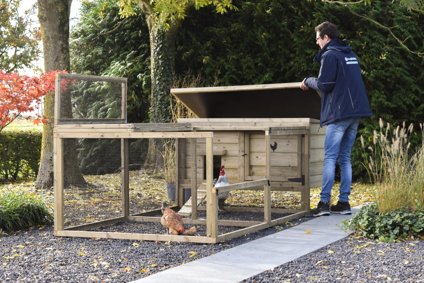 Dieses niedrige Modell mit großzügigem Auslauf bietet Ihren Hühnern viel Platz zum Scharren und Aktivsein. Stall und Auslauf lassen sich dank des aufklappbaren Dachs und der praktischen Tür an der Vorderseite des Stalls leicht reinigen. Für ein schönes Detail an der Tür können Sie ein hübsches Holztier mitbestellen. Das verleiht dem Stall eine besonders charmante Ausstrahlung!