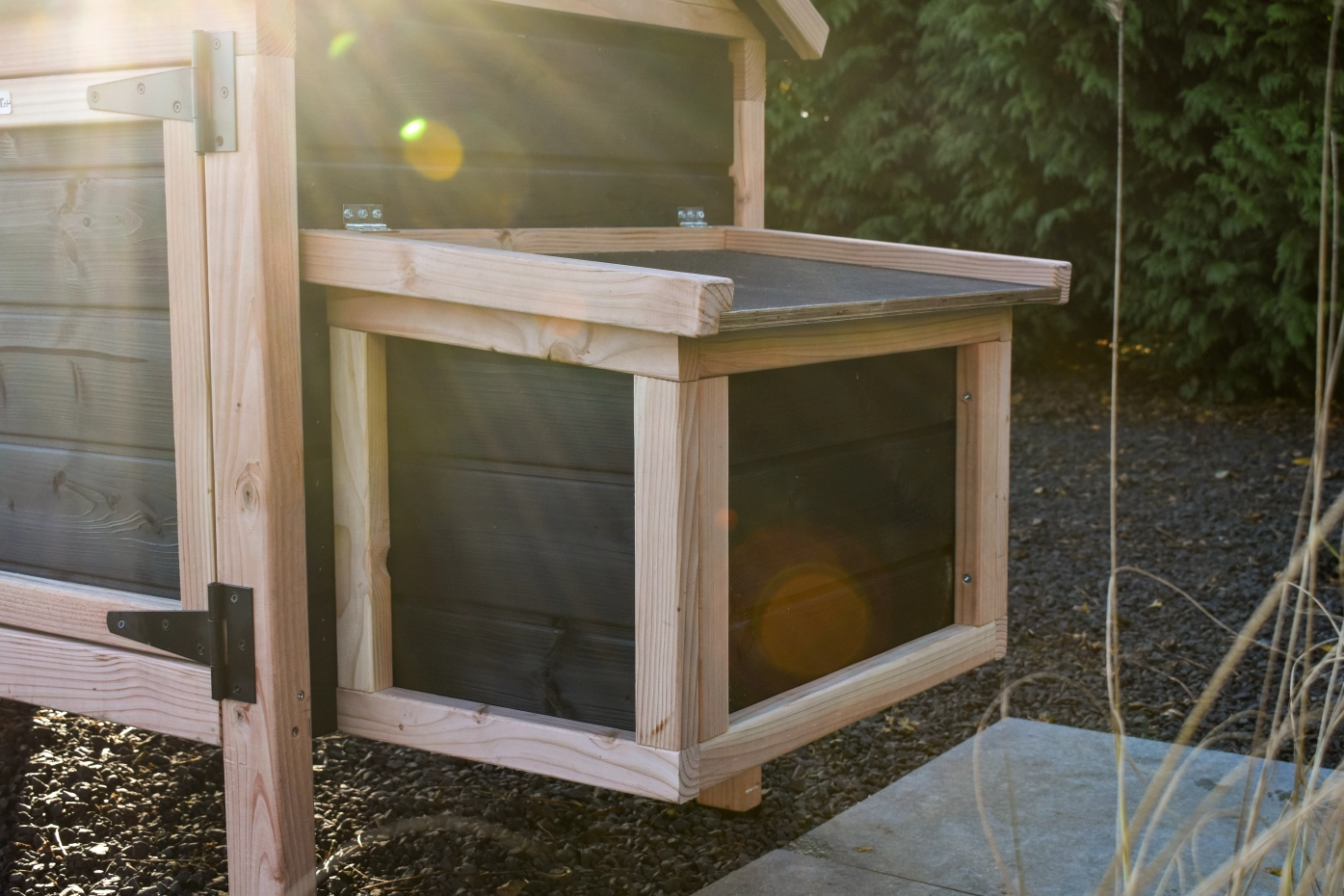 - Dieser Hühnerstall ist mit einem Legenest ausgestattet.