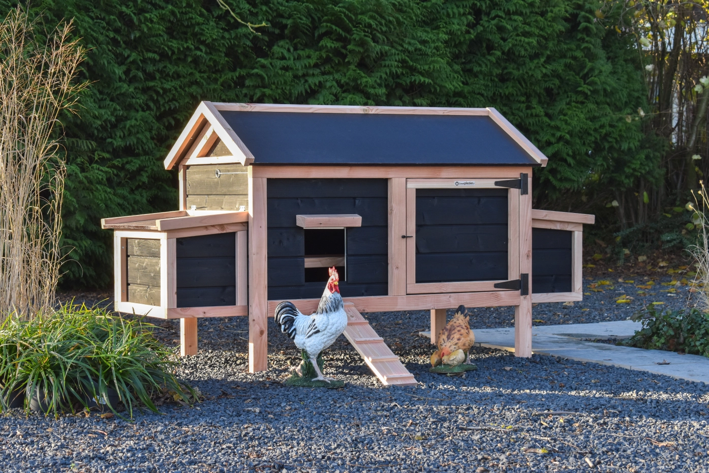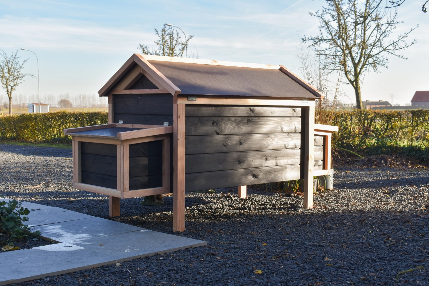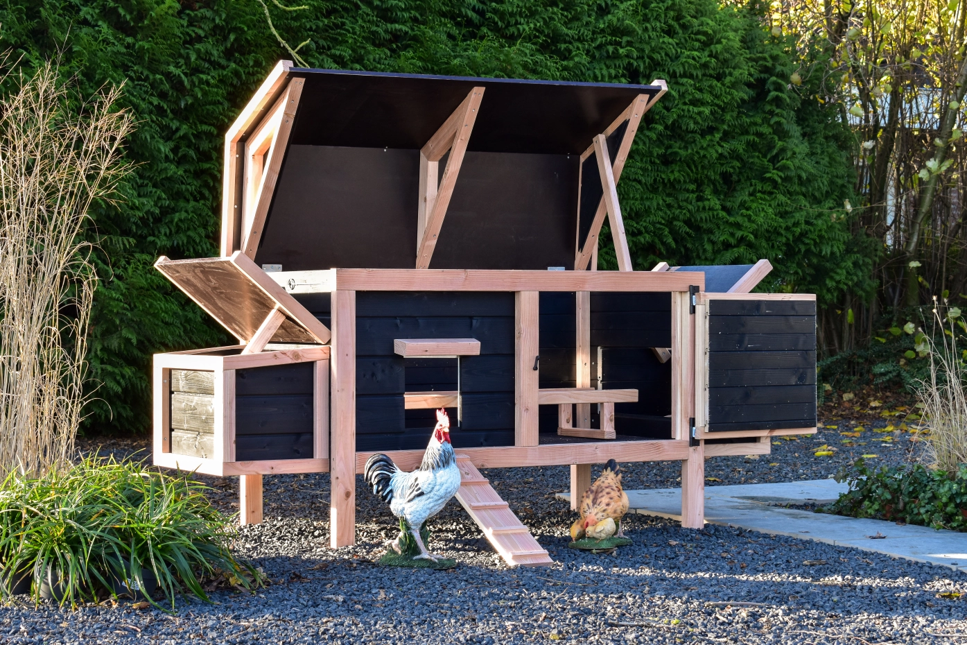Dieses niedrige Modell mit 2 Legenesten lässt sich dank des schwenkbaren Dachs und der praktischen Tür an der Vorderseite leicht reinigen. Die Legenesten verfügen ebenfalls über ein schwenkbares Dach und eine leicht herausnehmbare Bodenplatte. Die Kombination aus Douglasie und Schwarz verleiht dem Stall eine elegante Ausstrahlung.