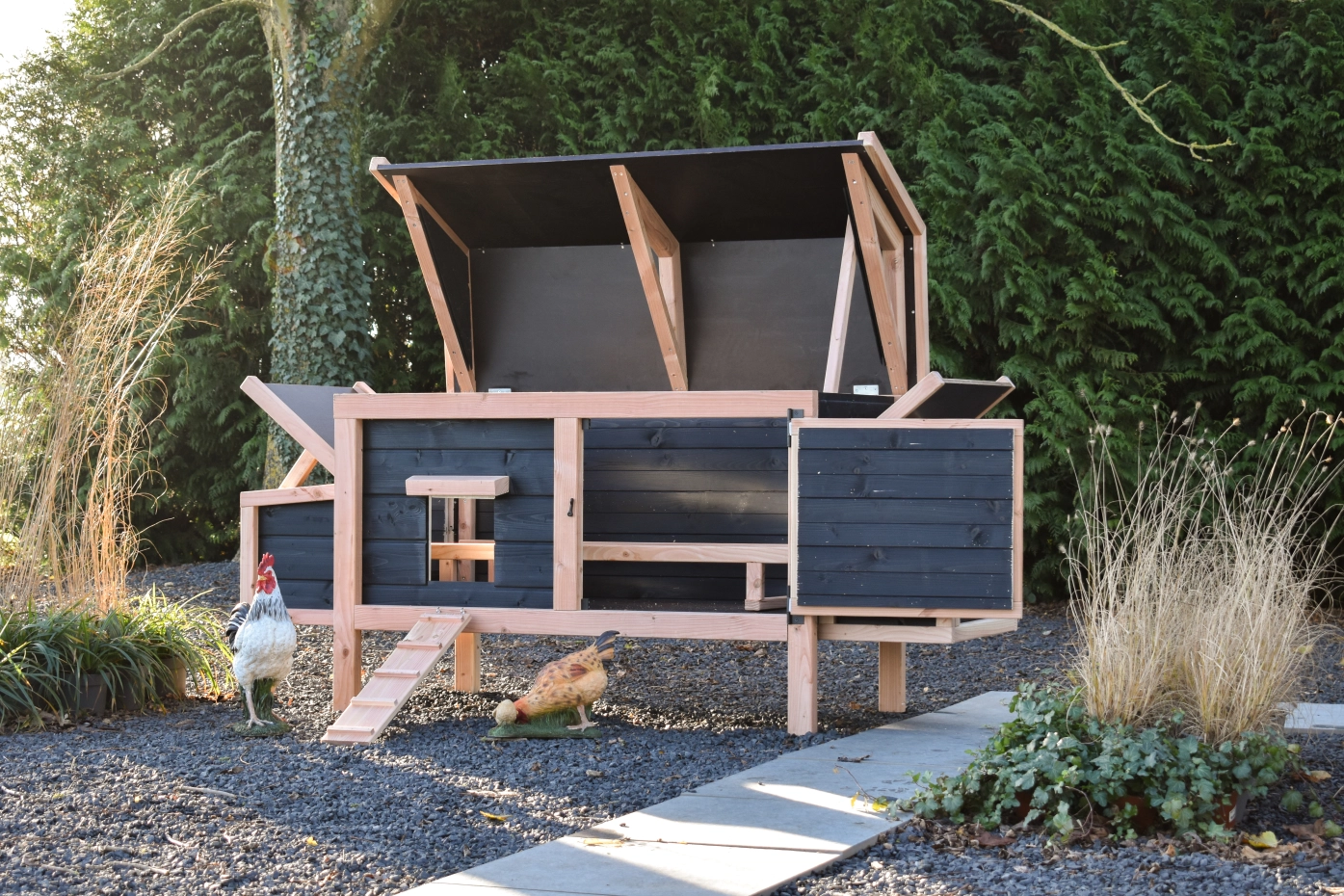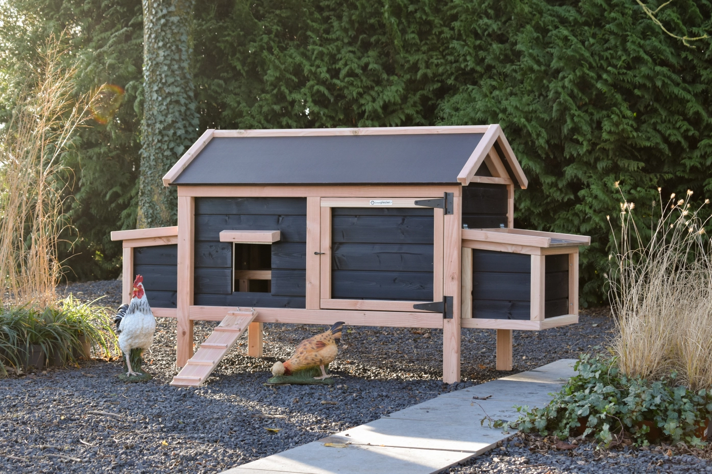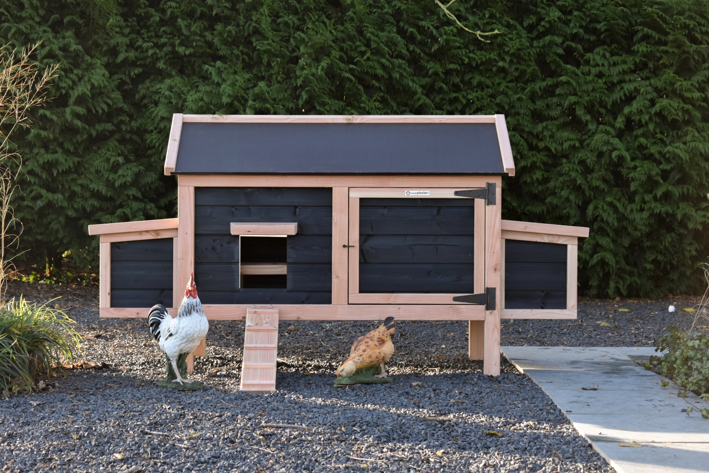 Dieses niedrige Modell mit 2 Legenesten lässt sich dank des schwenkbaren Dachs und der praktischen Tür an der Vorderseite leicht reinigen. Die Legenesten verfügen ebenfalls über ein schwenkbares Dach und eine leicht herausnehmbare Bodenplatte. Die Kombination aus Douglasie und Schwarz verleiht dem Stall eine elegante Ausstrahlung.