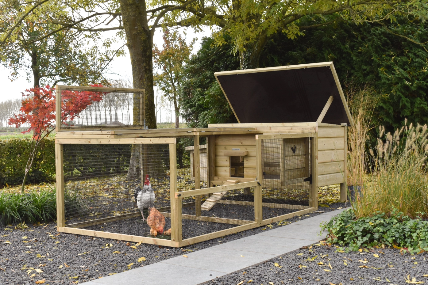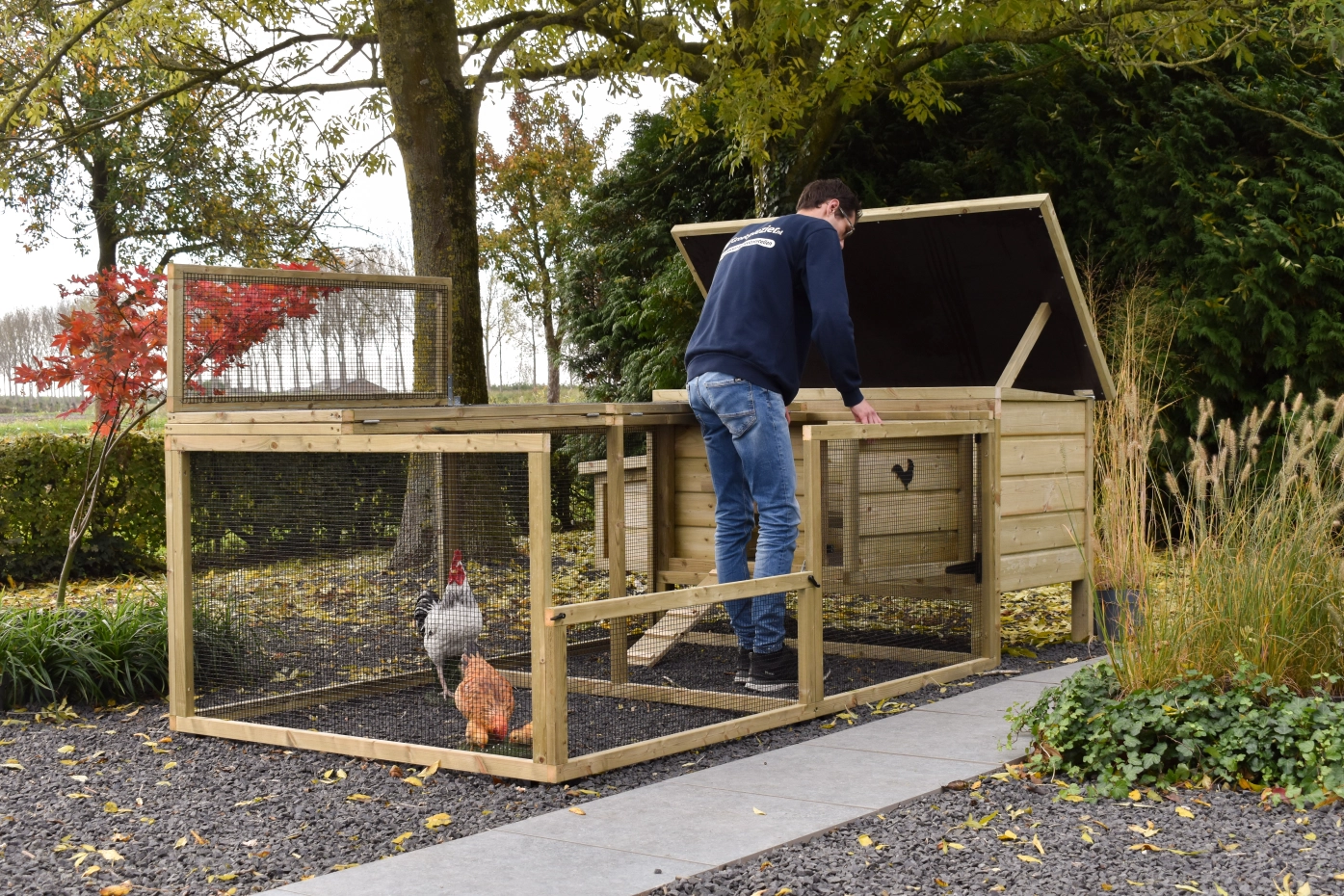 Dieser Hühnerstall verfügt seitlich über ein praktisches Legenest mit einem aufklappbaren Dach, das offen stehen bleiben kann, sowie einer herausnehmbaren Bodenplatte – ideal für eine einfache Reinigung. Der geräumige Auslauf bietet Ihren Hühnern ausreichend Platz zum Scharren und aktiv bleiben. Dank des aufklappbaren Dachs und der Tür an der Vorderseite lässt sich auch der Stall selbst schnell reinigen. Die schwarzen Akzente verleihen Eggy eine charmante Ausstrahlung. Alles, was Ihre Hühner brauchen, in einem stilvollen Stall!
