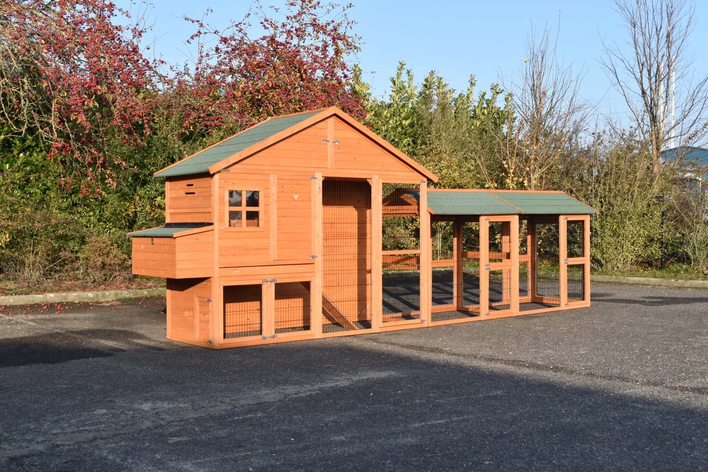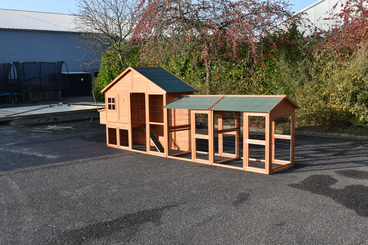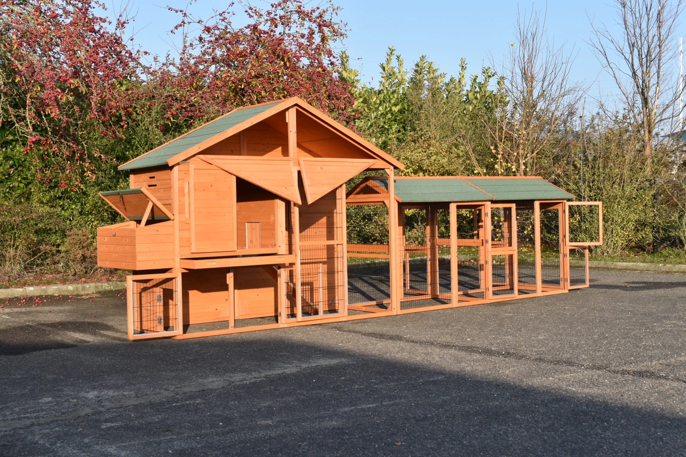 Große Hühnerstall Holiday Large ist ein schöne und praktische Stall mit ein Schlafraum und 2 Space Large Ausläufe. Der Stall ist auch ausgestattet mit ein Legenest. Diese schöne Stall ist ausgestattet mit viele Türen, der Schlafraum hat 2 Sitzstange. Oben der Schlafraum befindet sich ein Stauraum. Der Schlafraum von der Holiday Large ist geeignet für ca. 4-10 Hühner.