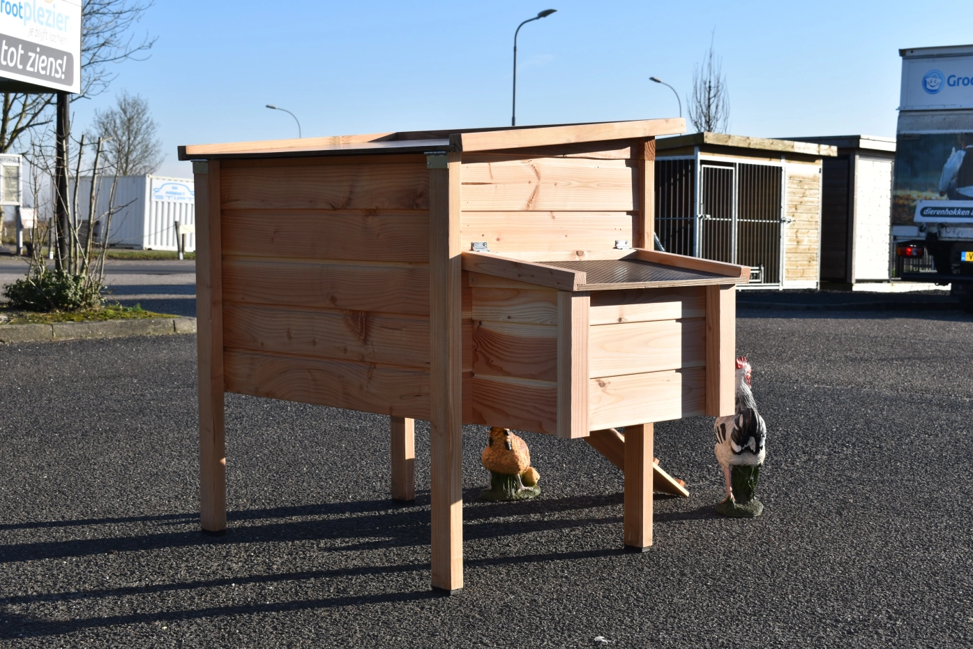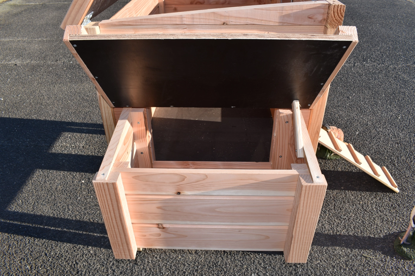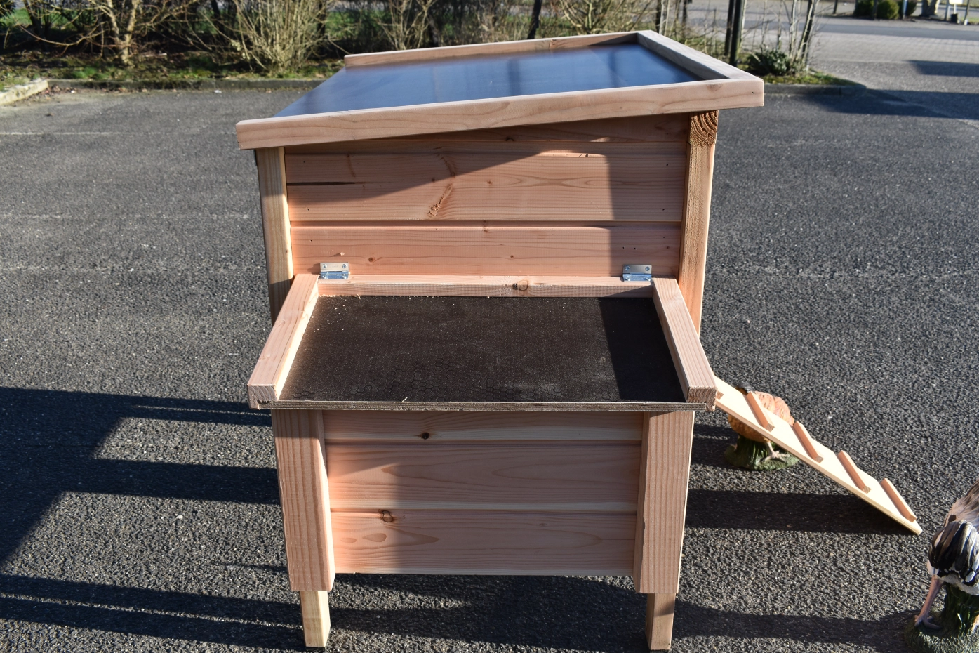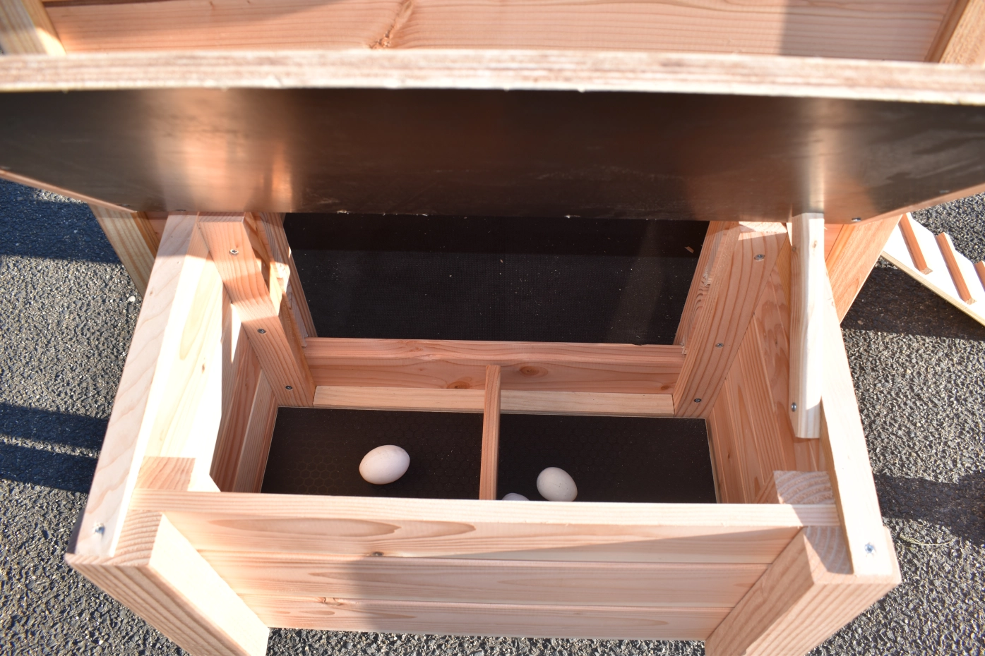 - Dieser Hühnerstall ist mit einem Legenest ausgestattet.