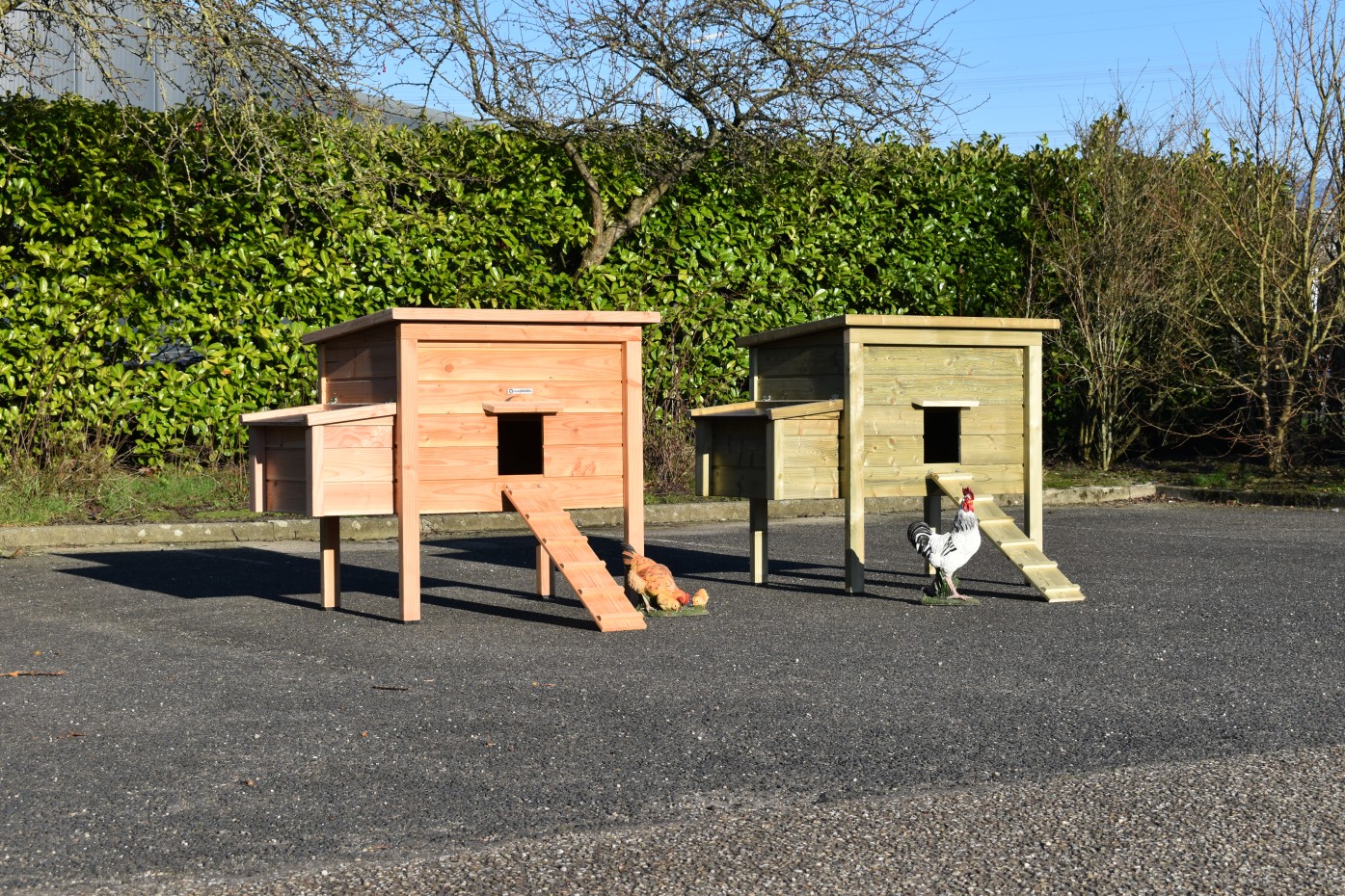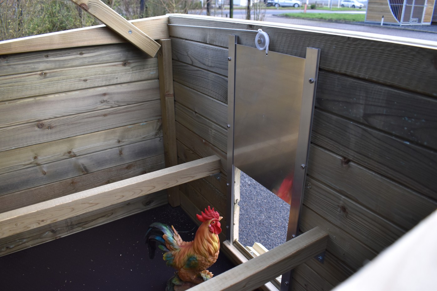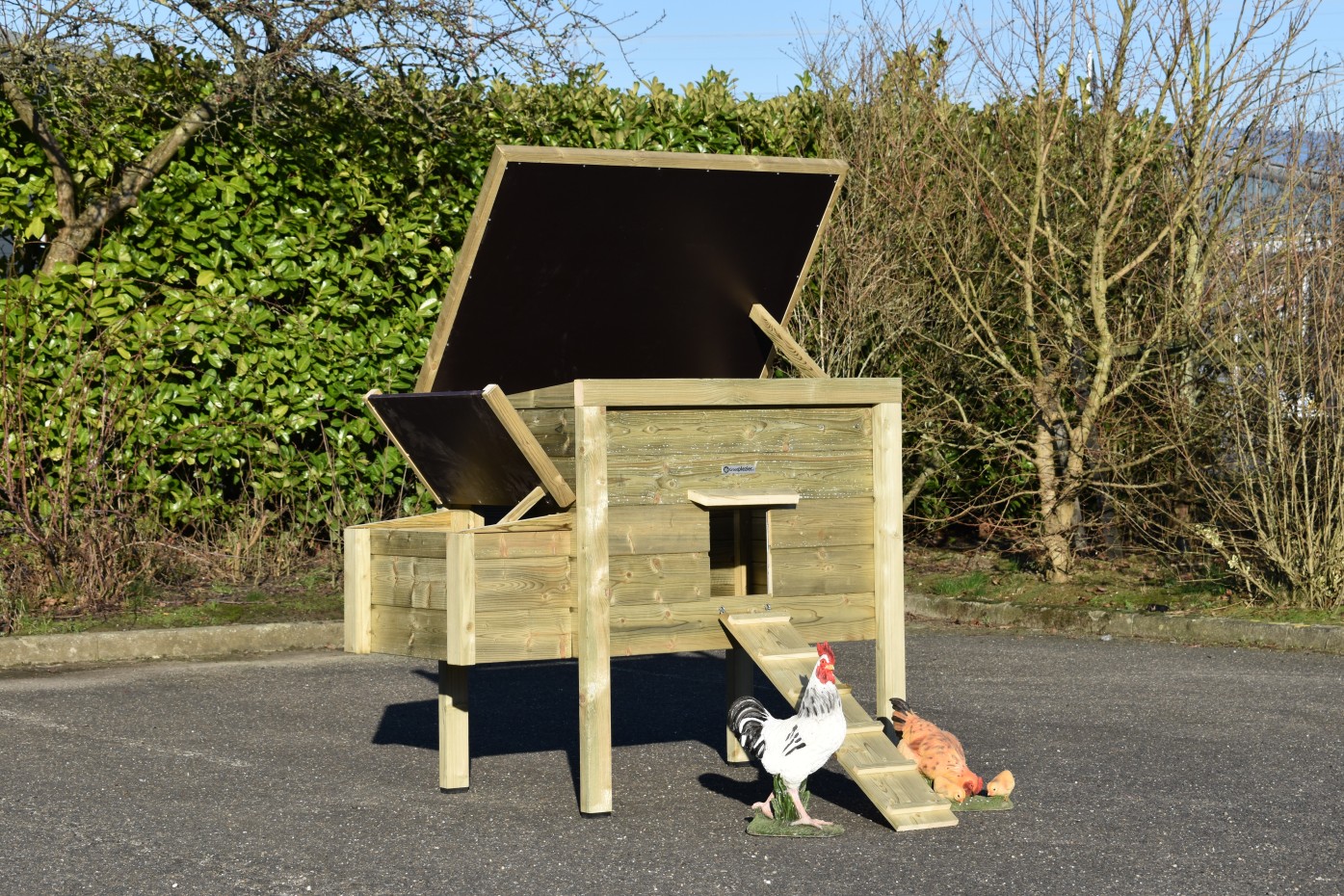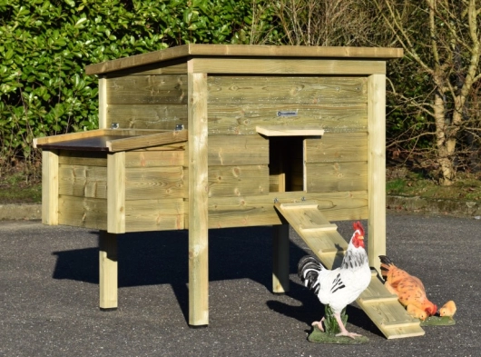 - Dieser Hühnerstall ist mit einem Legenest ausgestattet.