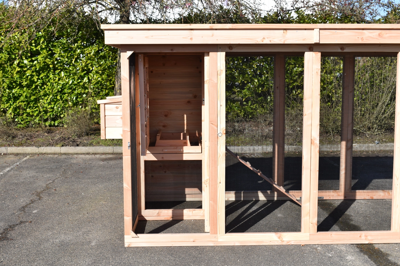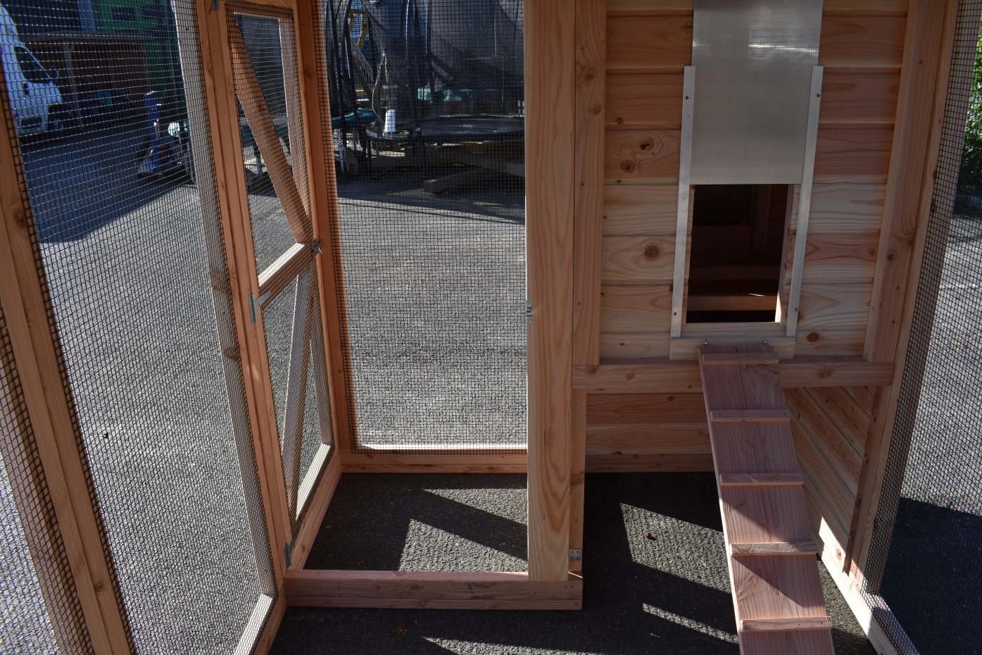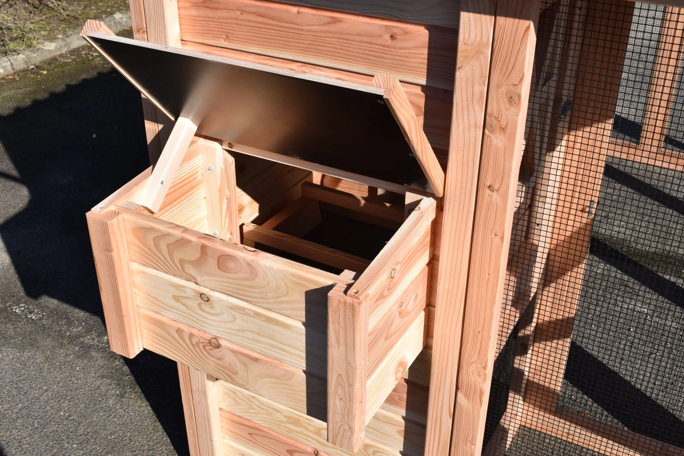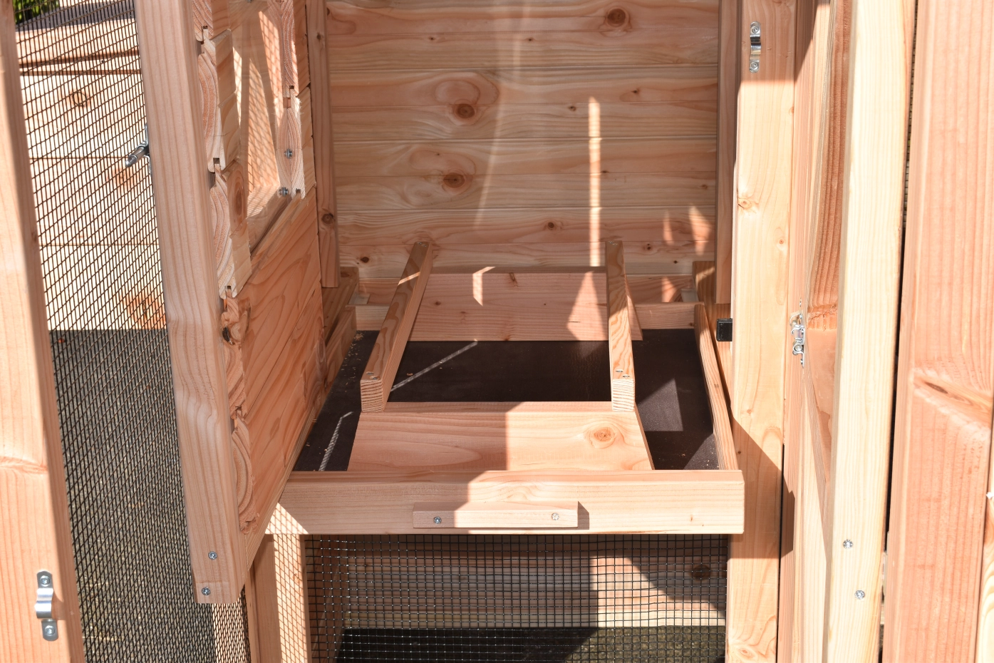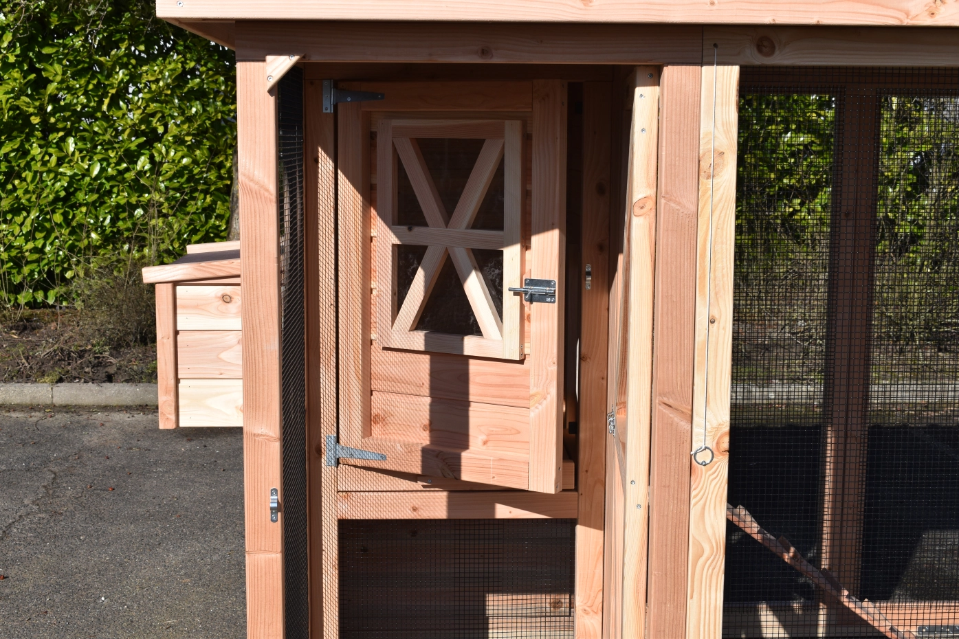 Auch ist den Hühnerstall immer gut erreichbar durch die grosse Tür im Auslauf. In diesem Auslauf gibt es auch eine Hühnerklappe. Sehr praktisch wenn Sie einen Hahn haben! Der Schlafraum hat ein Schublade, so dass der Stall einfach zu reinigen ist.