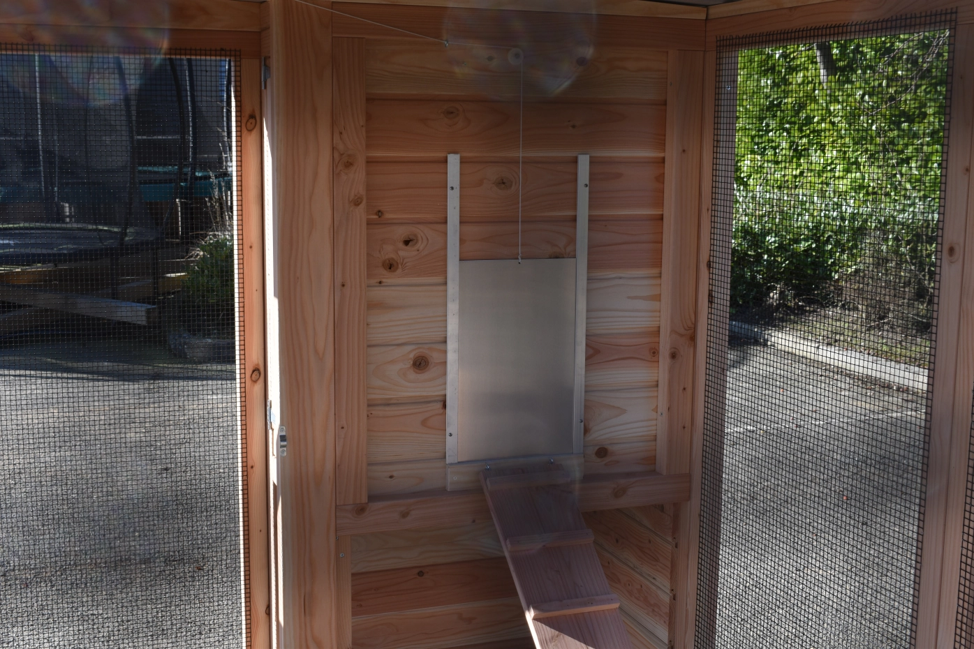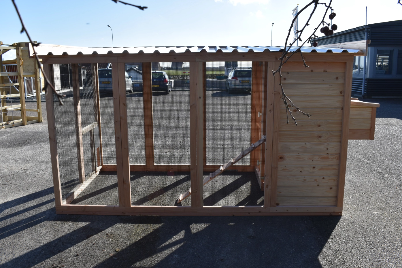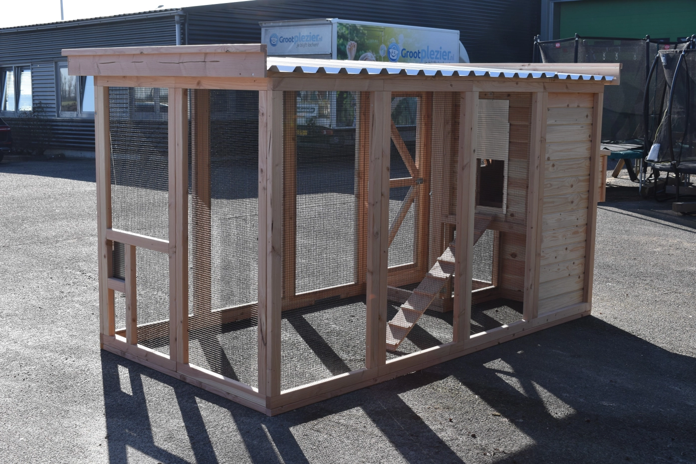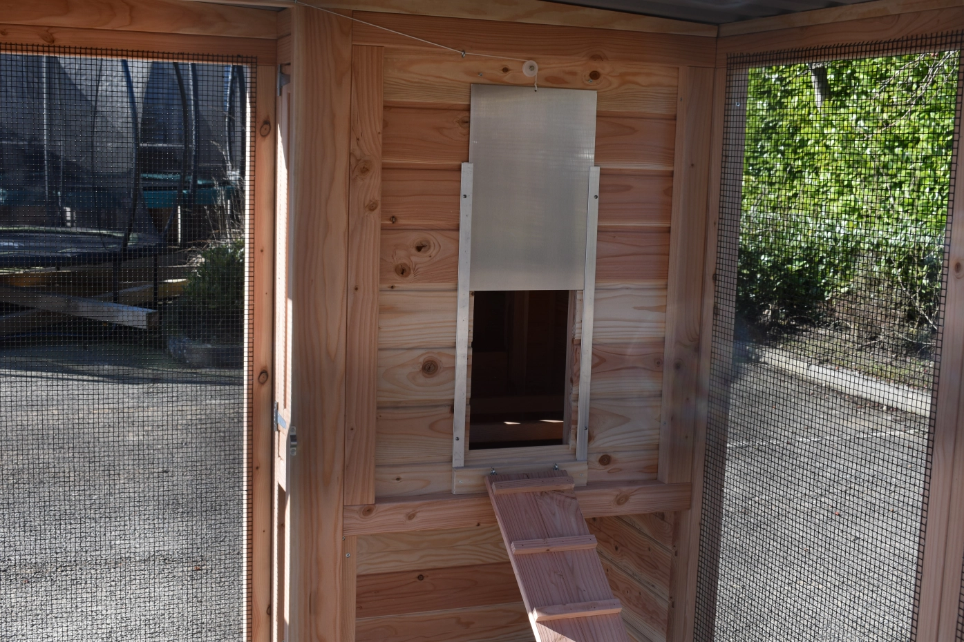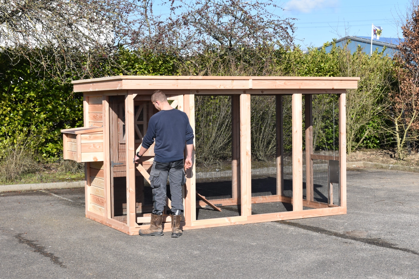 Auch ist den Hühnerstall immer gut erreichbar durch die grosse Tür im Auslauf. In diesem Auslauf gibt es auch eine Hühnerklappe. Sehr praktisch wenn Sie einen Hahn haben! Der Schlafraum hat ein Schublade, so dass der Stall einfach zu reinigen ist.