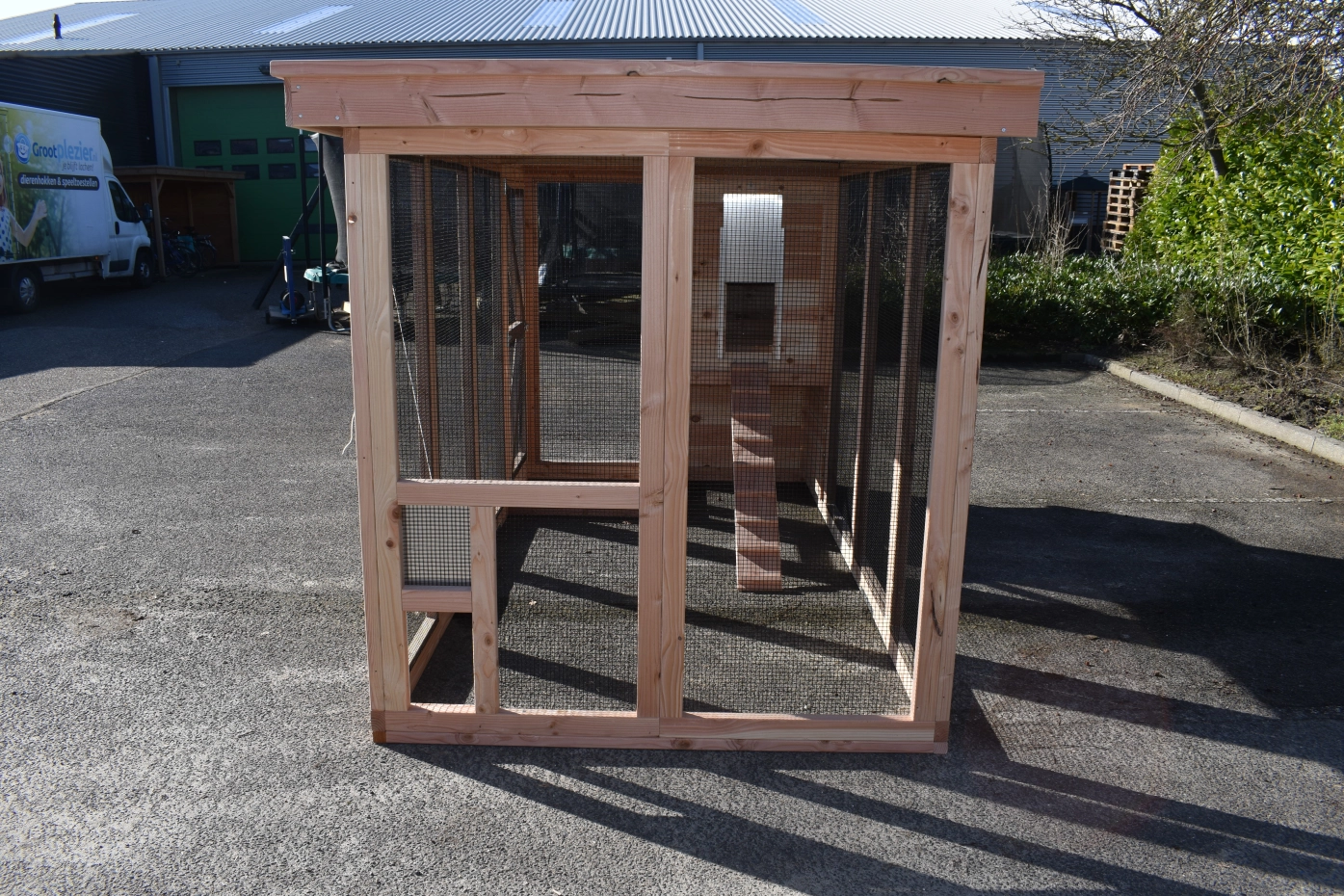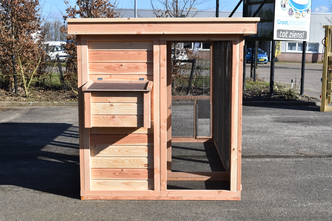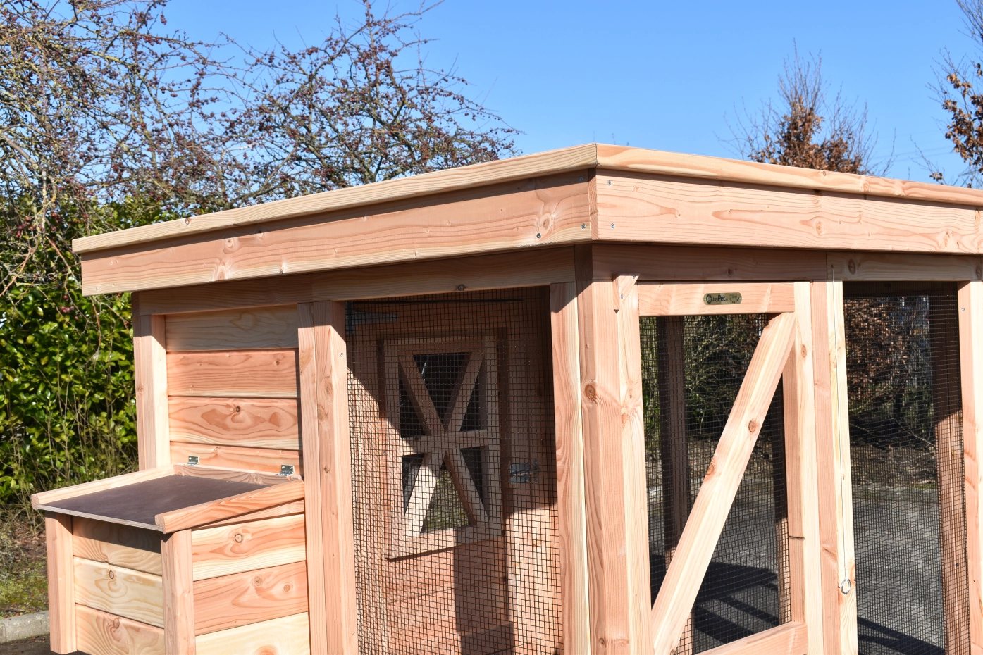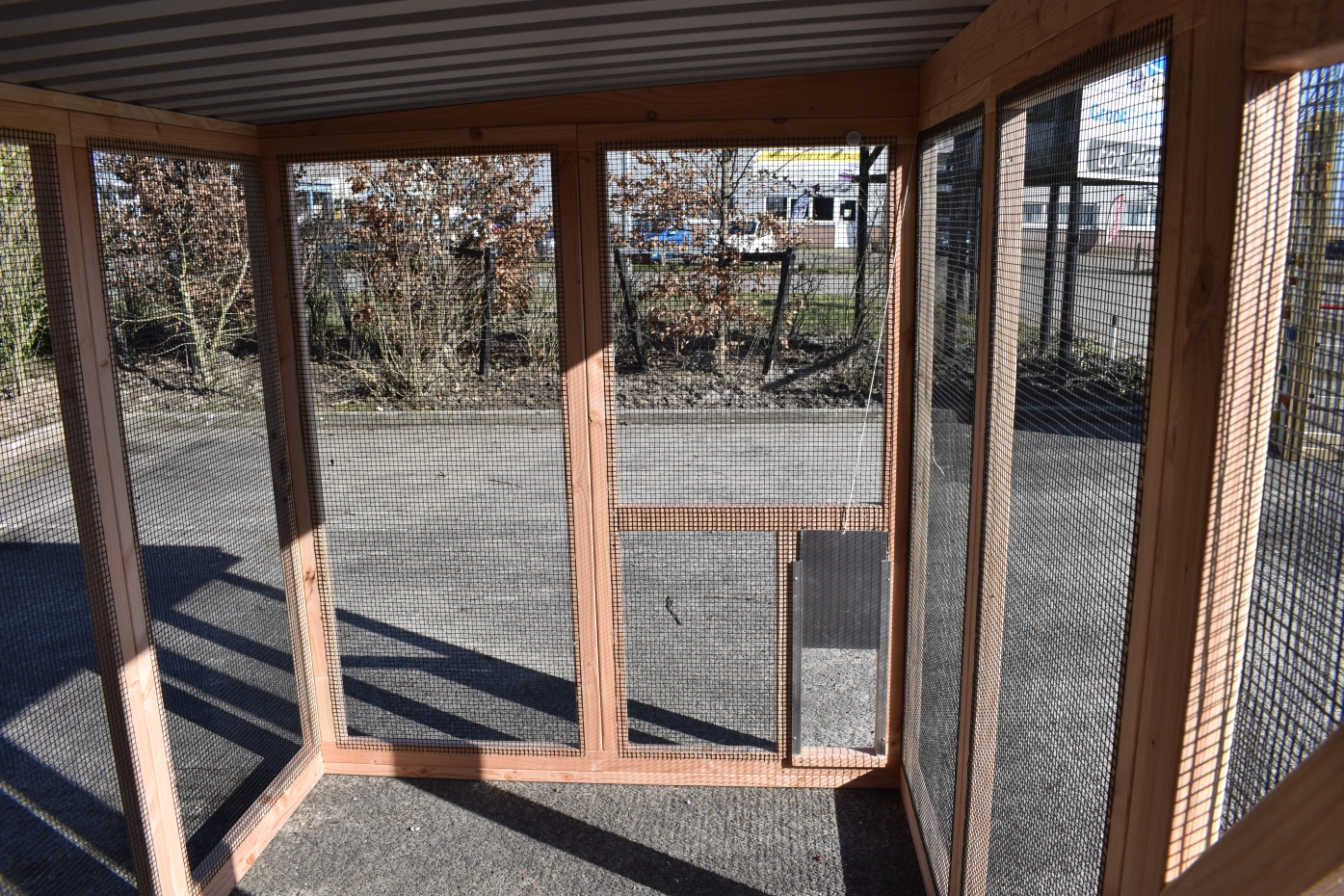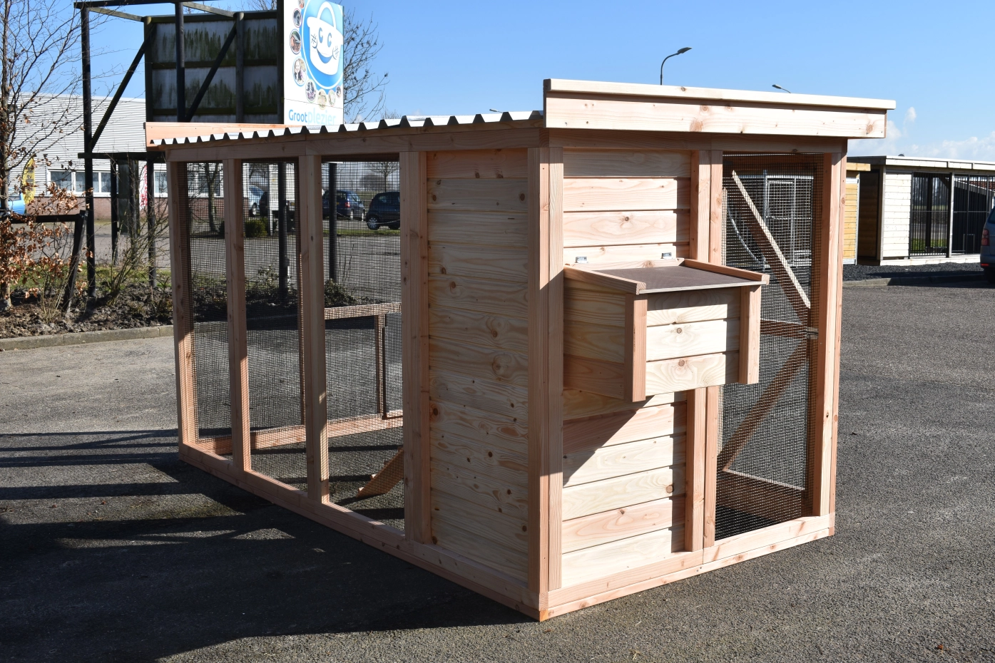 Auch ist den Hühnerstall immer gut erreichbar durch die grosse Tür im Auslauf. In diesem Auslauf gibt es auch eine Hühnerklappe. Sehr praktisch wenn Sie einen Hahn haben! Der Schlafraum hat ein Schublade, so dass der Stall einfach zu reinigen ist.