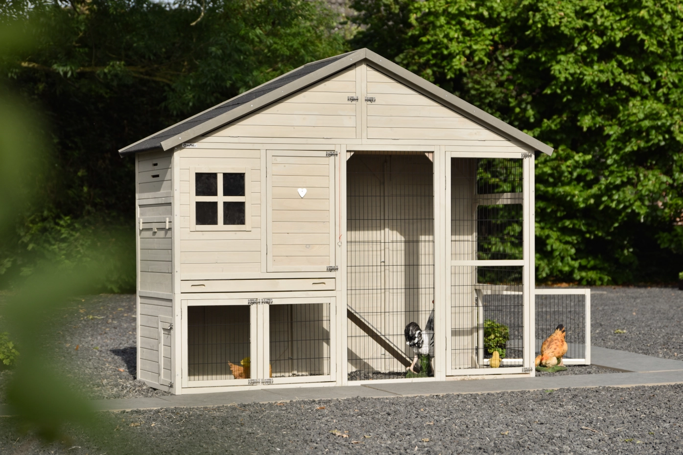 Der Holiday Hühnerstal ist ein fantastischer Hühnerstall mit geräumigen Türen überall. Auf der Holztür befindet sich standardmäßig ein weißes Herz, das aber durch ein hübsches Tiermotiv ersetzt werden kann.