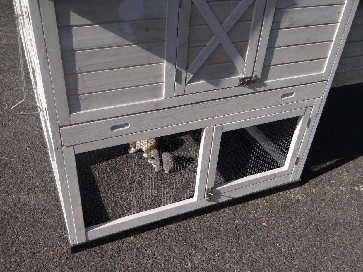 - Die Türen dieses Kaninchenstalls sind mit doppelten Schieberiegeln ausgestattet