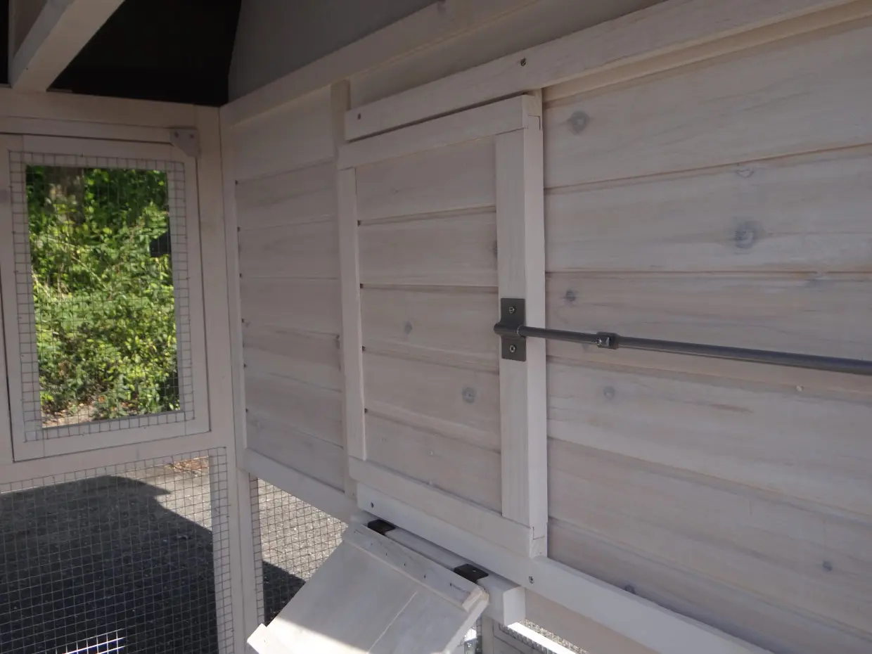 - Dieser Hühnerstall ist mit einem Legenest ausgestattet.