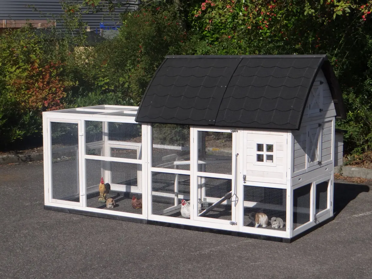 - Um diesen Stall mit einem Auslauf zu kombinieren, muss eine Tür oder ein Gitterteil entfernt werden.