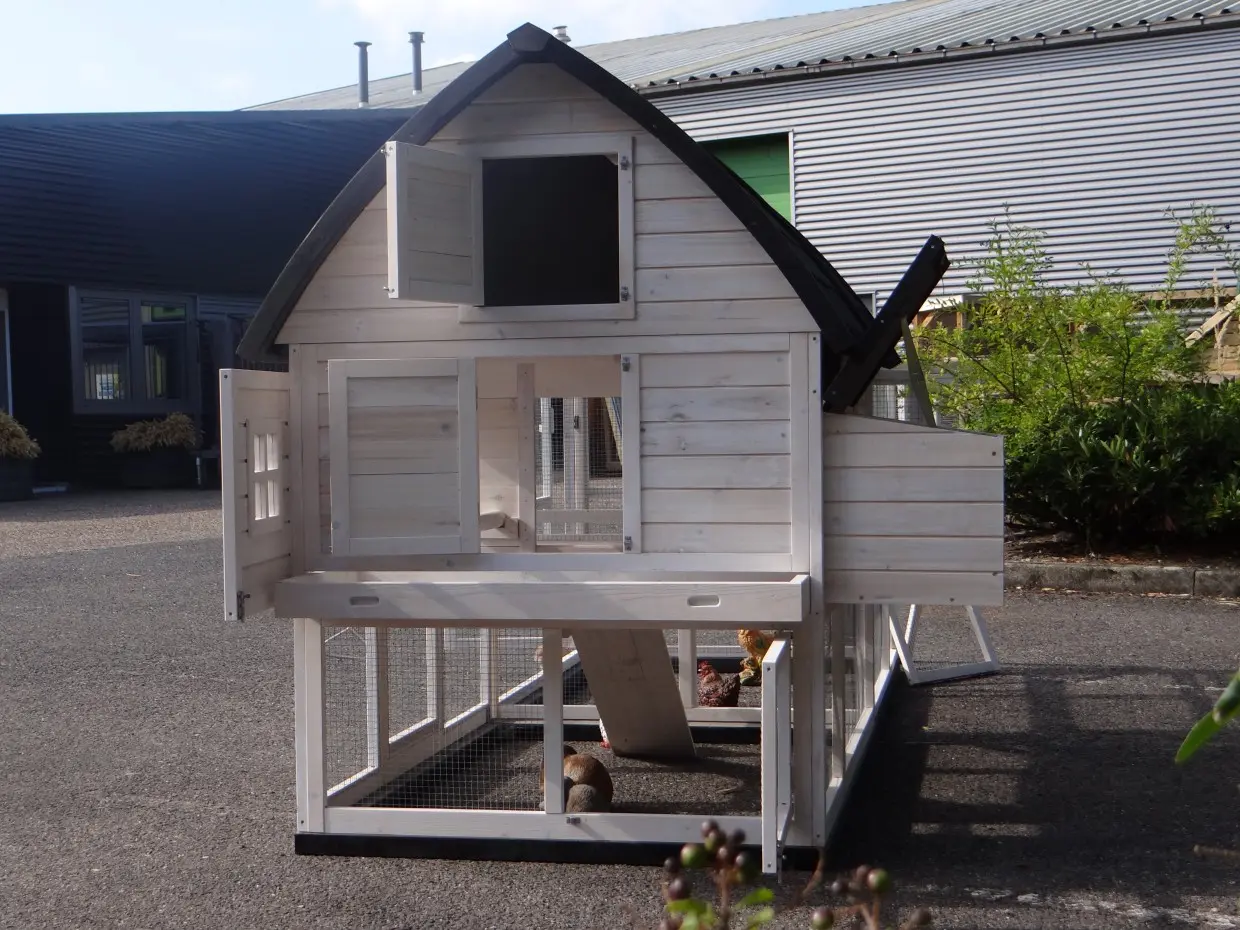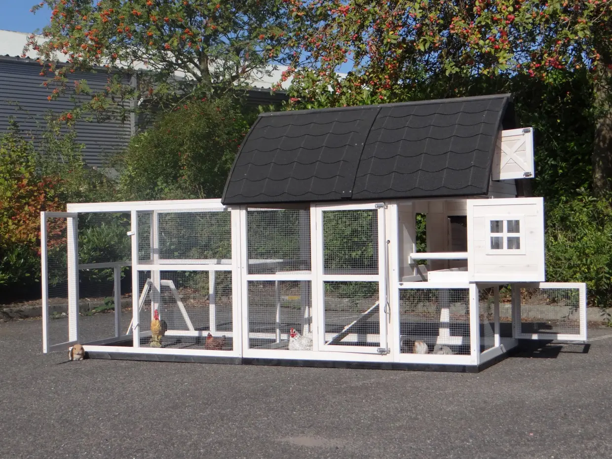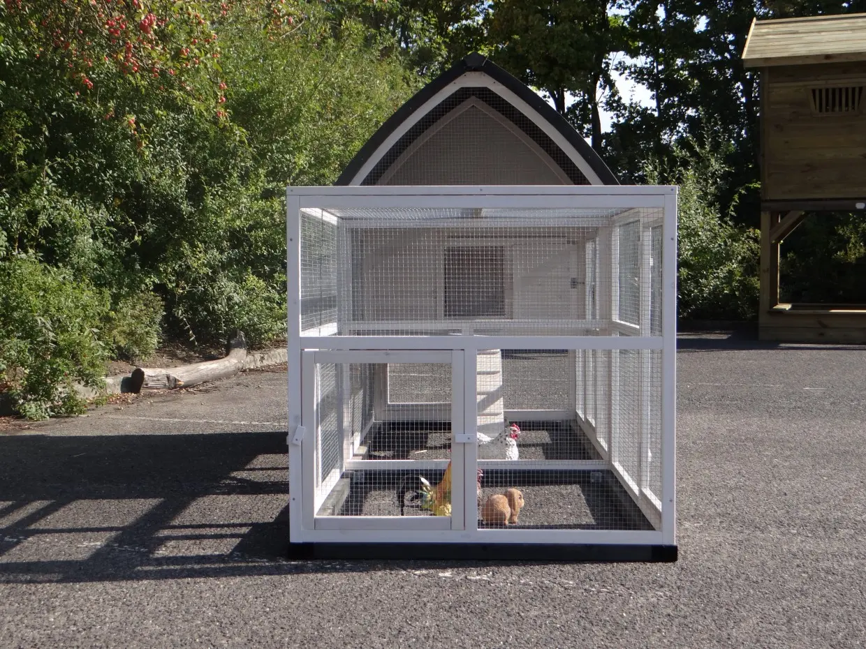 Hühnerstall Kathedraal de Luxe Large ist ein besonders schöner und praktischer großer Tierstall mit Schlafabteil, Legenest und großzügigem Auslauf.
