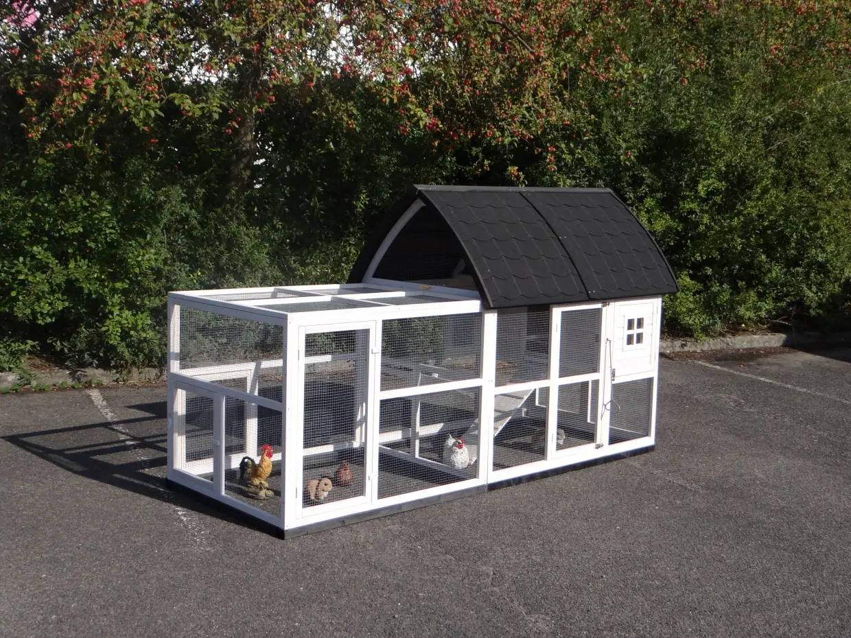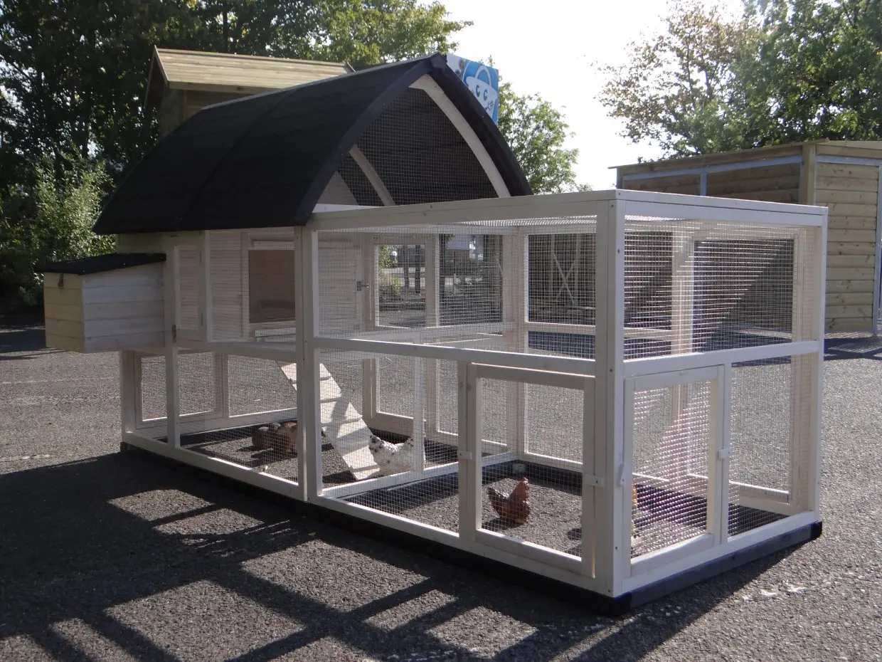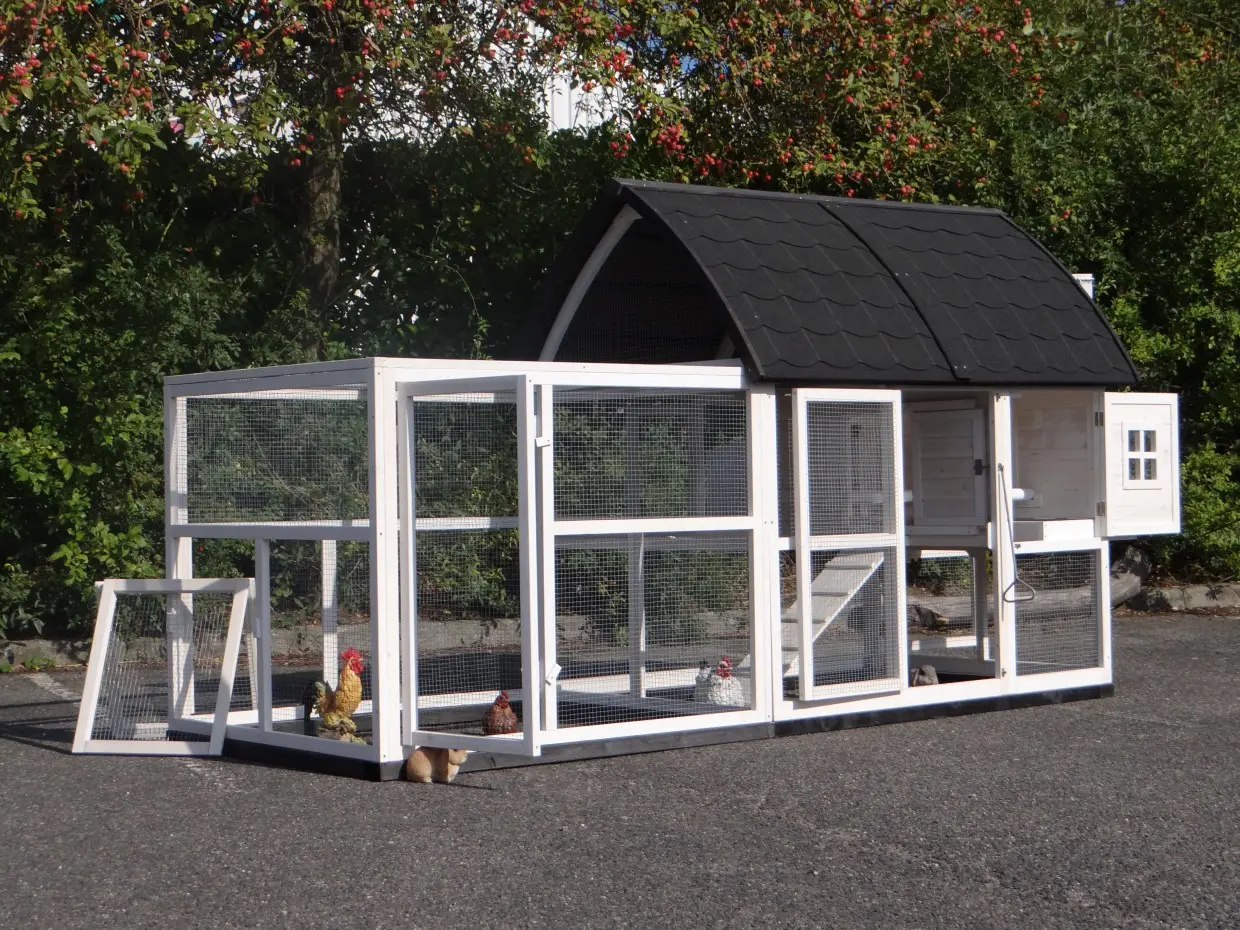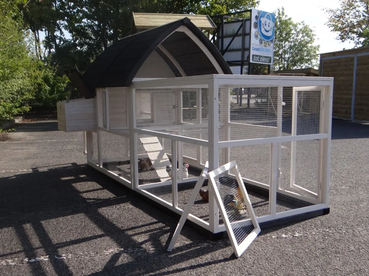 Hühnerstall Kathedraal de Luxe Large ist ein besonders schöner und praktischer großer Tierstall mit Schlafabteil, Legenest und großzügigem Auslauf.