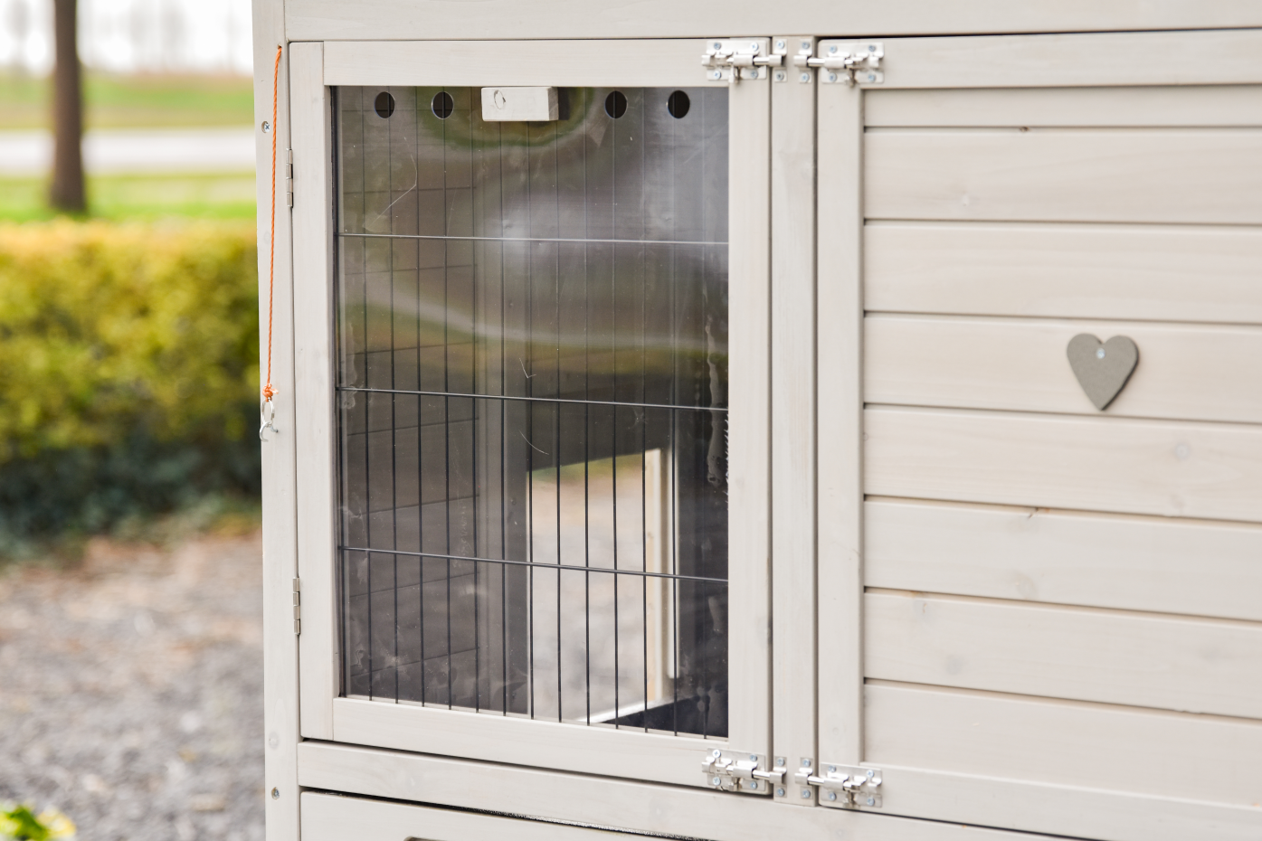 - Die Türen dieses Kaninchenstalls sind mit doppelten Schieberiegeln ausgestattet