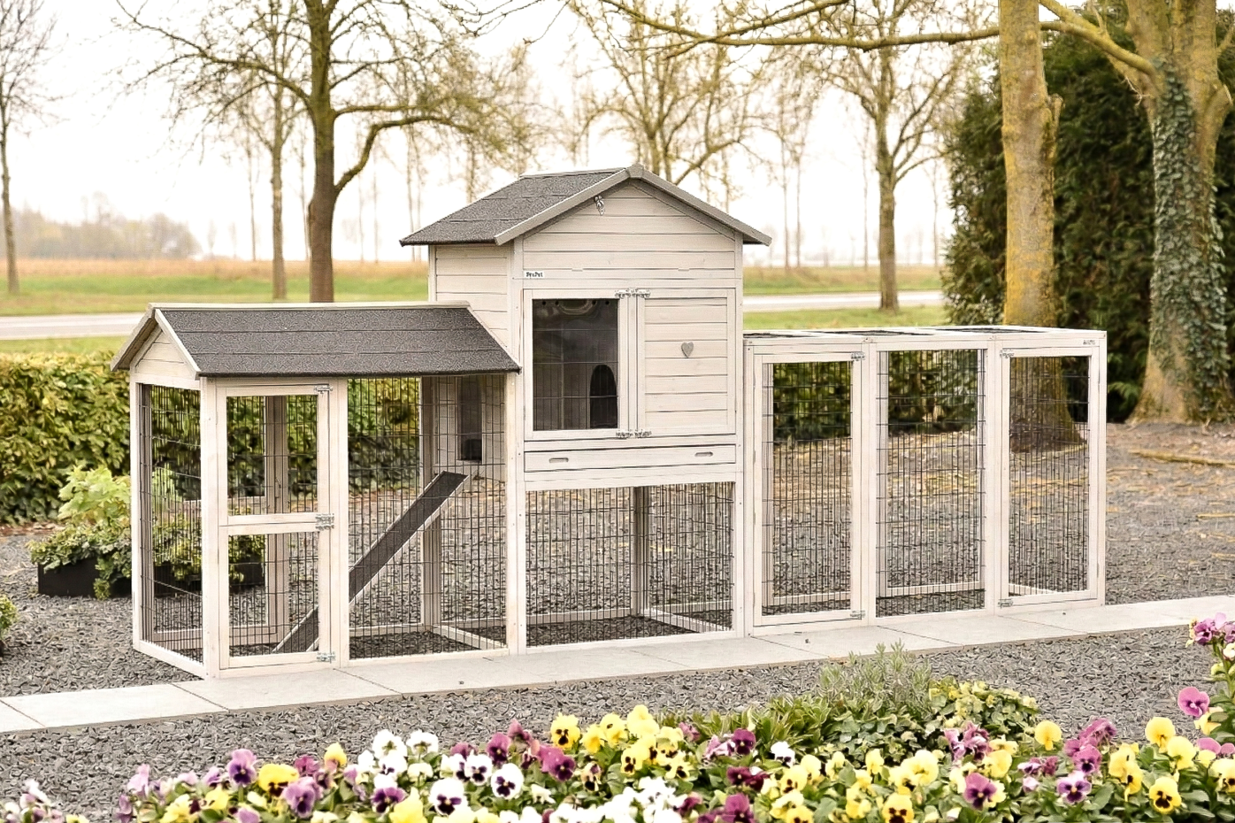 Der Stall ist mit zwei Anbauläufen ausgestattet: einer mit Dachpappe und einer mit Gitterdach, sodass Ihre Hühner sowohl geschützt als auch im Freien bleiben können