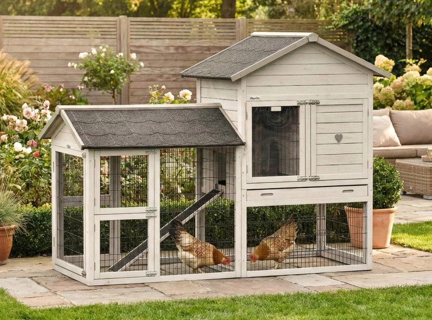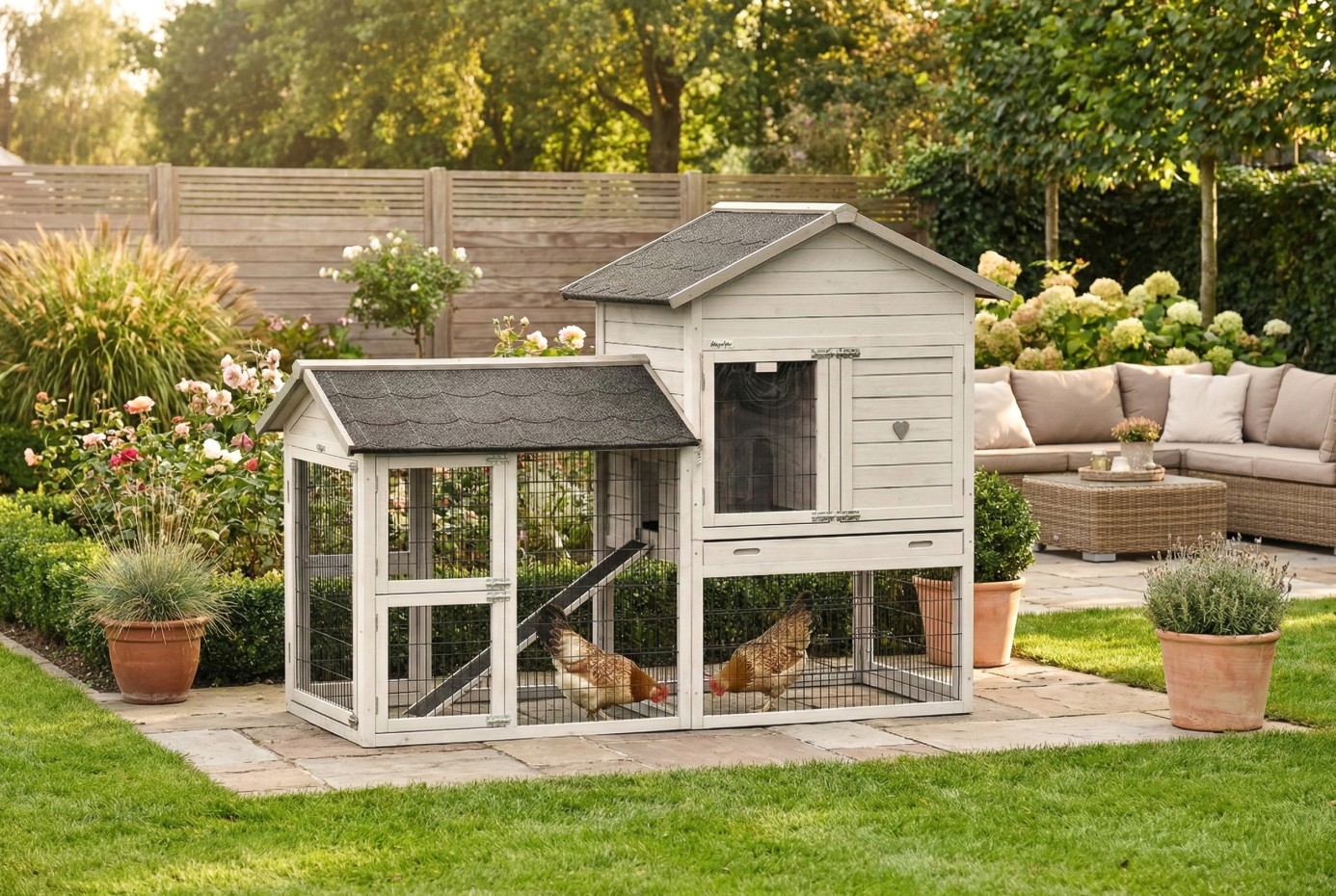 Der Stall ist sauber verarbeitet und verfügt über mehrere Türen, eine praktische herausziehbare Schublade, ein großzügiges Schlafabteil und einen geräumigen Anbauauslauf.