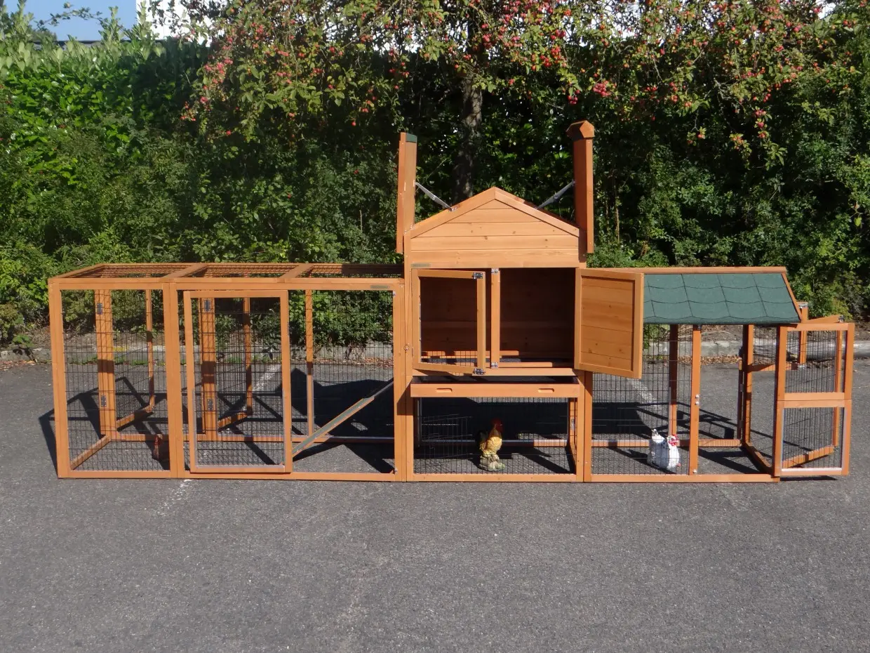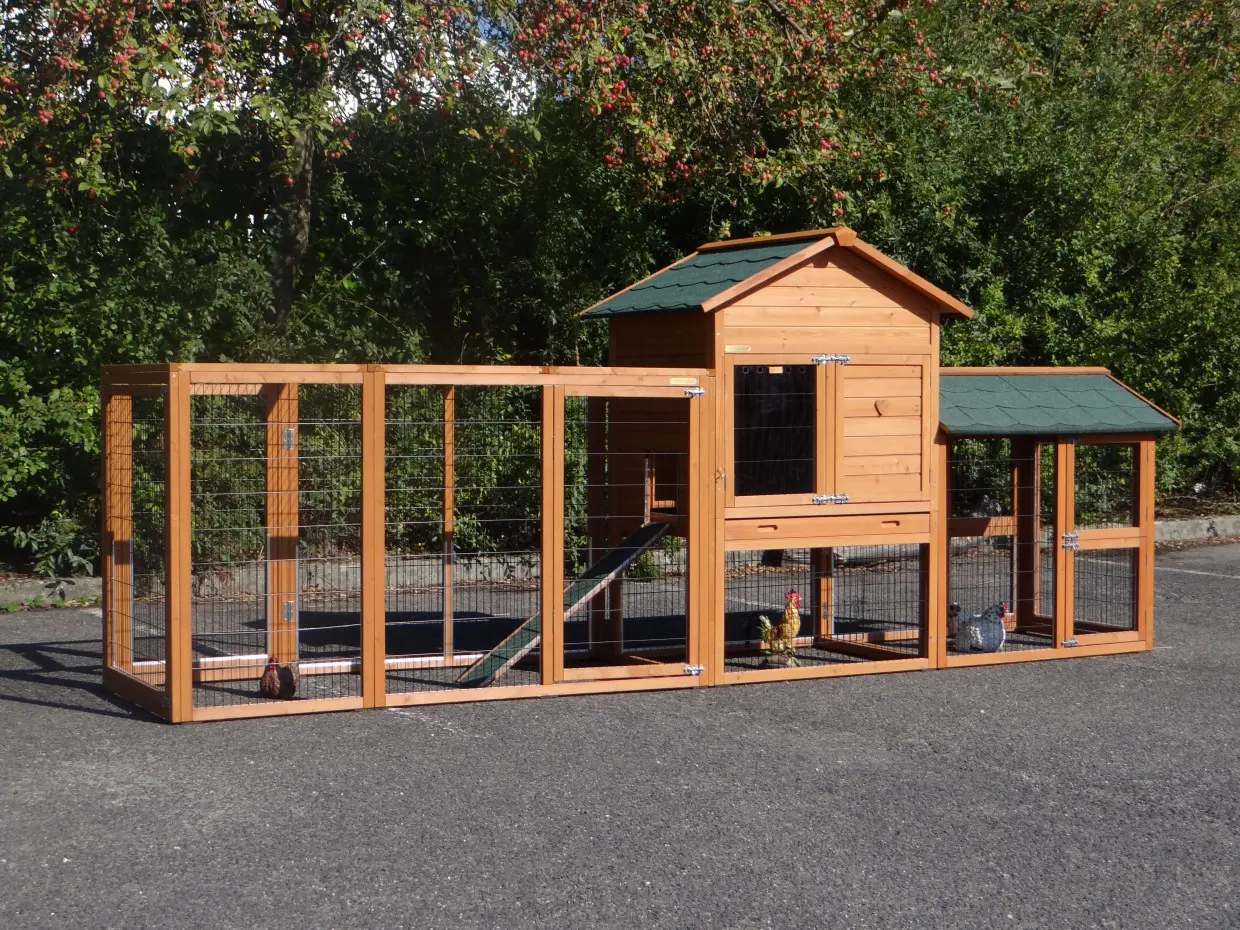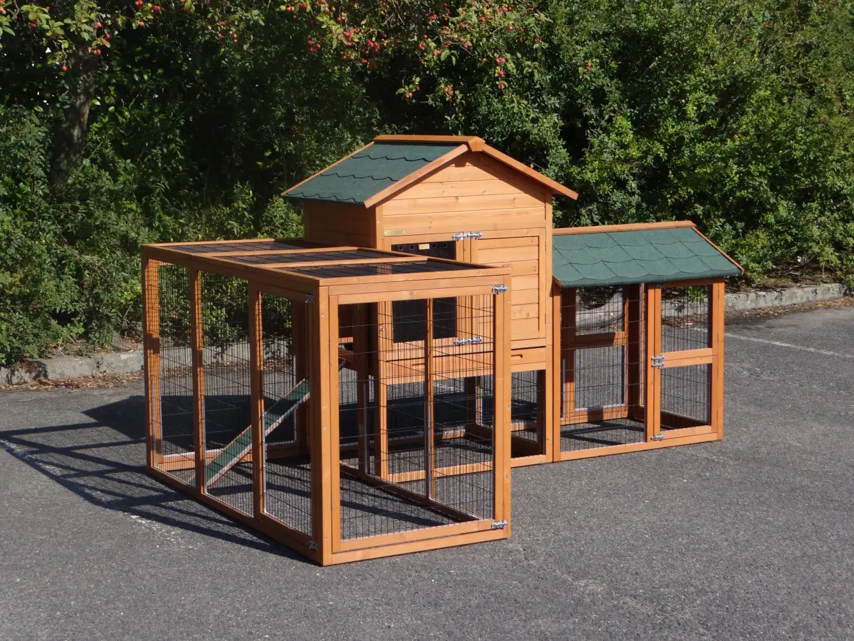 Der Stall verfügt über zwei Ausläufe, eine herausziehbare Schublade, die die Reinigung besonders einfach macht, ein Schlafabteil mit zwei Sitzstangen sowie einen praktischen Stauraum, in dem Futter und Zubehör aufbewahrt werden können.