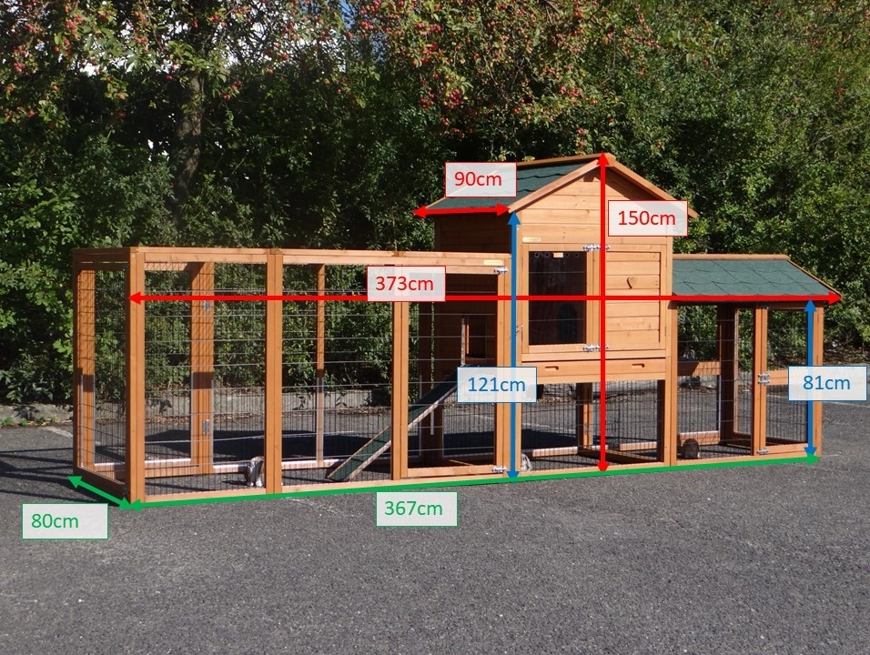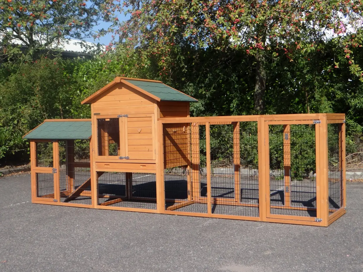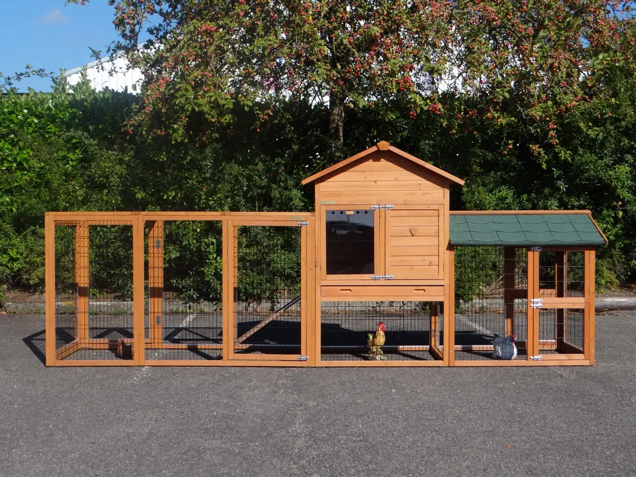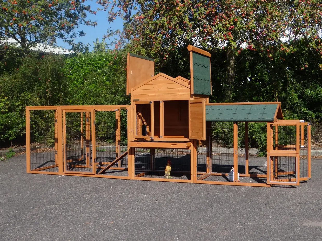Der Stall verfügt über zwei Ausläufe, eine herausziehbare Schublade, die die Reinigung besonders einfach macht, ein Schlafabteil mit zwei Sitzstangen sowie einen praktischen Stauraum, in dem Futter und Zubehör aufbewahrt werden können.