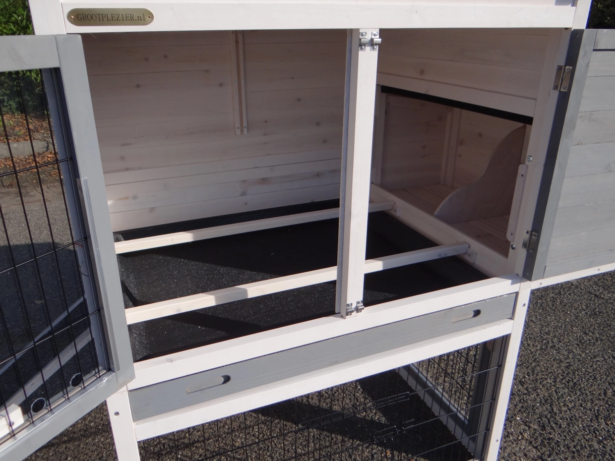 - Die Türen dieses Kaninchenstalls sind mit doppelten Schieberiegeln ausgestattet