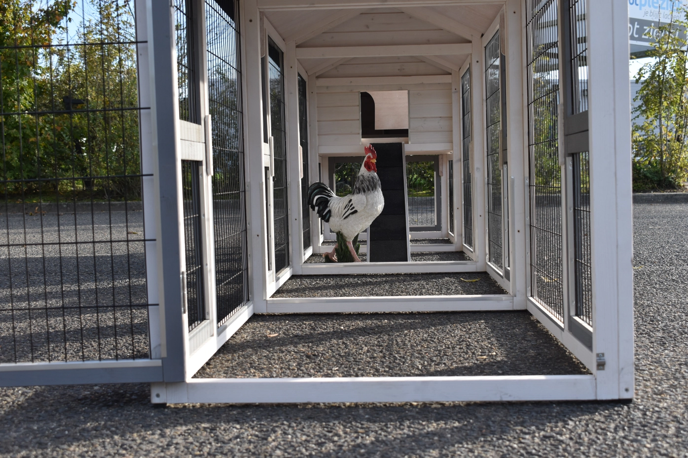 - Um diesen Stall mit einem Auslauf zu kombinieren, muss eine Tür oder ein Gitterteil entfernt werden.