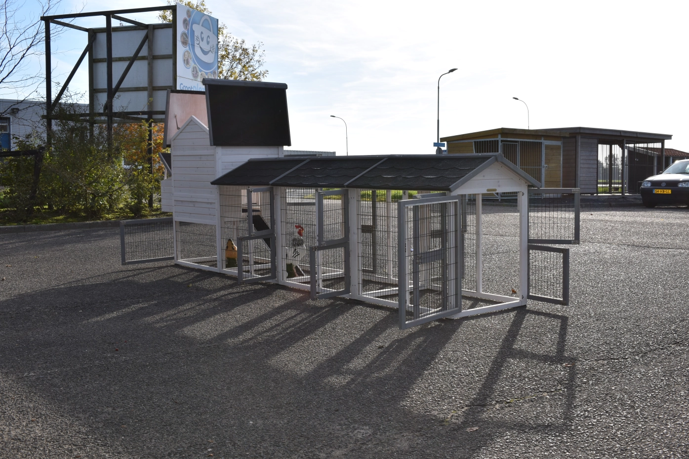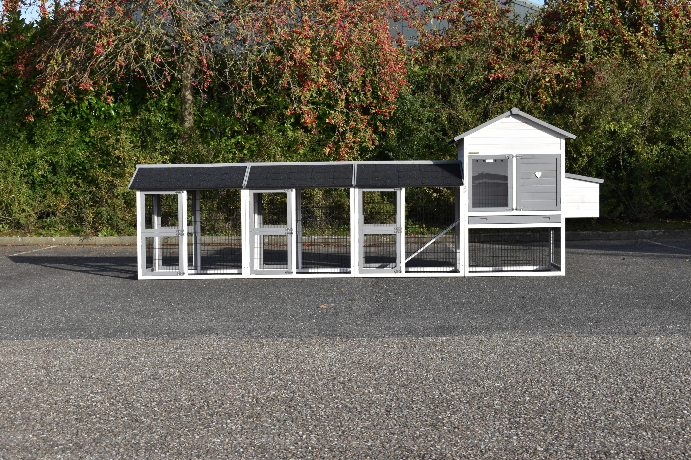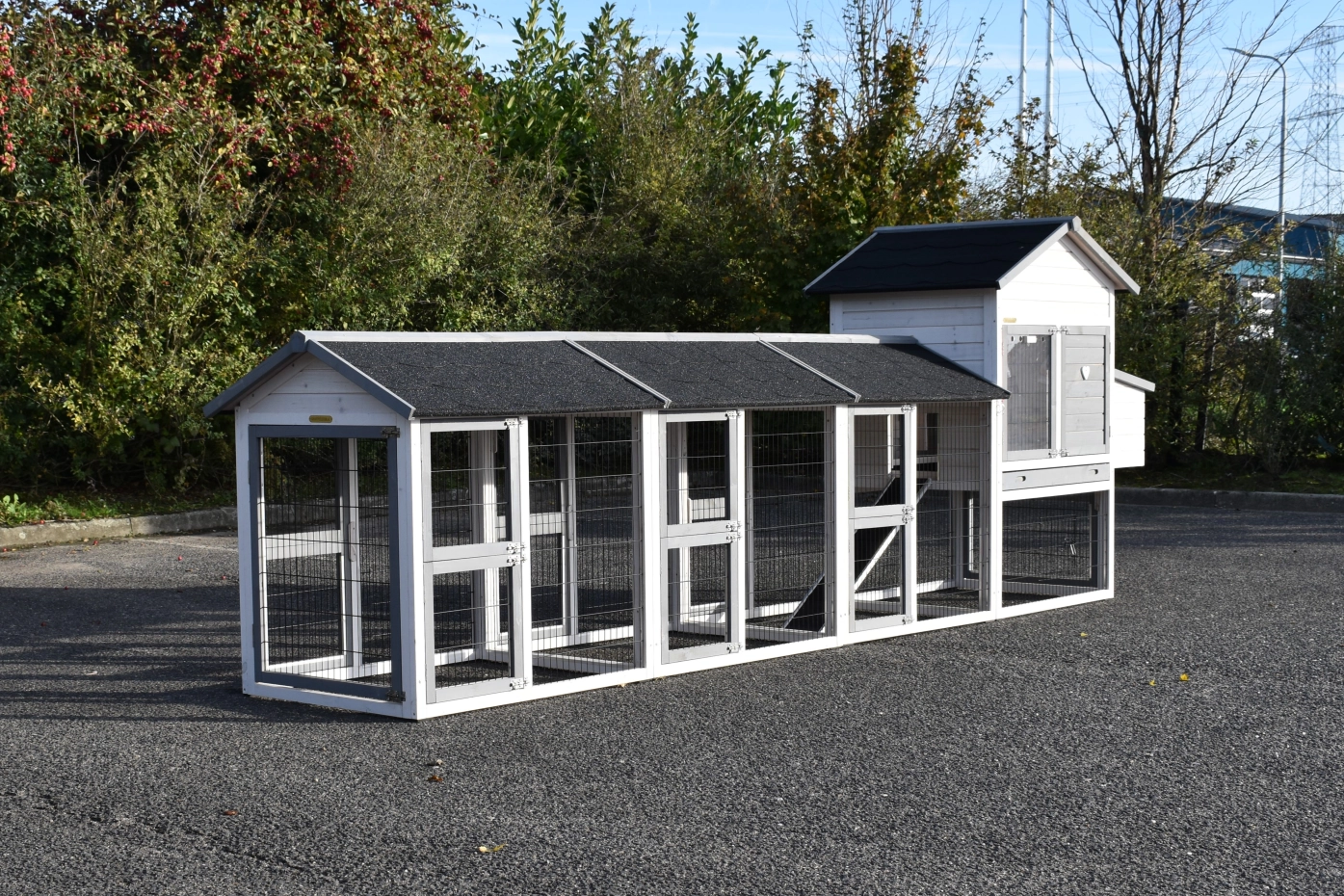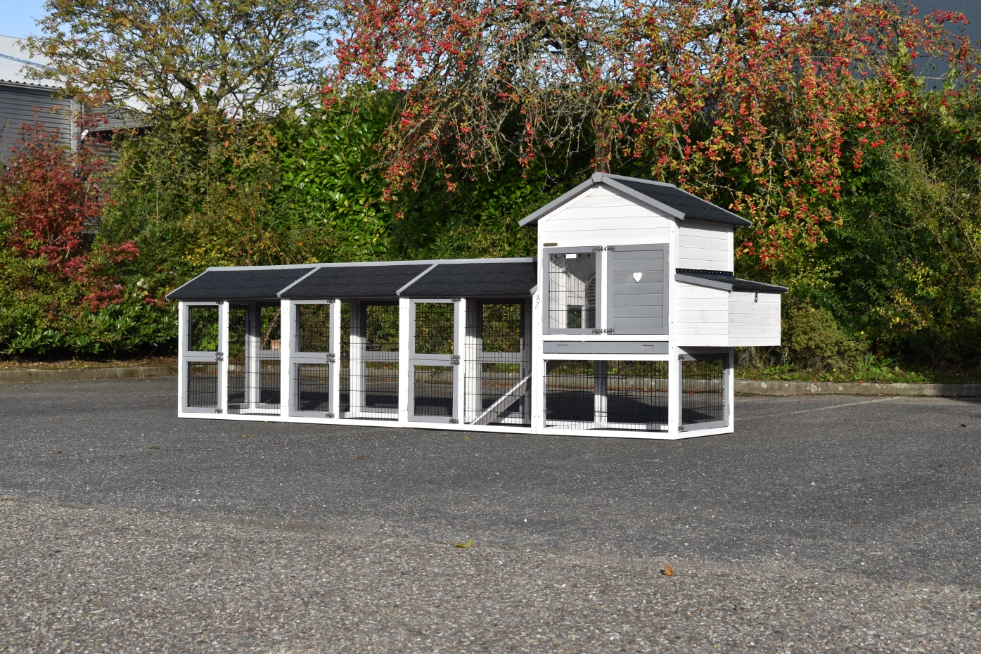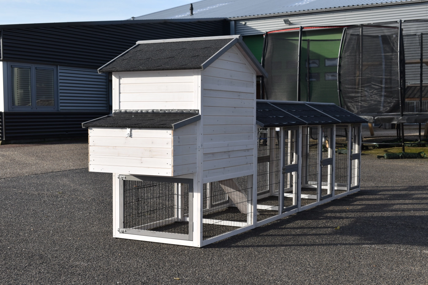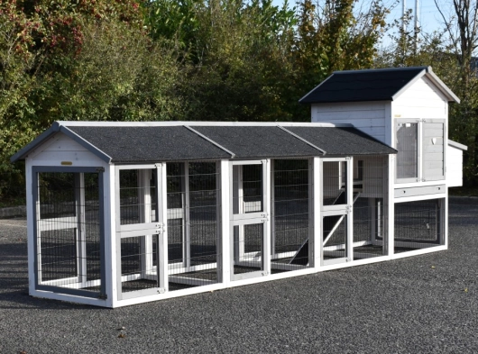 Hühnerstall Prestige Medium wurde mit drei Ausläufen und einem Legenest erweitert – ein wunderschöner Stall für Ihre Hühner.