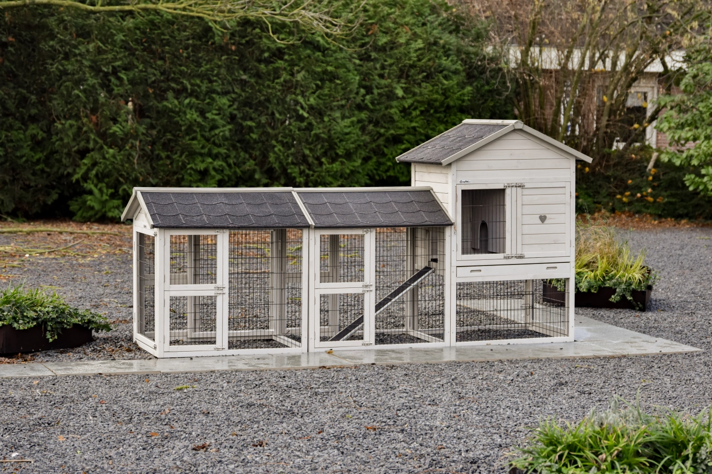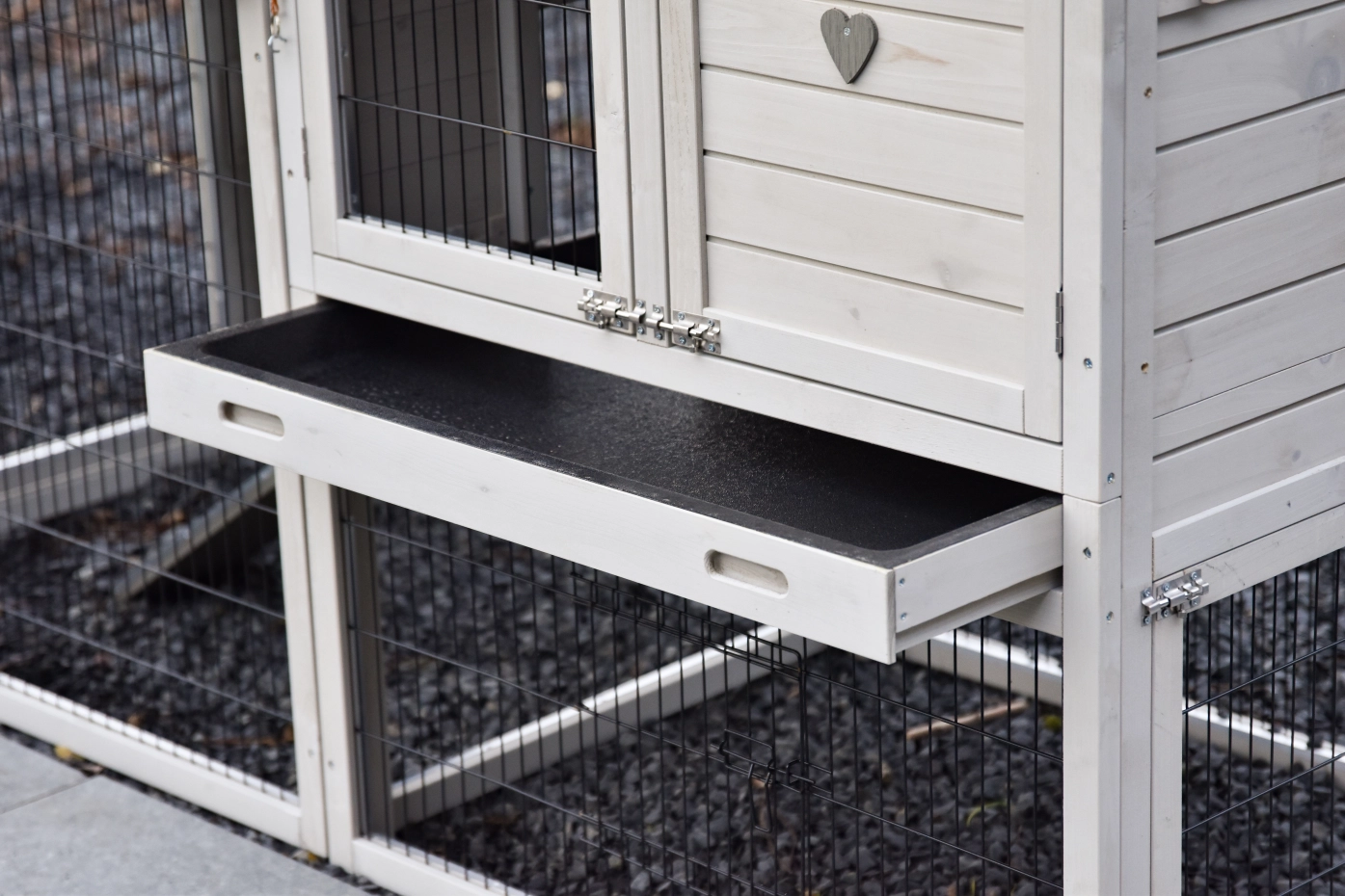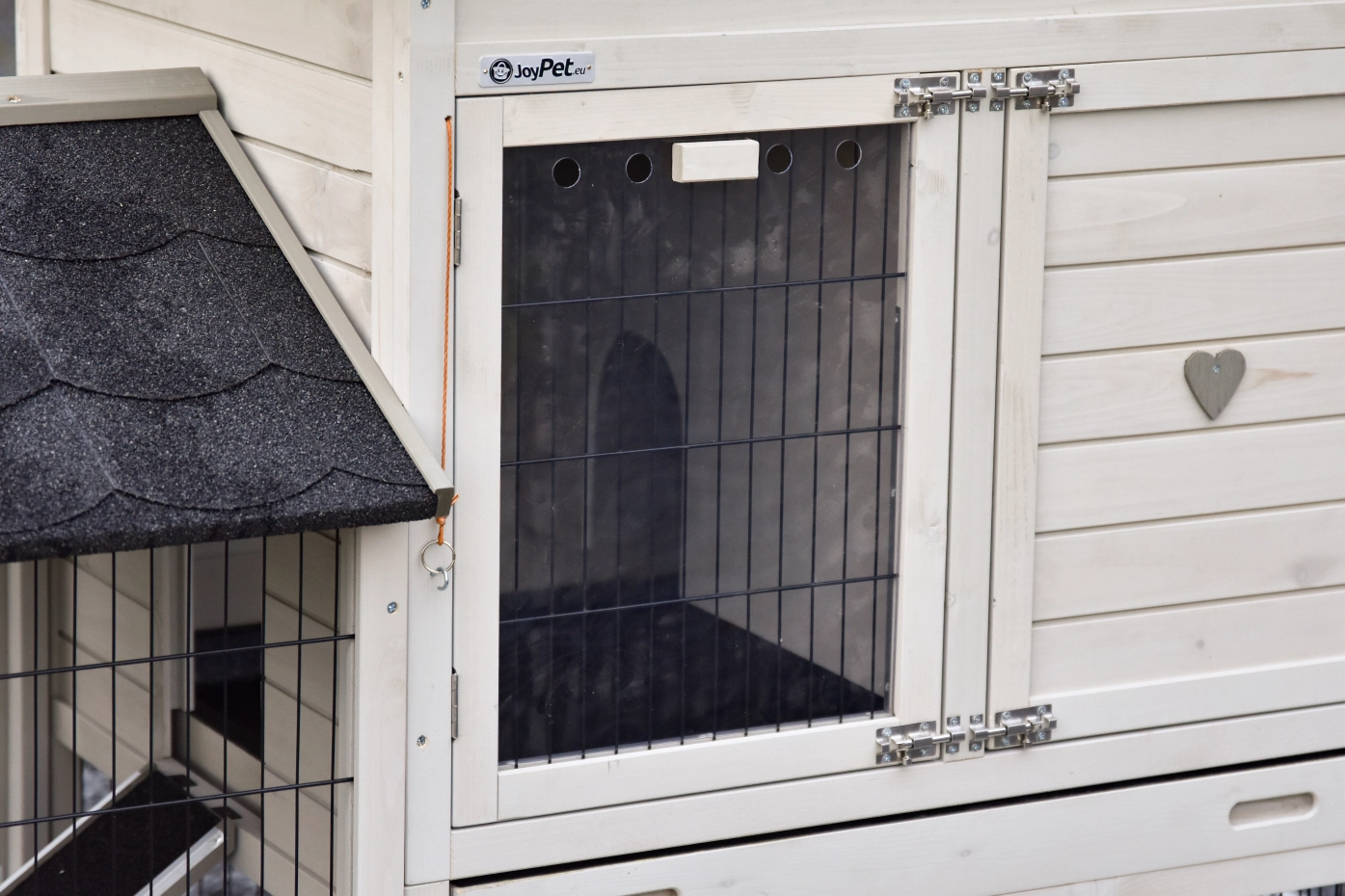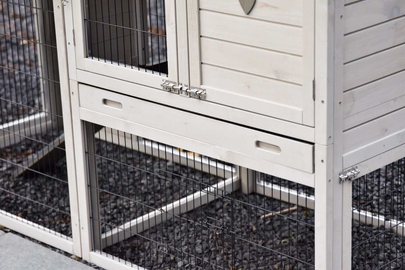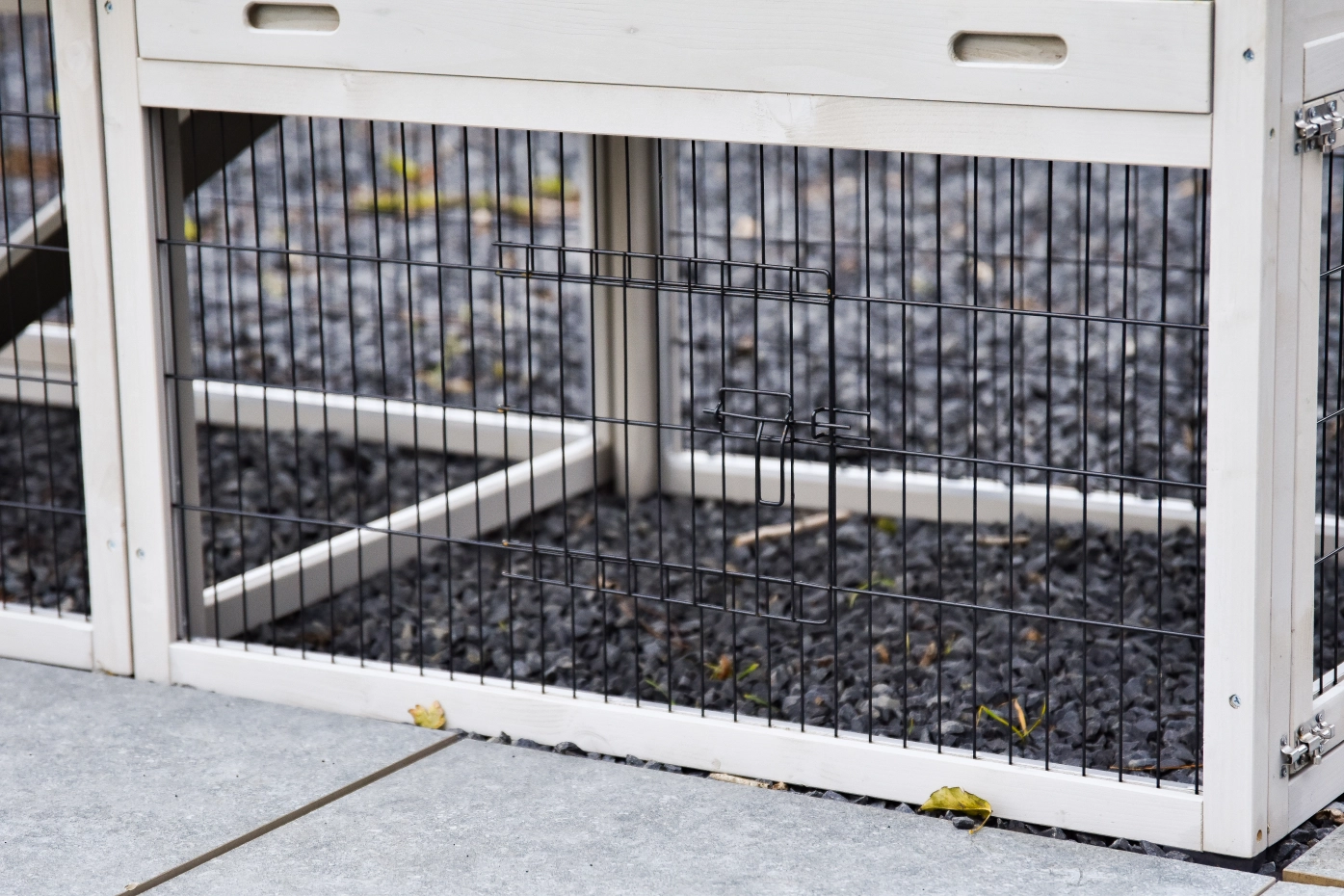 • Die Türen dieses Kaninchenstalls sind mit doppelten Schieberiegeln ausgestattet
