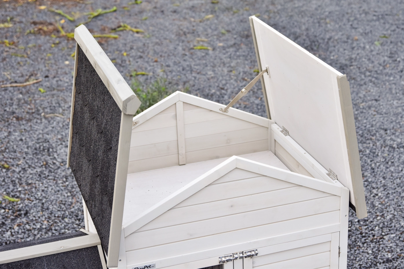 • Das Dach dieses Kaninchenstalls ist mit Dachpappe versehen.