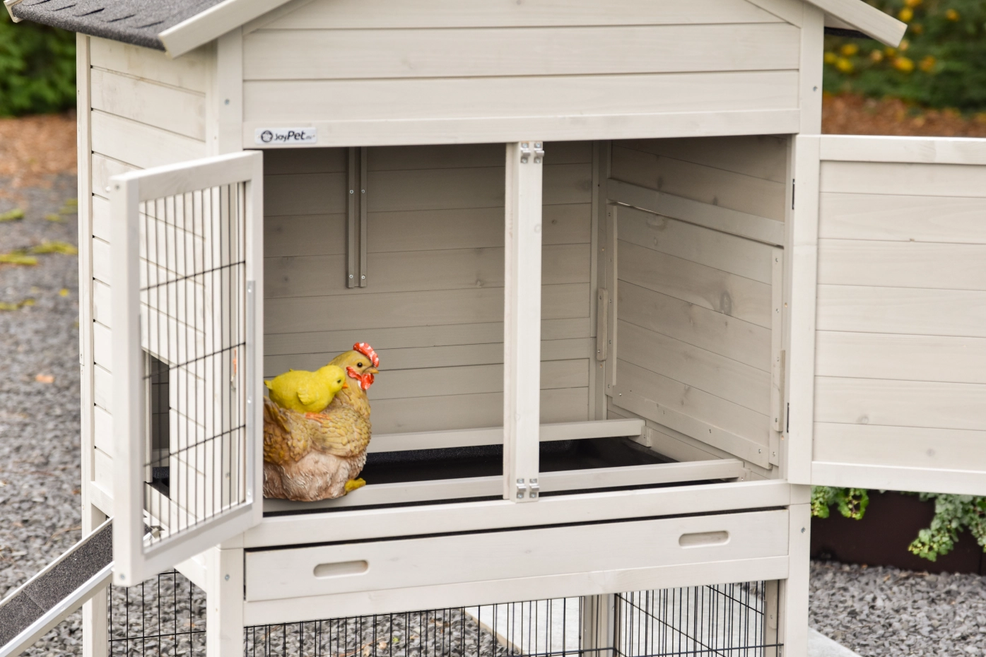 Dieser praktische Hühnerstall ist bis ins Detail hervorragend verarbeitet, mit großzügigen Türen und einem geräumigen Schlafabteil, das mit zwei Sitzstangen ausgestattet ist.