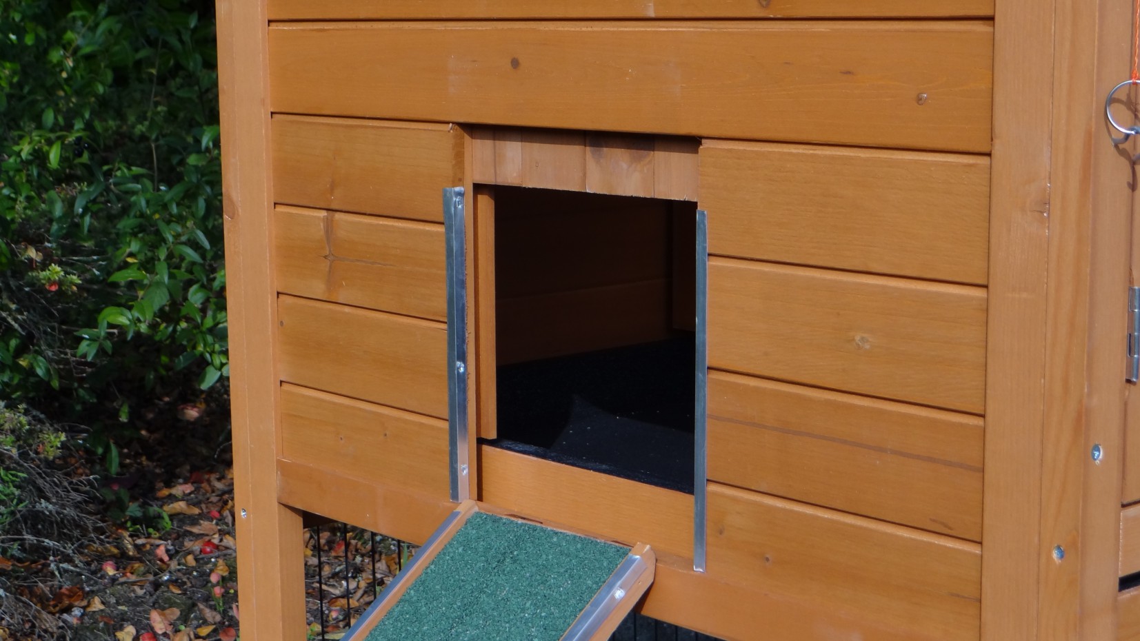 - Dieser Hühnerstall ist mit einem Legenest ausgestattet.