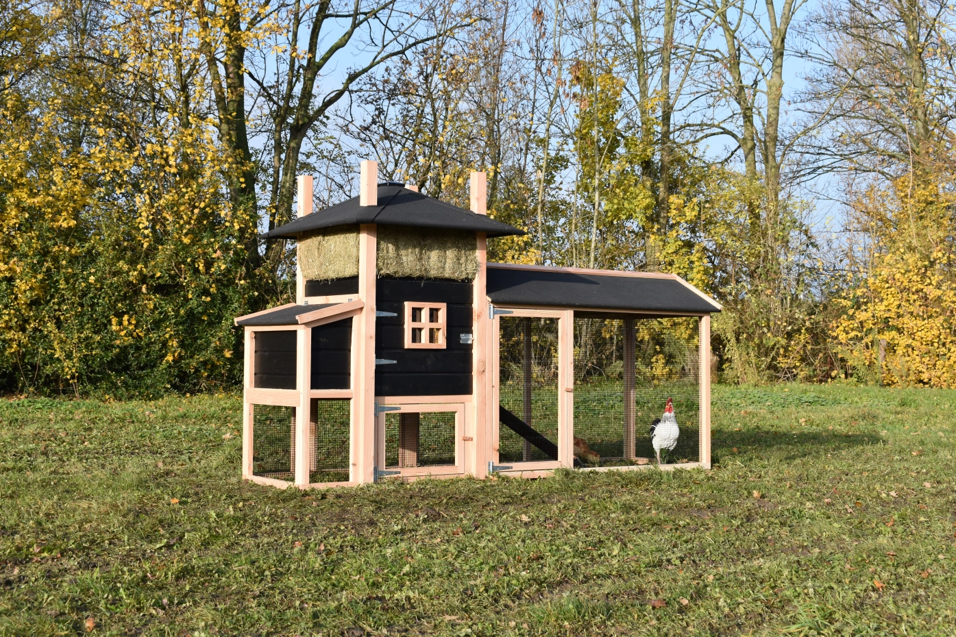 Hühnerstall Heuhaufen Rosalynn mit Legenest und überdachte Anbau-Auslauf. Dieser Heuhaufen hat ein Legenest und einen geräumigen Auslauf. Da der Auslauf unter dem Stall und dem Legenest verläuft, haben Ihre Hühner optimalen Platz! Das aufklappbare Dach des Legenestes ermöglicht es, die Eier einzusammeln, ohne sie zu stören. Die Tür des Hühnerstalls ist mit einem Kreuzfenster versehen, das dem Hühnerstall seinen rustikalen Stil verleiht. Kombiniert mit dem Heu ergibt sich ein schönes Bild in Ihrem Garten! Die breite Tür ermöglicht eine weite Öffnung. Schöne und praktische Hütte, hergestellt aus imprägniertem Holz für eine lange Lebensdauer.