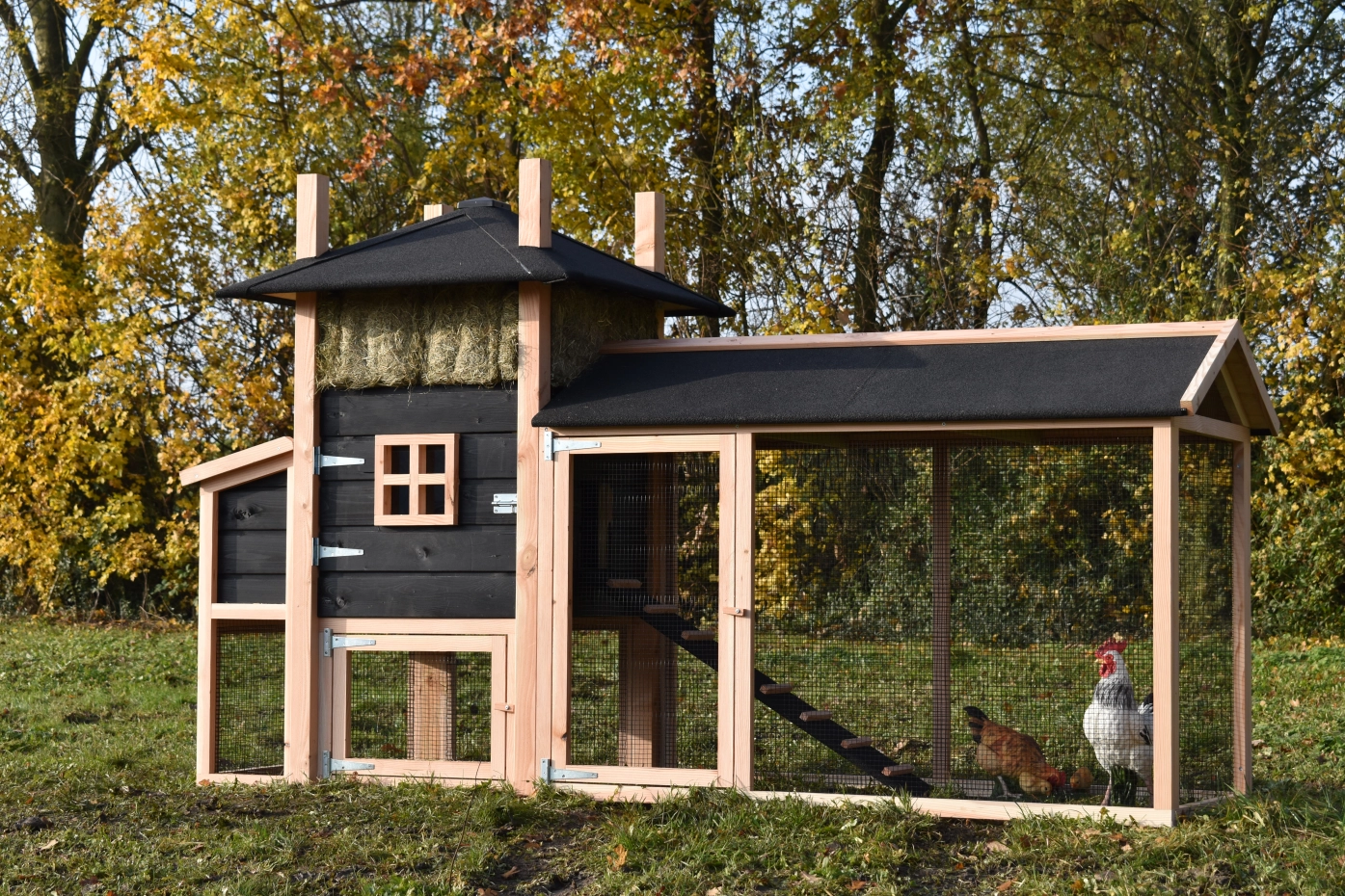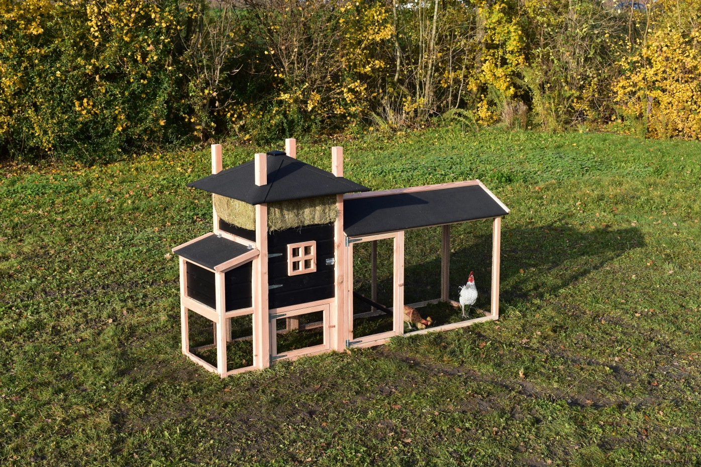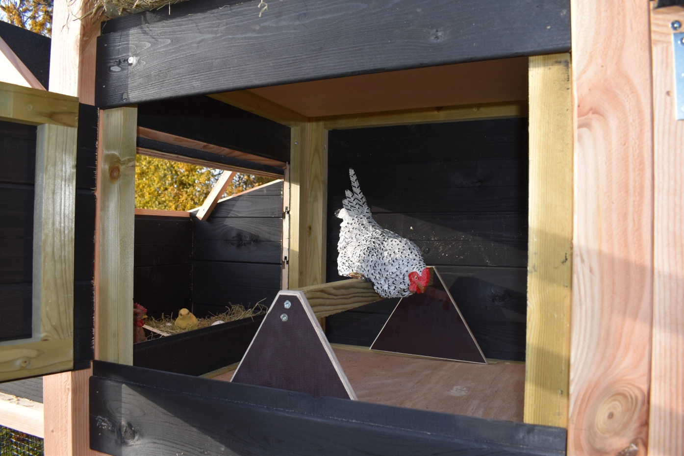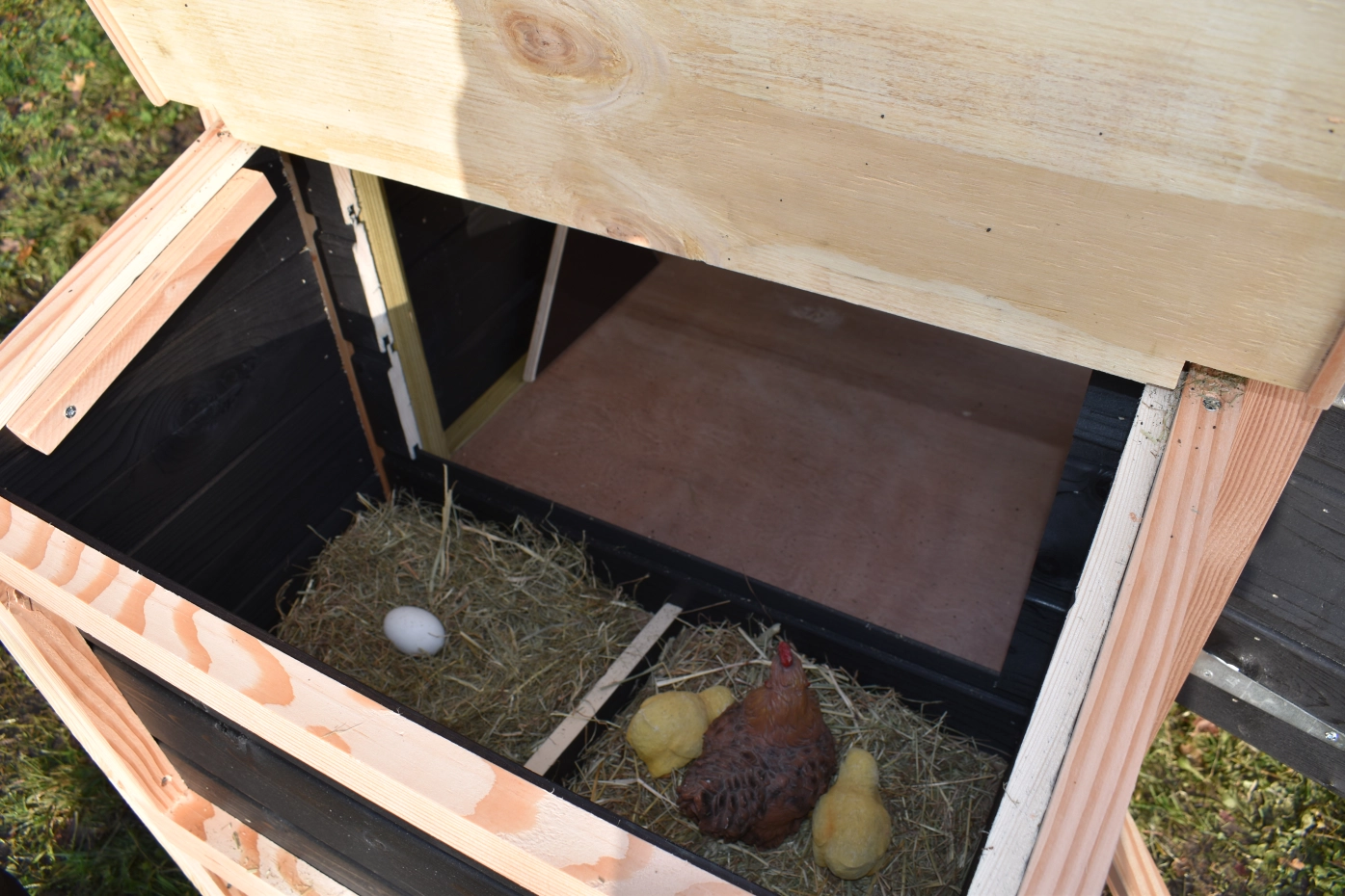 - Dieser Hühnerstall ist mit einem Legenest ausgestattet.
