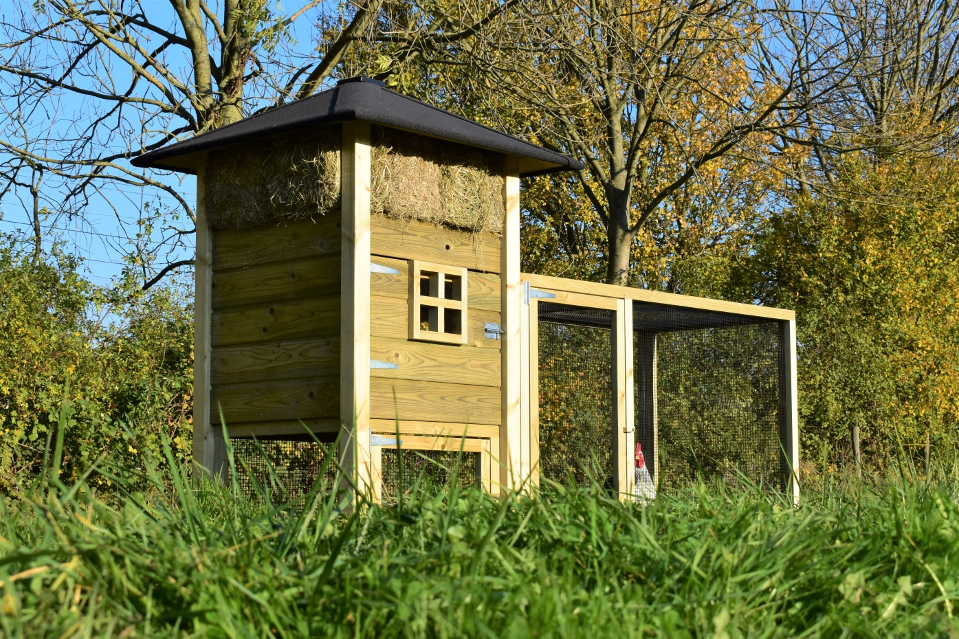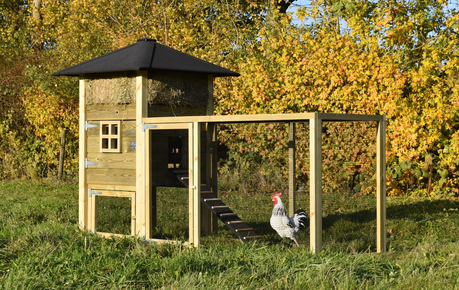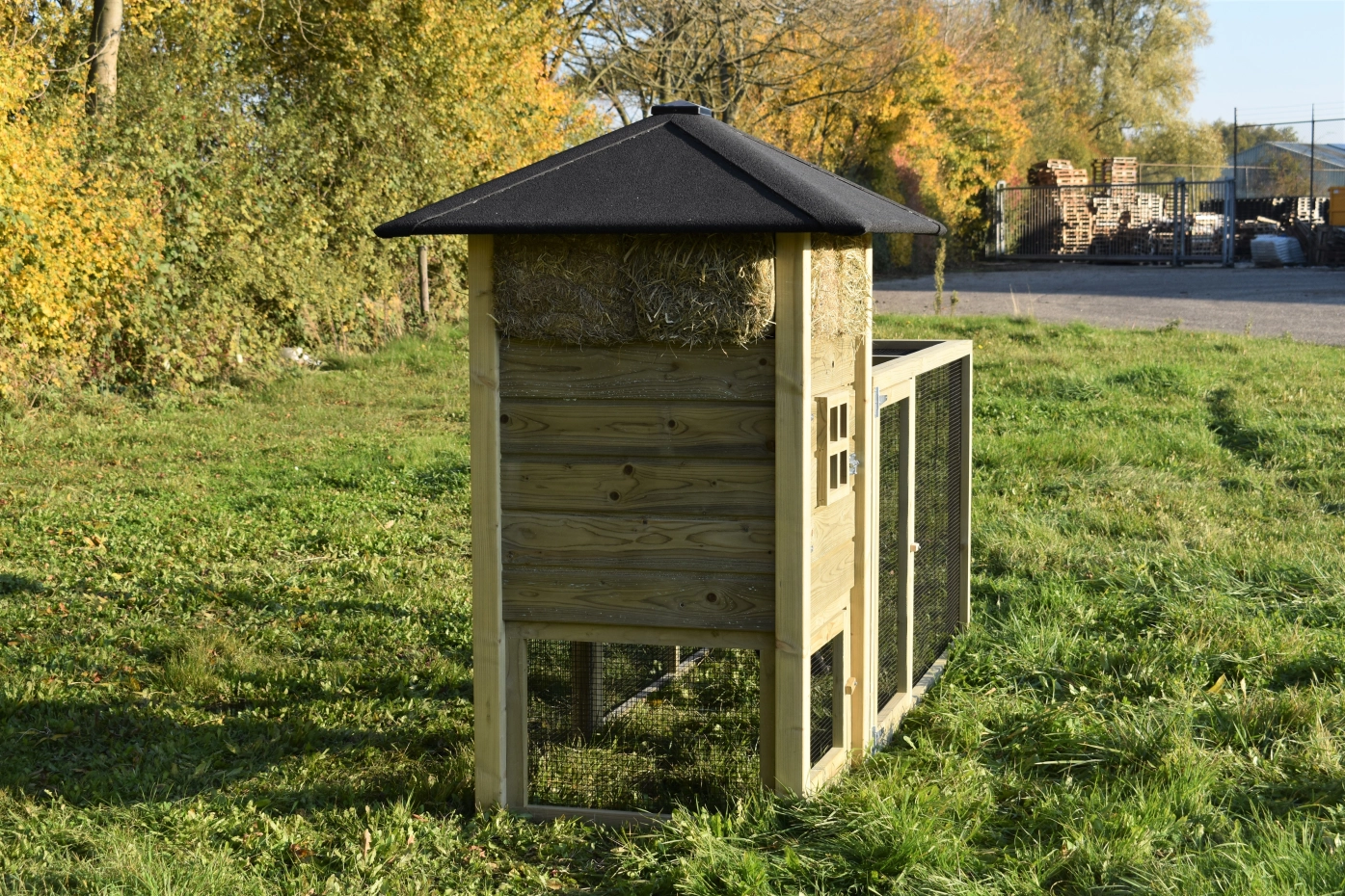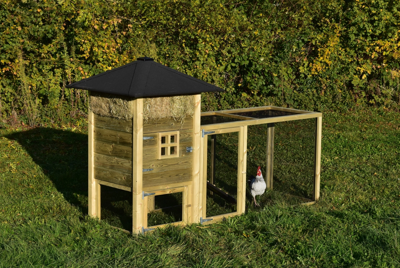 Hühnerstall Heuhaufen Rosanne mit Auslaufverlängerung. Wir bieten Ihren Hühnern einen schönen und soliden Stall mit diesem Heuhaufen mit Auslauf! Der Auslauf ist mit schmalen Gitterstäben ausgestattet, um Ihnen eine optimale Sicht zu ermöglichen. Die geräumigen Türen ermöglichen einen guten Zugang und machen die Reinigung zu einem Kinderspiel! Die Pfosten dieses Heuhaufens sind nicht durch das Dach gesteckt, wodurch das Modell etwas rustikaler wirkt. Trotzdem ist der Hühnerstall ein echtes Bild! Das Preis-Qualitäts-Verhältnis ist ausgezeichnet!