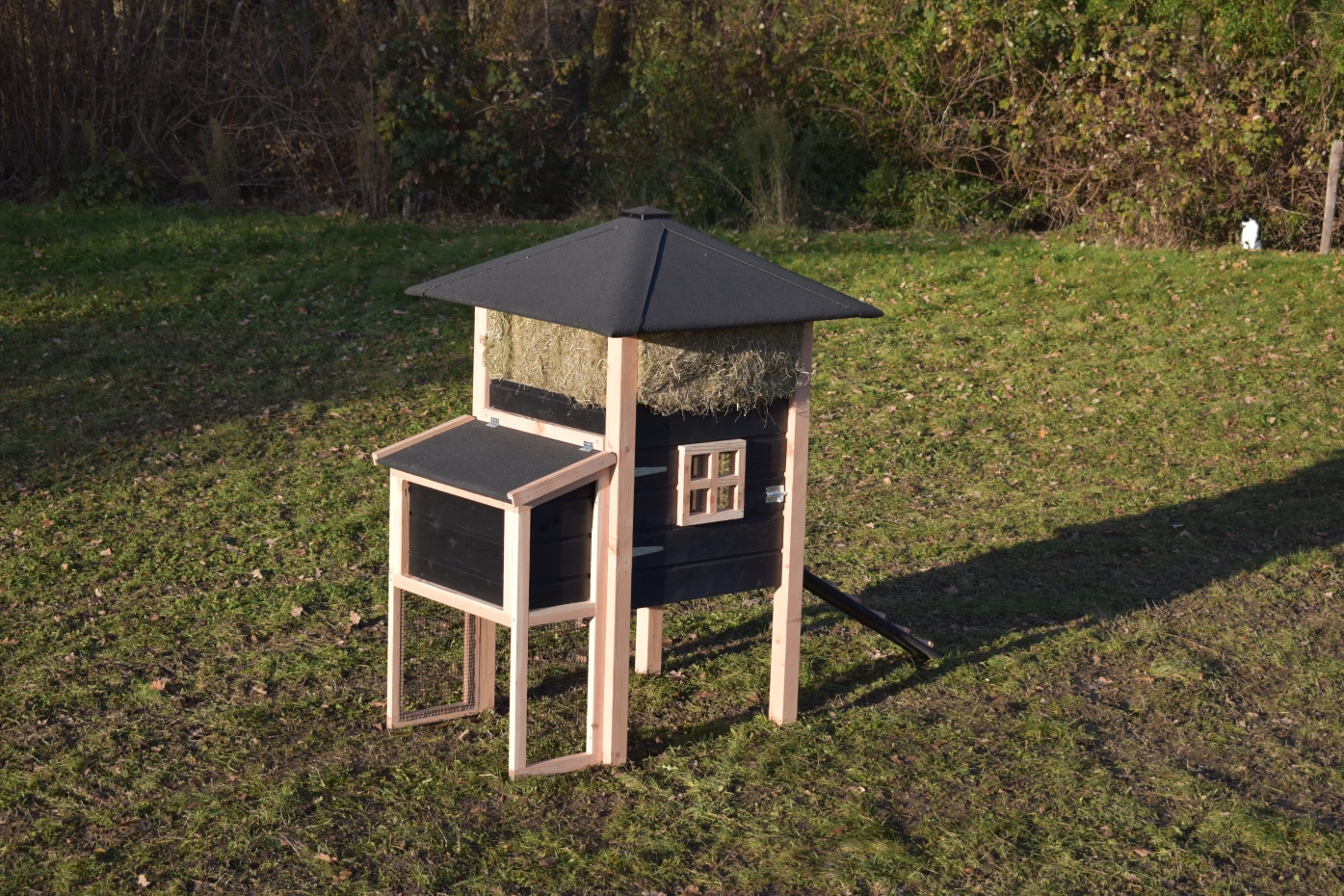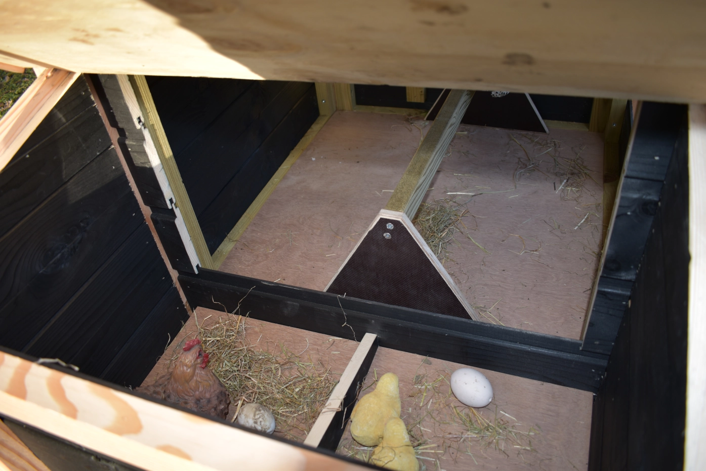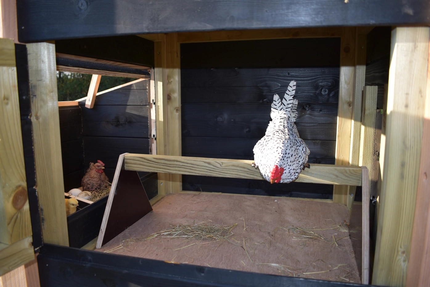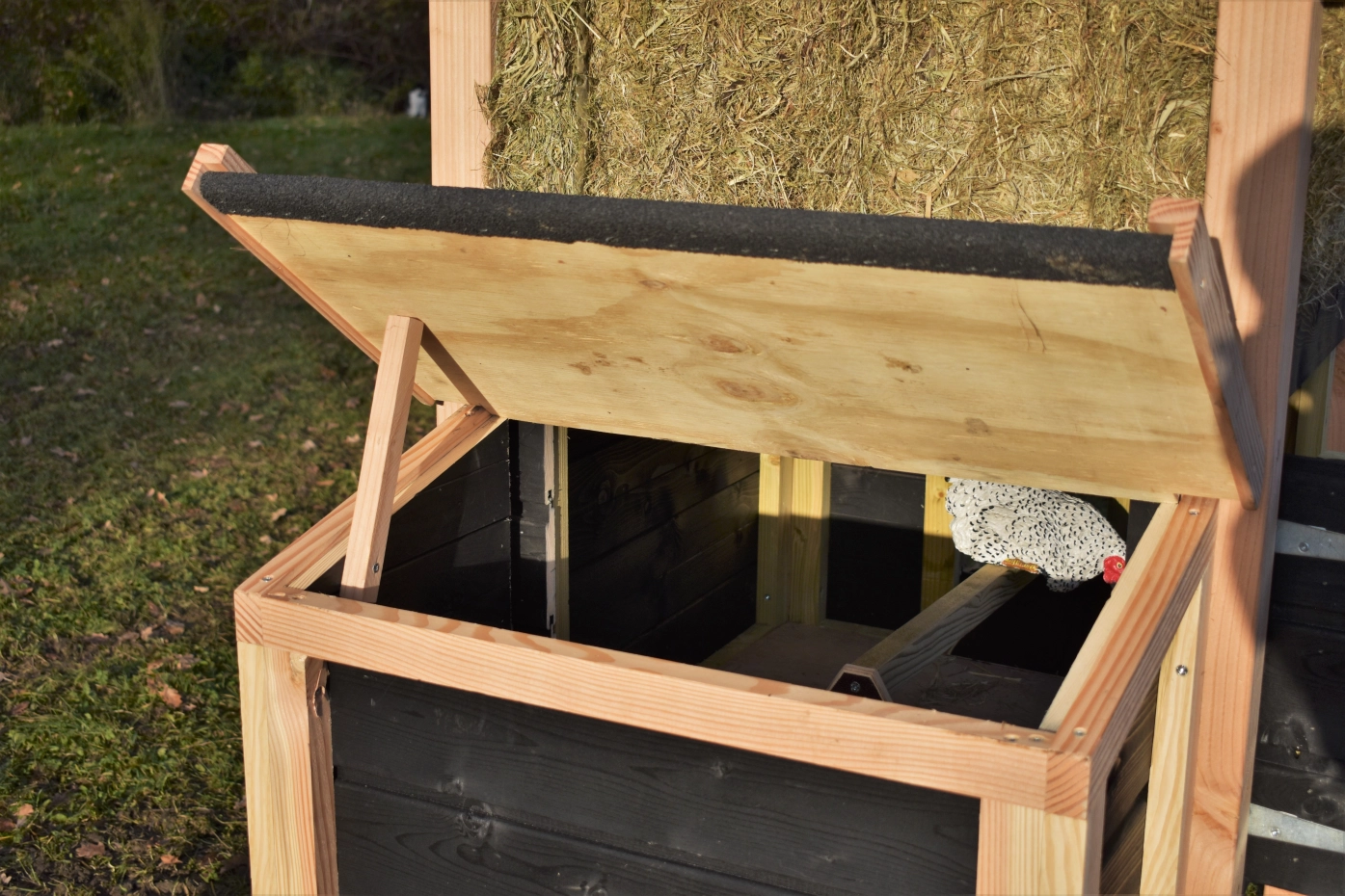 - Dieser Hühnerstall ist mit einem Legenest ausgestattet.
