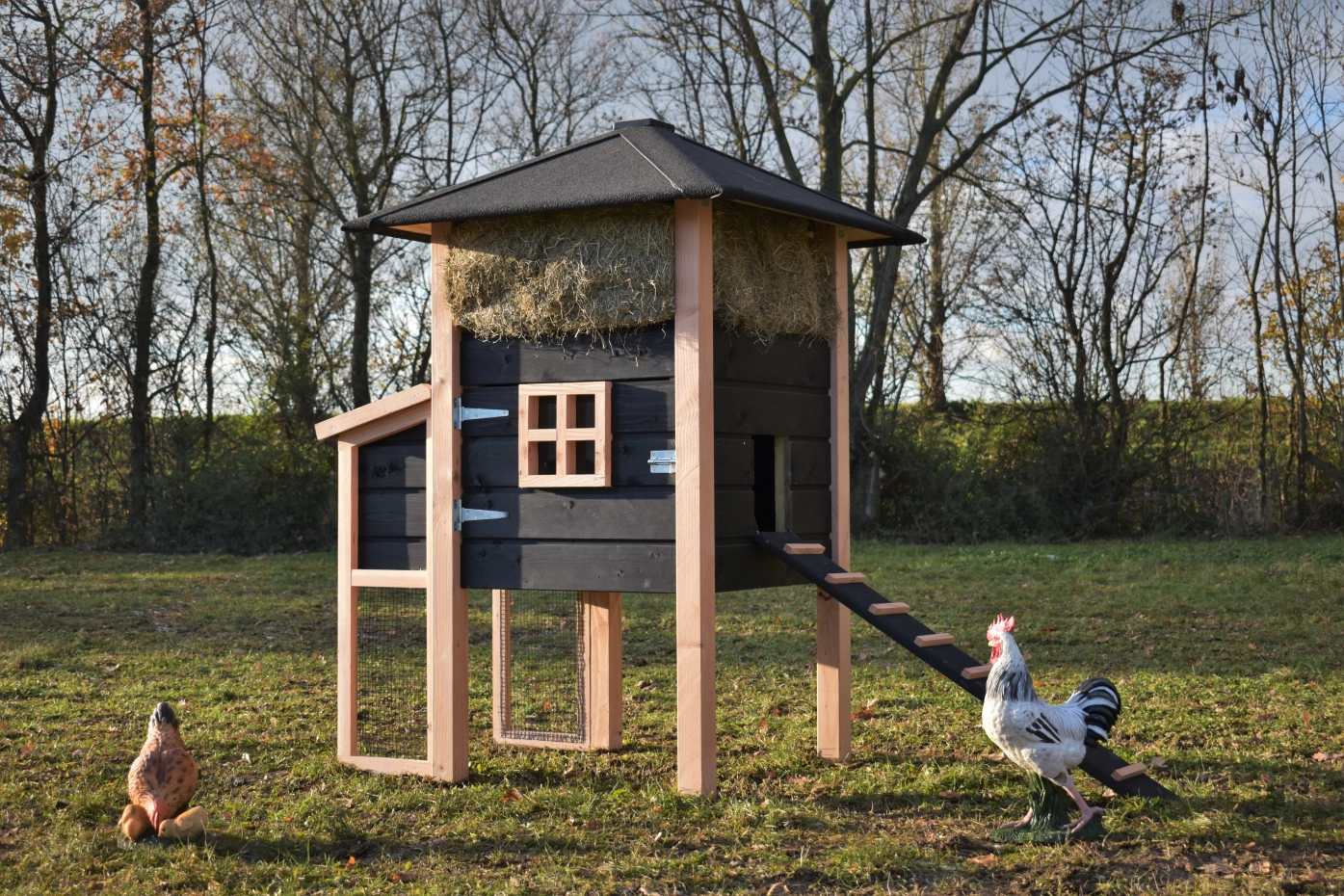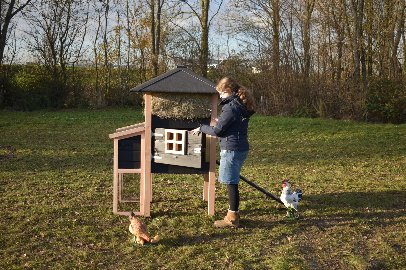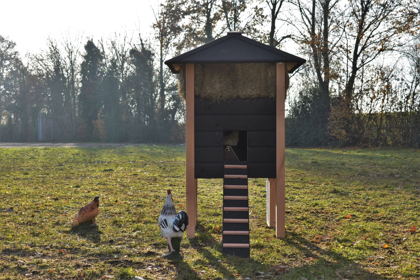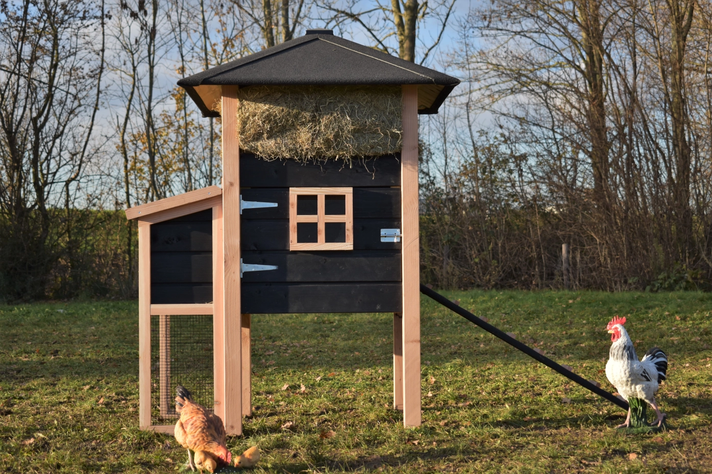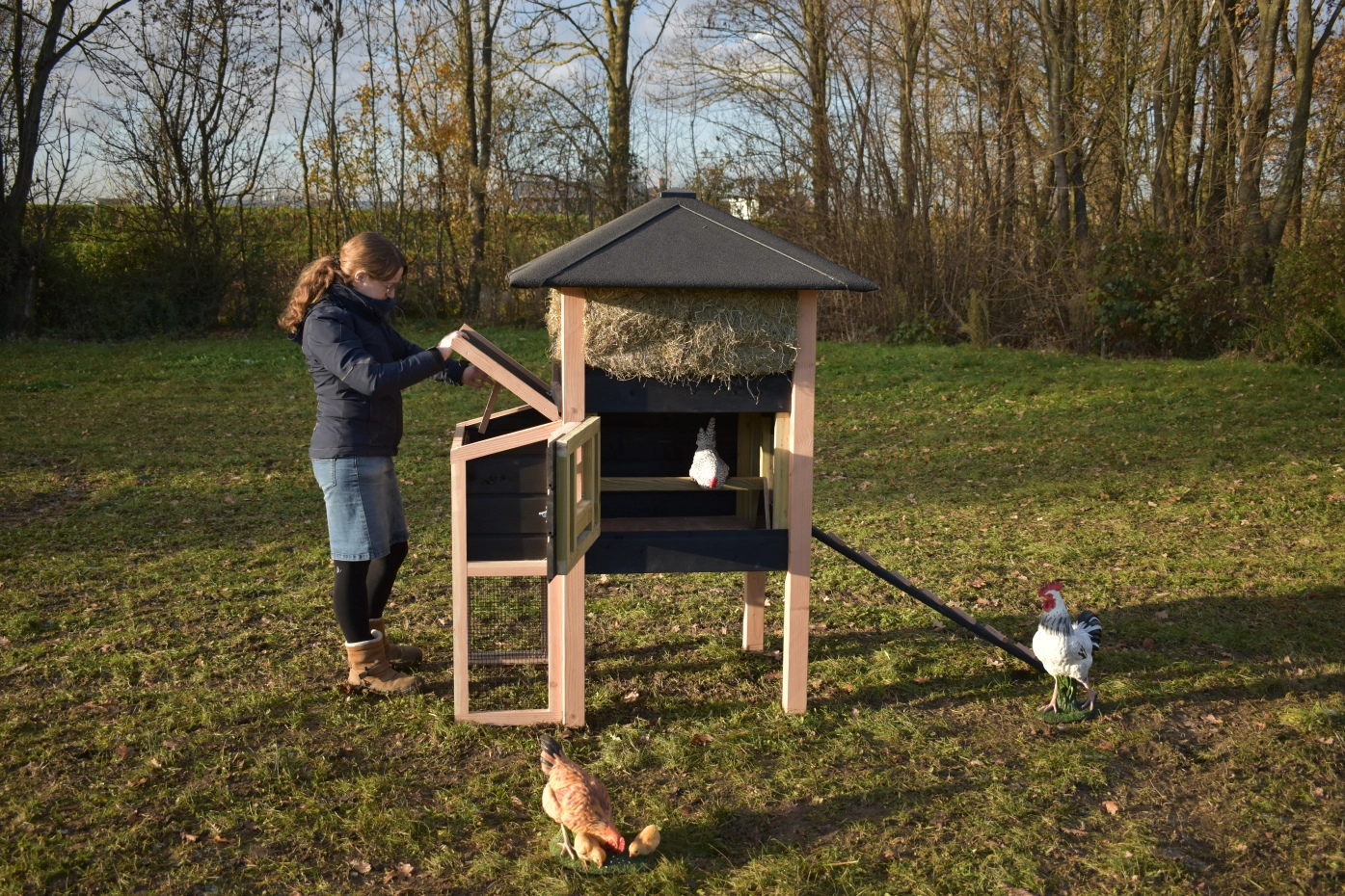 - Dieser Hühnerstall ist mit einem Legenest ausgestattet.