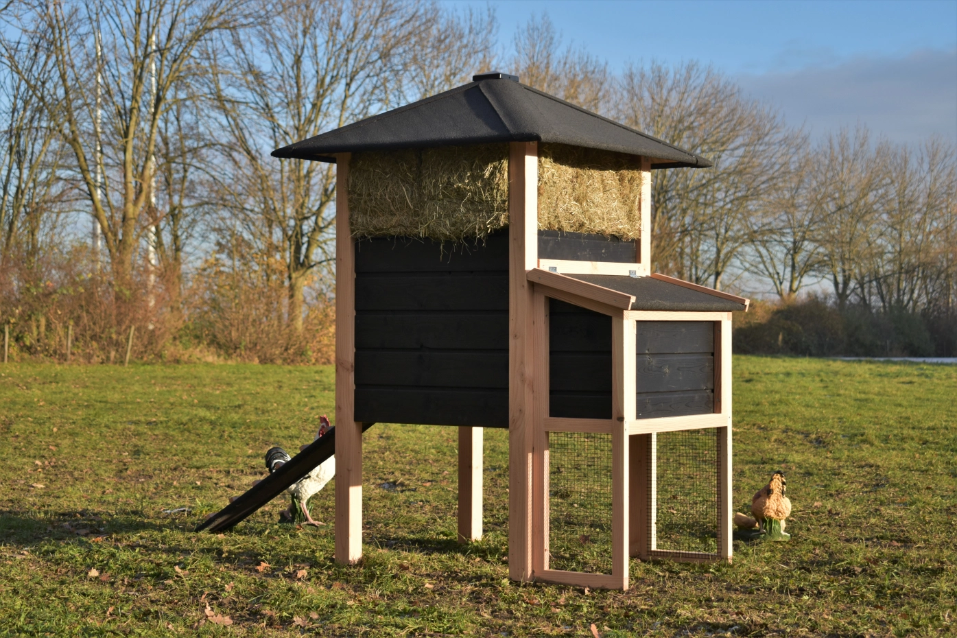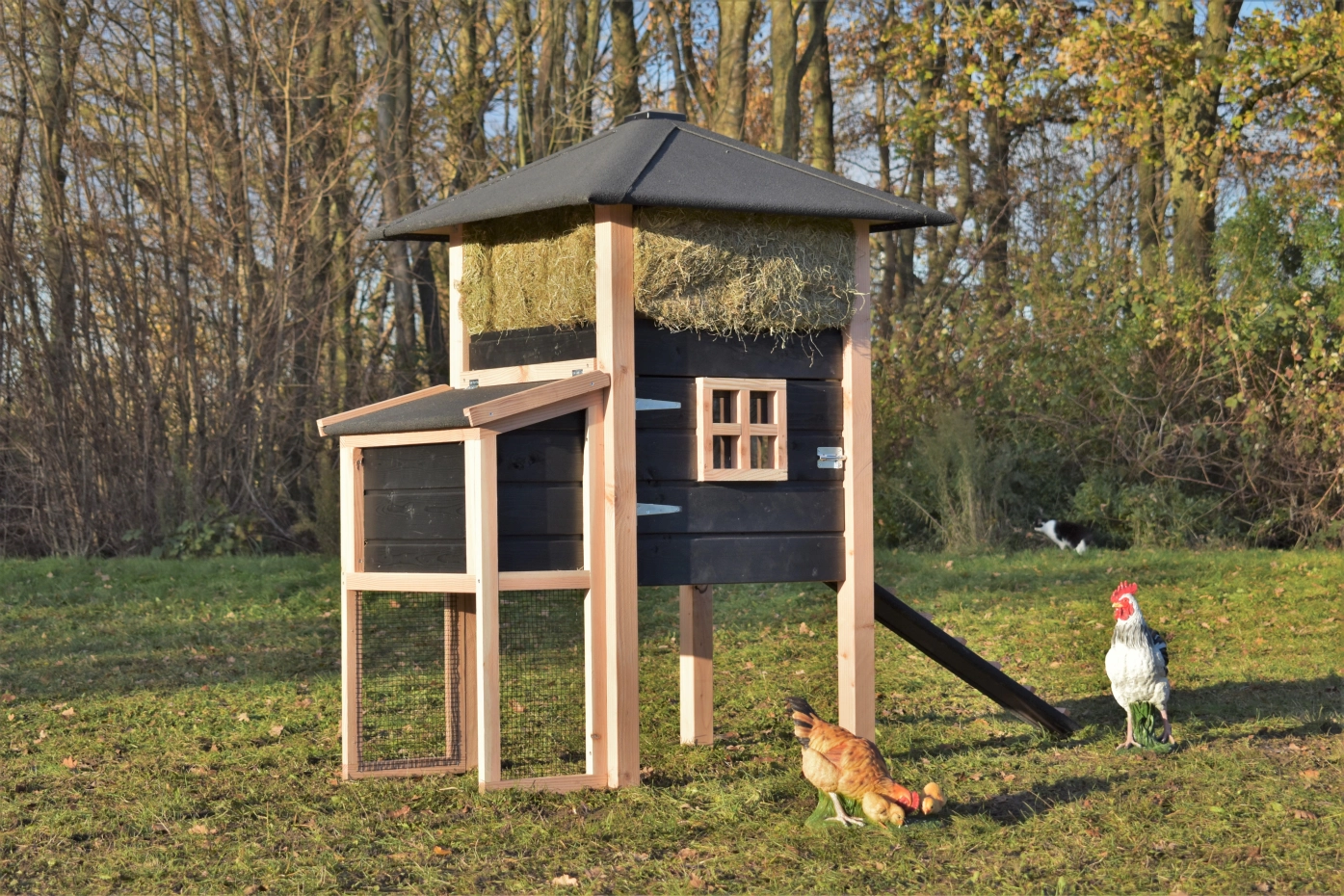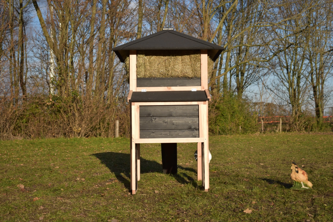 Hühnerstall Heuhaufen Rosanne ist erweitert mit ein Legenest. Das Legenest hat ein Klappdach, so dass Sie einfach die Eier sammeln können. Der Stall hat ein schön Spitzdach. Die Dächer sind beide ausgestattet mit 5mm dicke Dachpappe. Durch der große Tür ist es einfach um der Stall zu reinigen.