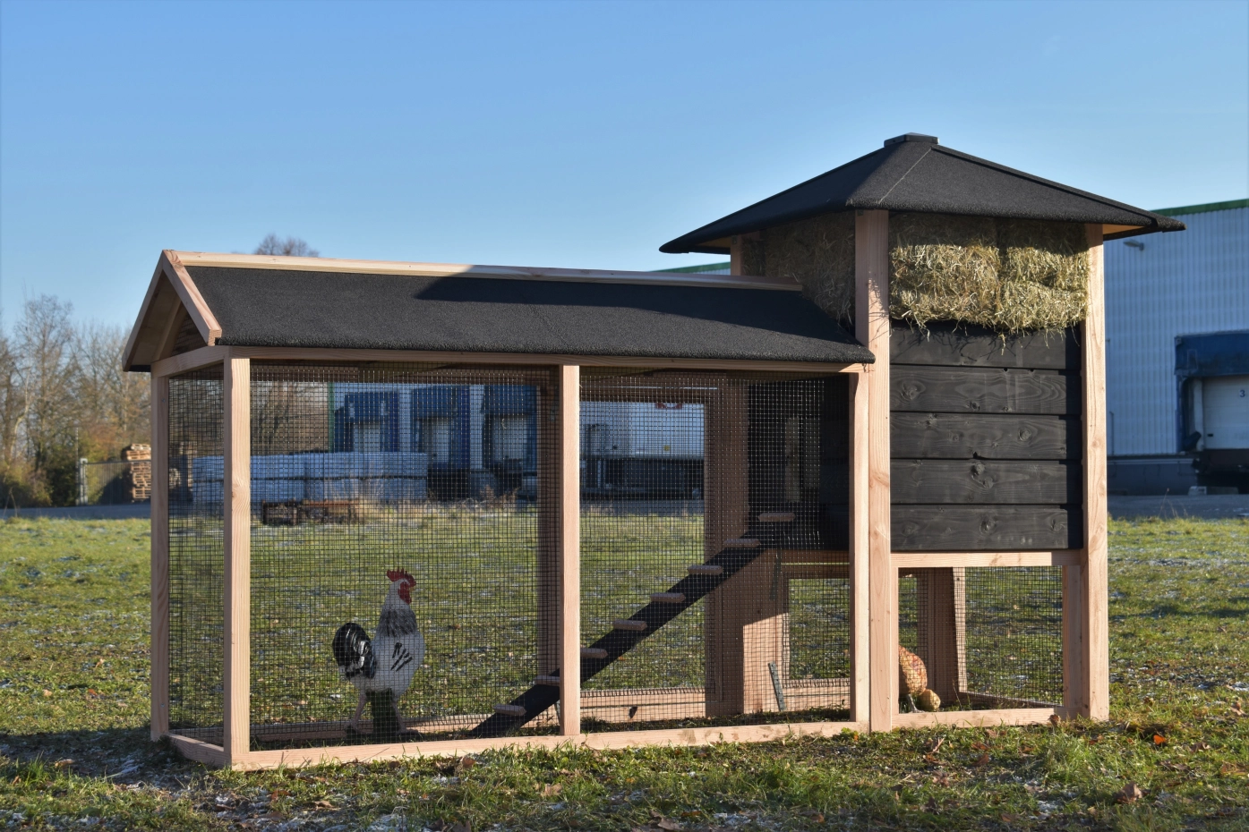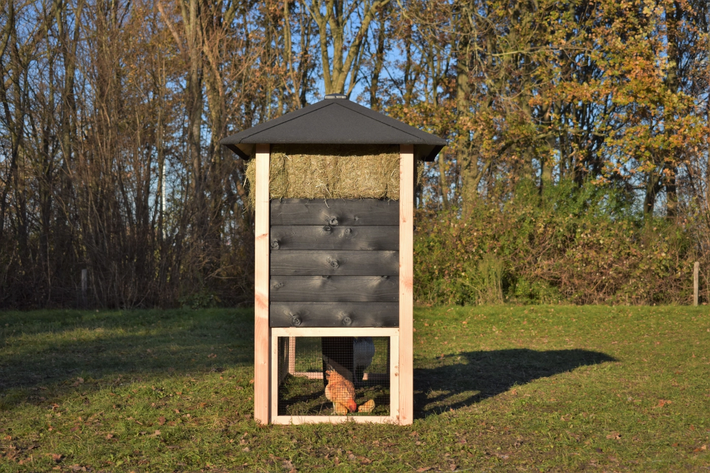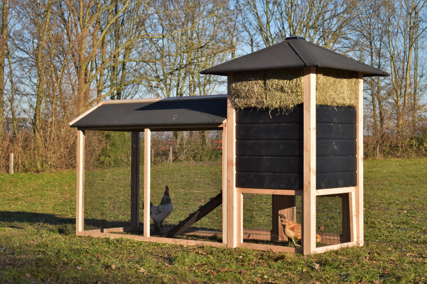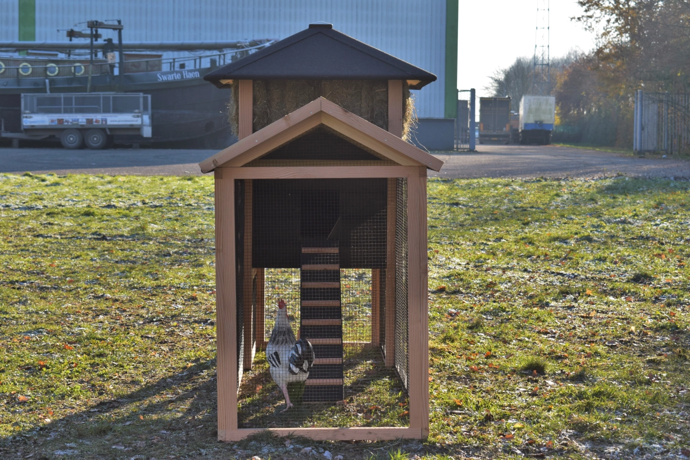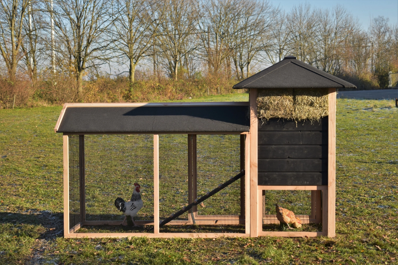 Mit diesem Heuhaufen Rosanne mit Auslauf kaufen Sie einen schönen Dachboden mit praktischen Eigenschaften. Diese Stall ist herstellt aus Douglasienholz und schwarz imprägniertes Fichtenholz! Da die Stangen nicht durch das Dach ragen, wirkt der Stall ruhiger. Dennoch haben Sie für relativ wenig Geld einen soliden und schönen Stall, in dem Sie problemlos 3 bis 5 Hühner halten können. Die Türen sind so breit wie möglich, damit Sie genügend Platz zum Reinigen usw. haben. Der Auslauf ist mit schwarzem Mesh versehen, wodurch er leicht zu durchschauen ist. Wenn Sie Heu dazu bestellen, ist dies ein idealer Stall mit einem schönen Design!