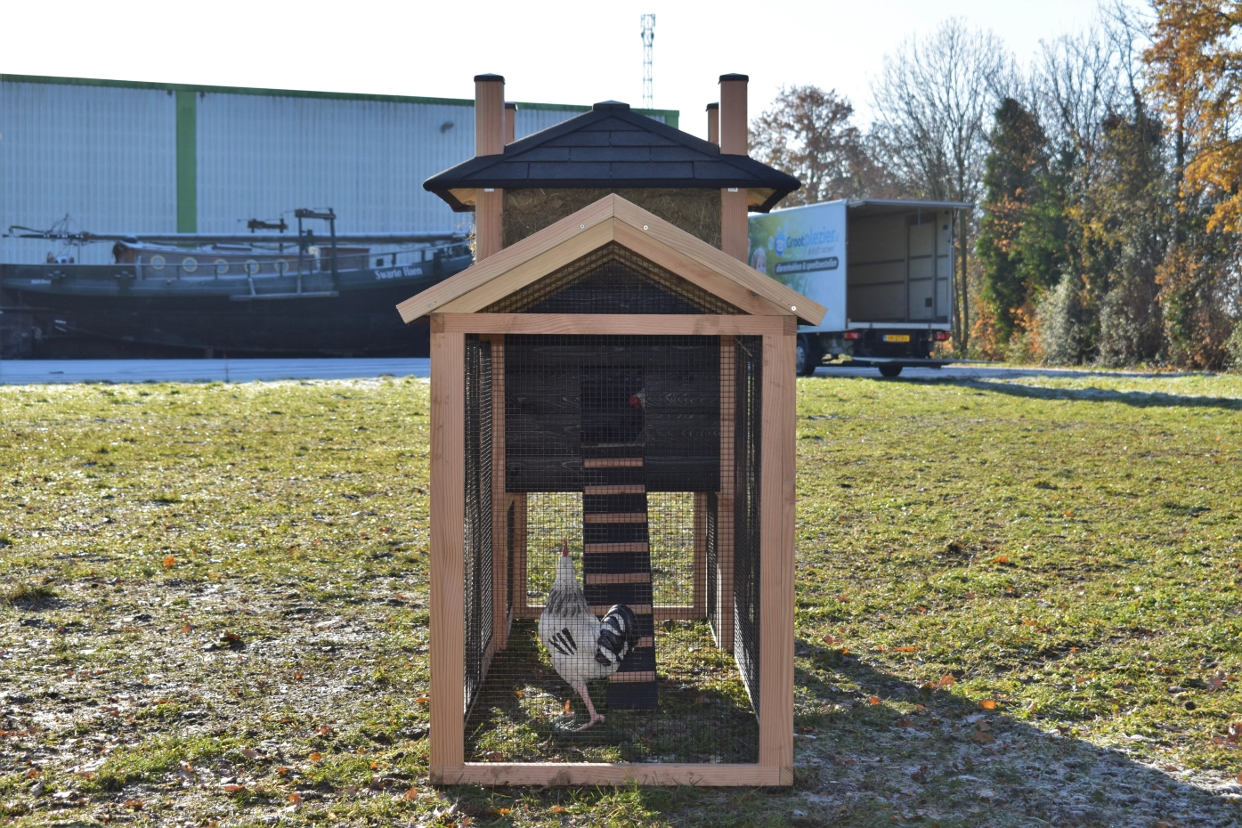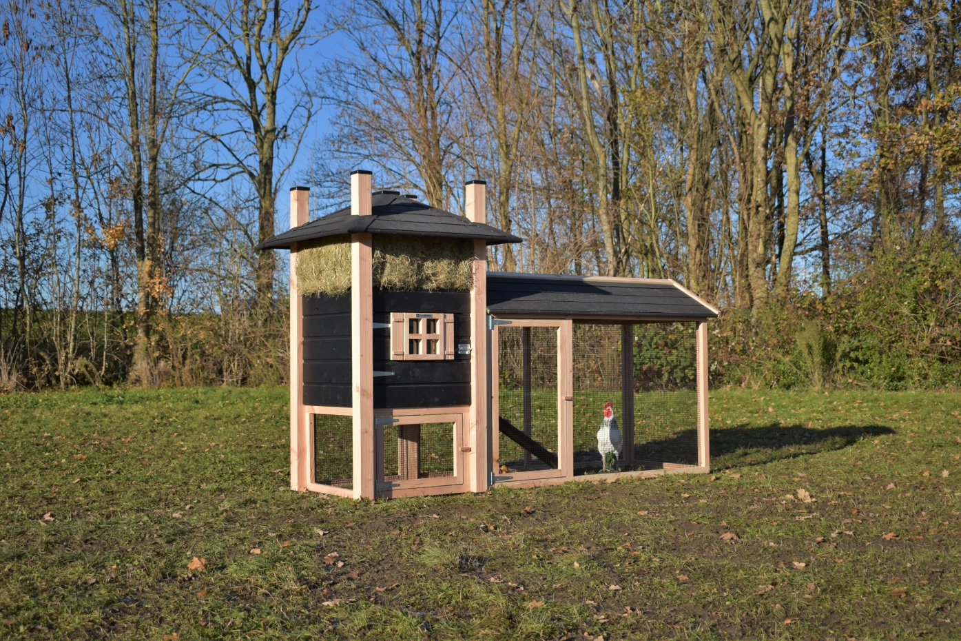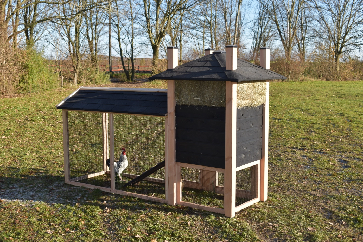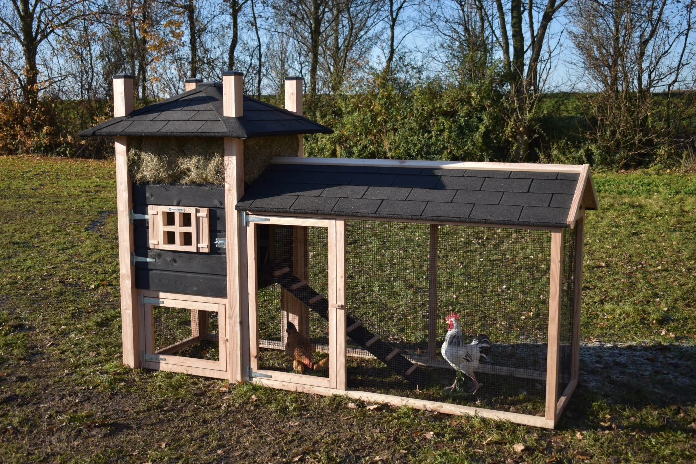 Hühnerstall Heuhaufen Rosa hat ein überdachte Auslauf und ist teilweise herstellt aus Douglasienholz und teilweise aus schwarz imprägniertes Fichtenholz. Diese Stall hat große Türen, ein groß Schlafraum und ein überdachte Auslauf. Diese Stall bietet Platz für 3 bis 5 Hühner. Diese Stall wird standard geliefert mit Heu. Um die Farbe des Holzes zu erhalten, können Sie es mit Douglasöl behandeln. Ohne weitere Behandlung wird das Holz schnell vergrauen. Auch ohne weitere Behandlung ist Douglasie sehr dauerhaft.