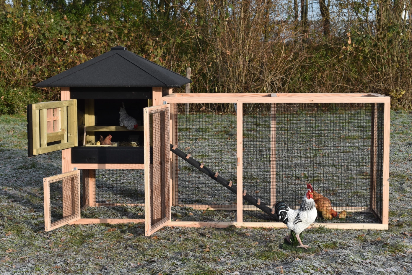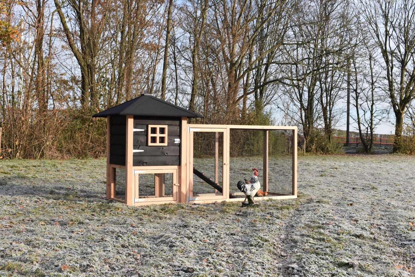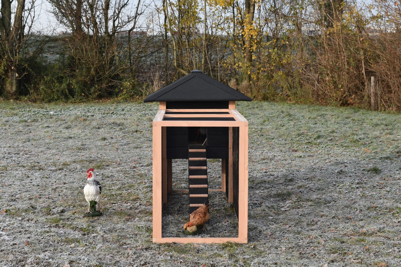Der Hühnerstall Rosy mit Gitterdachauslauf ist eine tolle Kombination, die Ihren Hühnern einen Haüschen mit Stil bietet! Der geräumige Auslauf bietet Ihnen eine gute Sicht auf Ihre Hühner. Außerdem haben sie viel Platz zum Kratzen. Durch der große Tür können Sie der Schlafraum leicht reinigen. Ein schöne Stall für einem guten Preise!