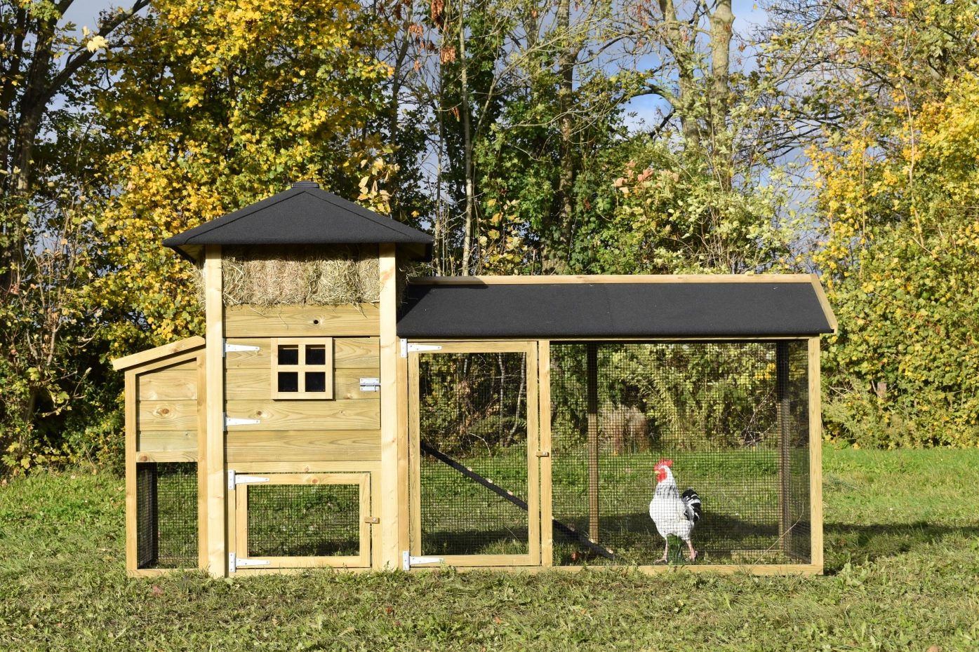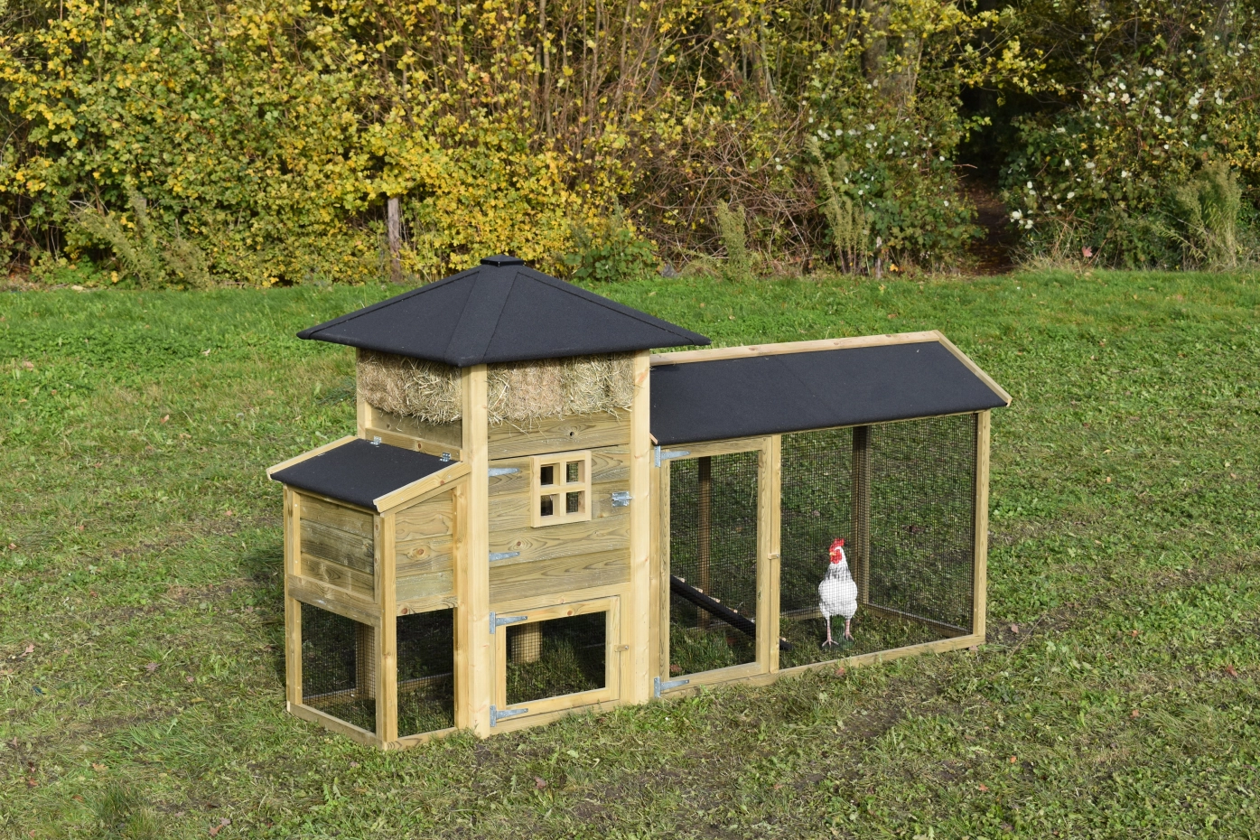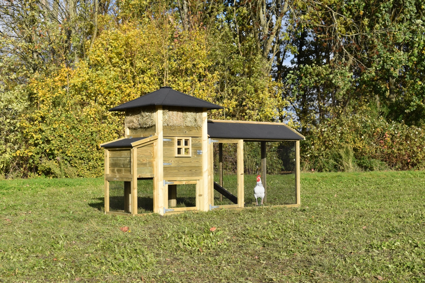 Hühnerstall Heuhaufen Rosanne mit Legenest und überdachte Auslauf. Diese schöne Stall mit große Auslauf und ein Legenest ist ein Erwerb für Ihre Garten. Durch das imprägniertes Holz ist es auch Wartungsfrei. Durch der große Türen ist der Stall leicht zu reinigen. Das Legenest hat ein Klappdach, so können Sie einfach die Eier sammeln. Das Dach ist ausgestattet mit schwarze Dachpappe.