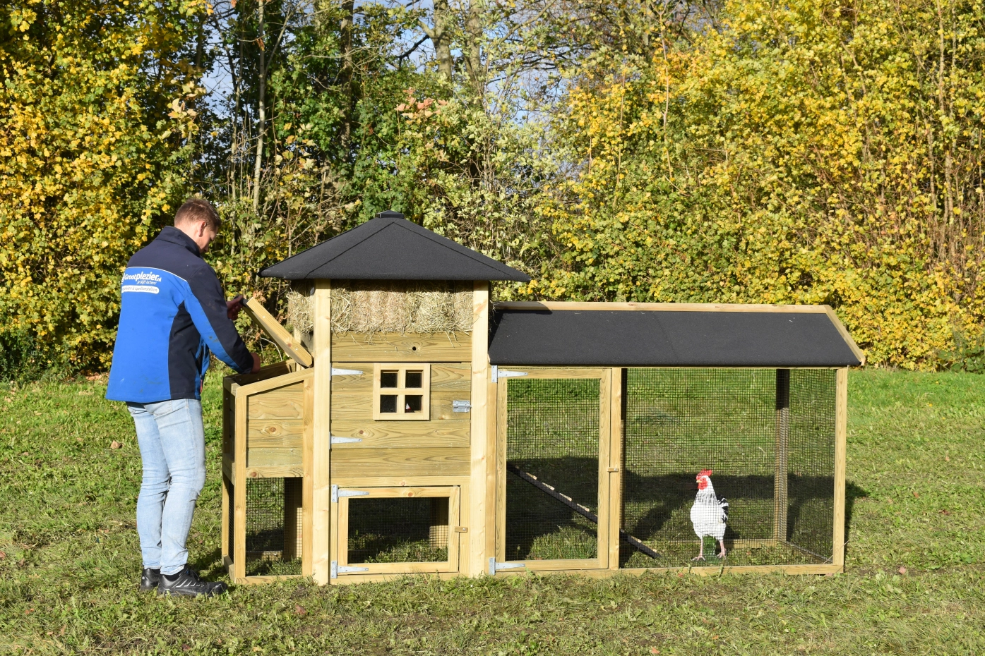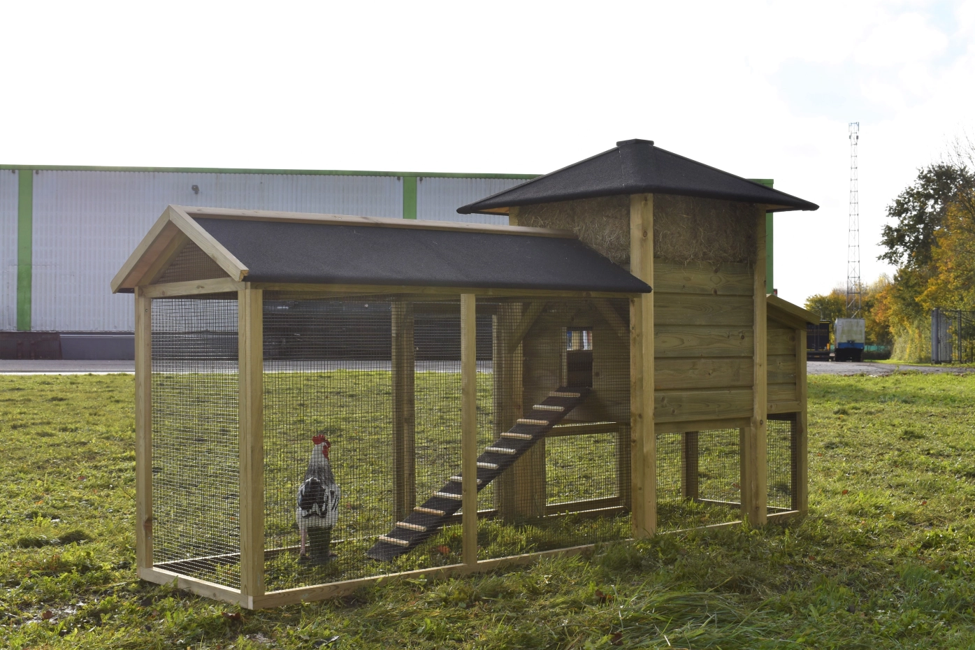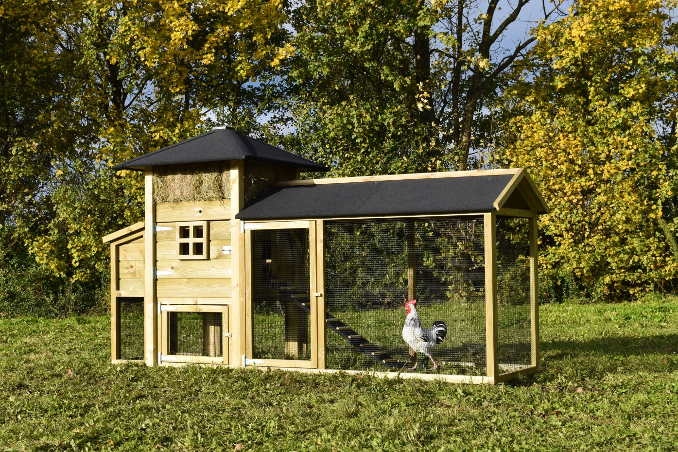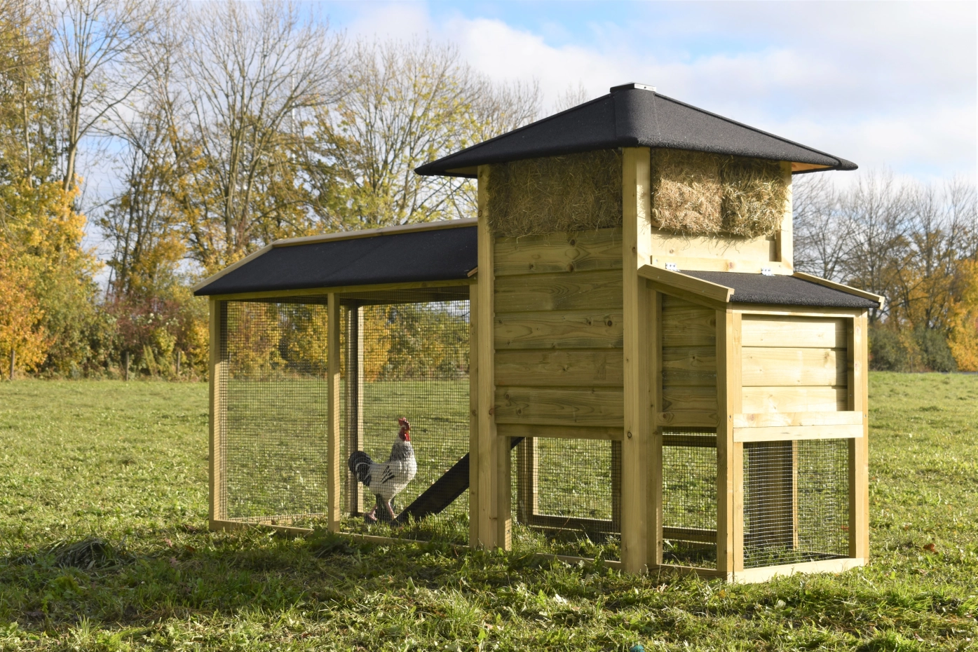 Hühnerstall Heuhaufen Rosanne mit Legenest und überdachte Auslauf. Diese schöne Stall mit große Auslauf und ein Legenest ist ein Erwerb für Ihre Garten. Durch das imprägniertes Holz ist es auch Wartungsfrei. Durch der große Türen ist der Stall leicht zu reinigen. Das Legenest hat ein Klappdach, so können Sie einfach die Eier sammeln. Das Dach ist ausgestattet mit schwarze Dachpappe.