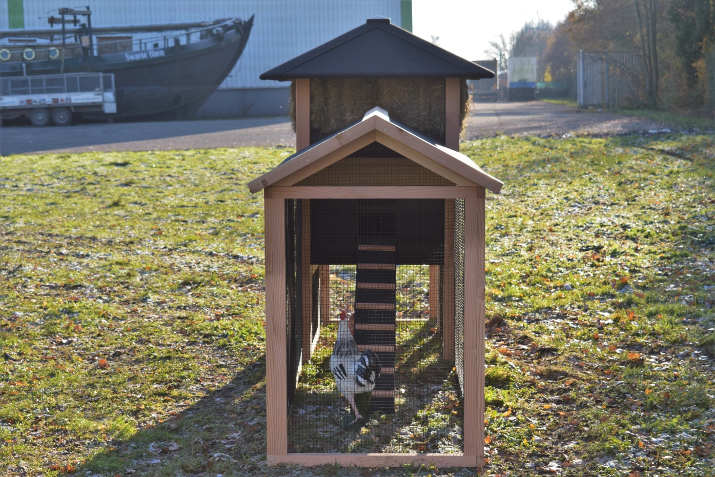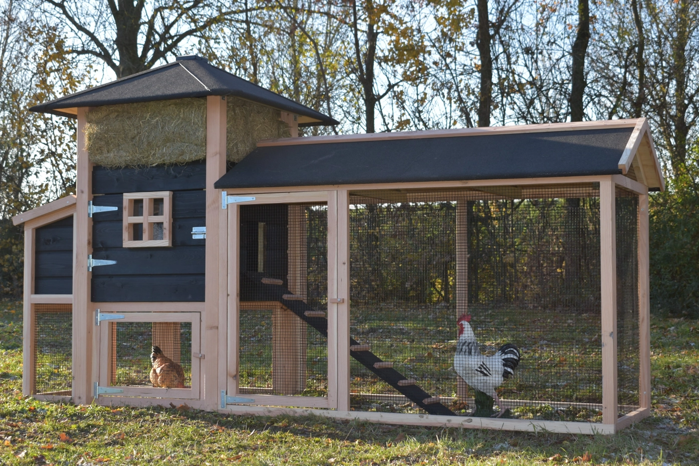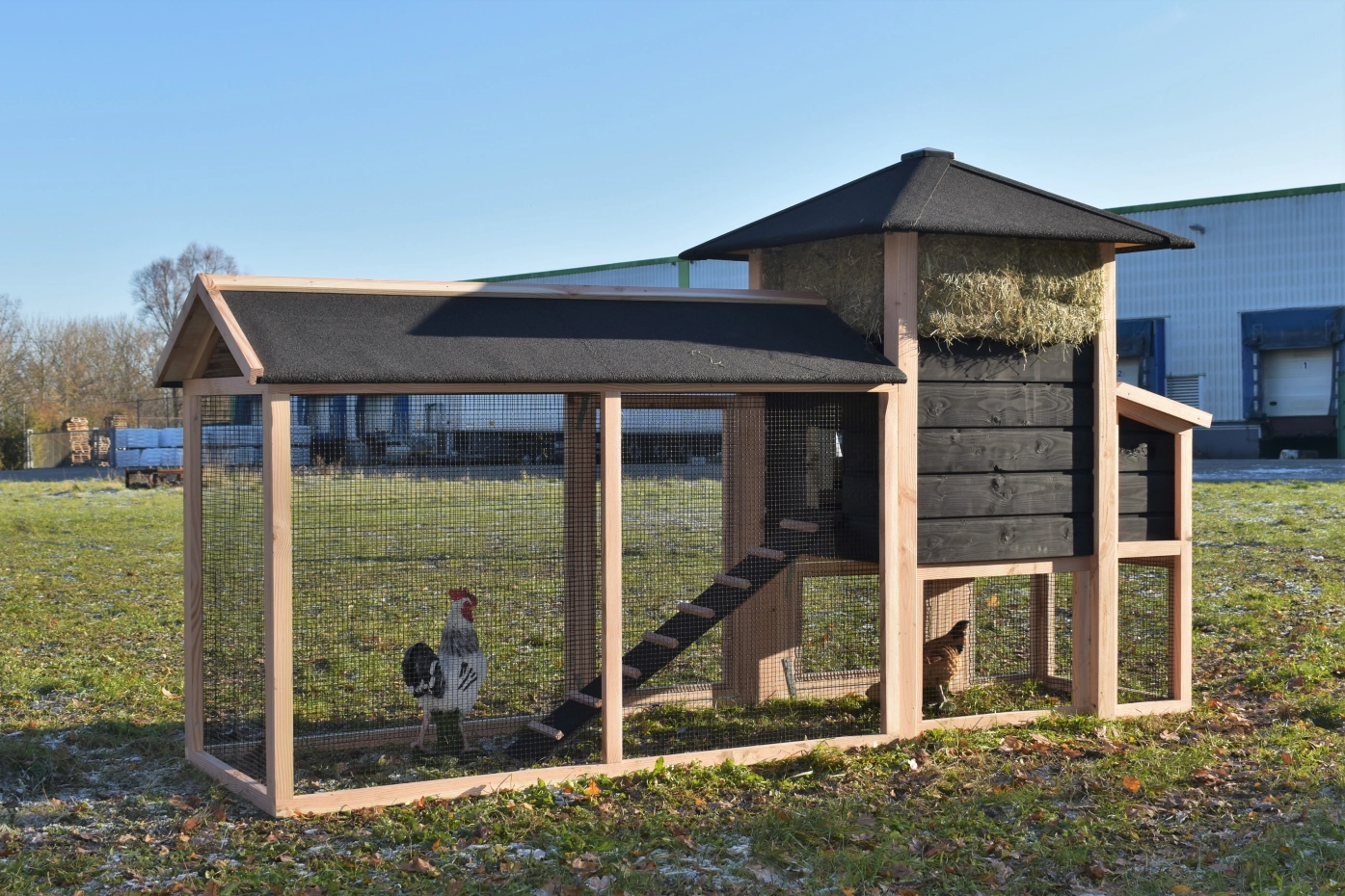 Hühnerstall Heuhaufen Rosanne mit Legenest und überdachte Auslauf. Diese schöne Stall mit große Auslauf und ein Legenest ist ein Erwerb für Ihre Garten. Durch das imprägniertes Holz ist es auch Wartungsfrei. Durch der große Türen ist der Stall leicht zu reinigen. Das Legenest hat ein Klappdach, so können Sie einfach die Eier sammeln. Das Dach ist ausgestattet mit schwarze Dachpappe.