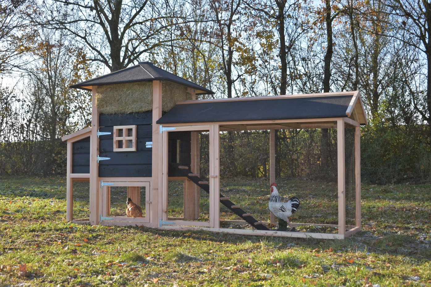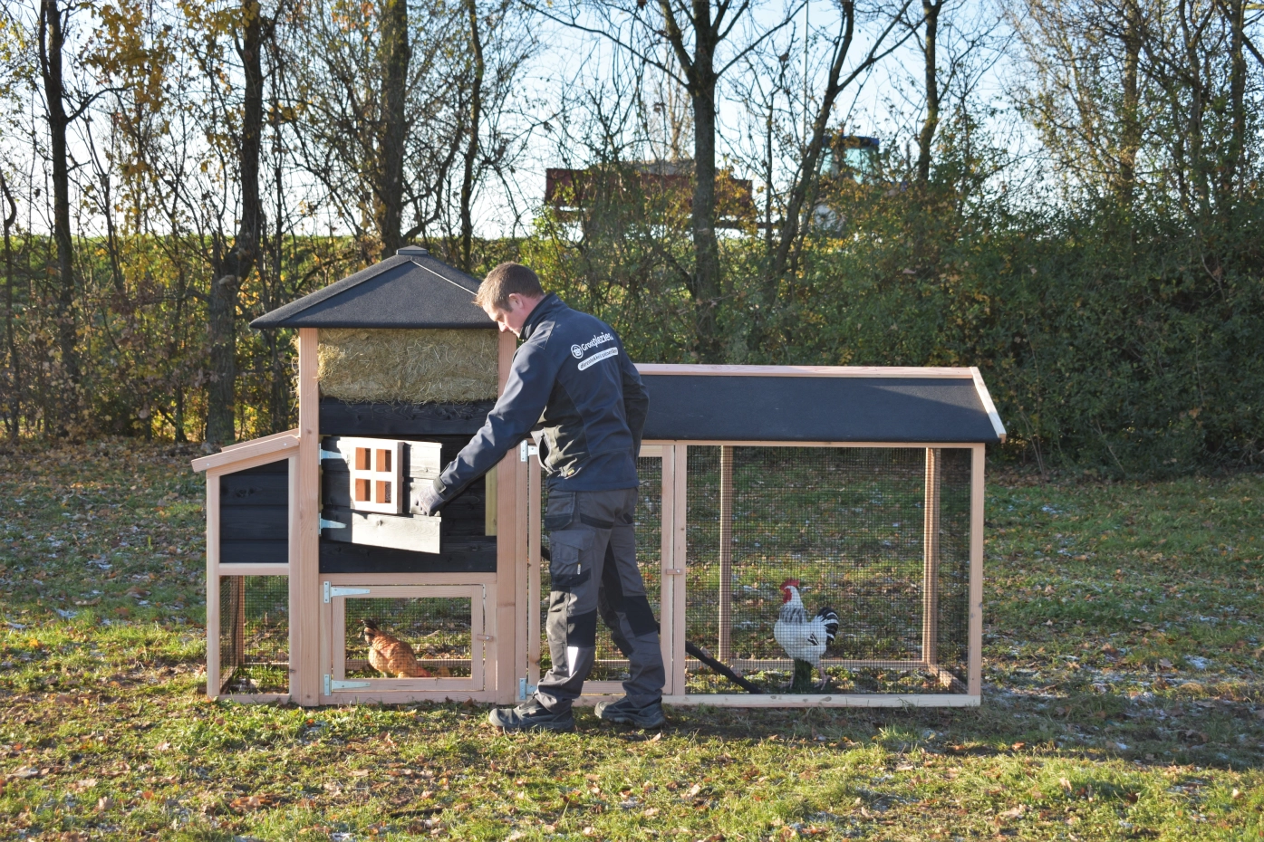 - Dieser Hühnerstall ist mit einem Legenest ausgestattet.