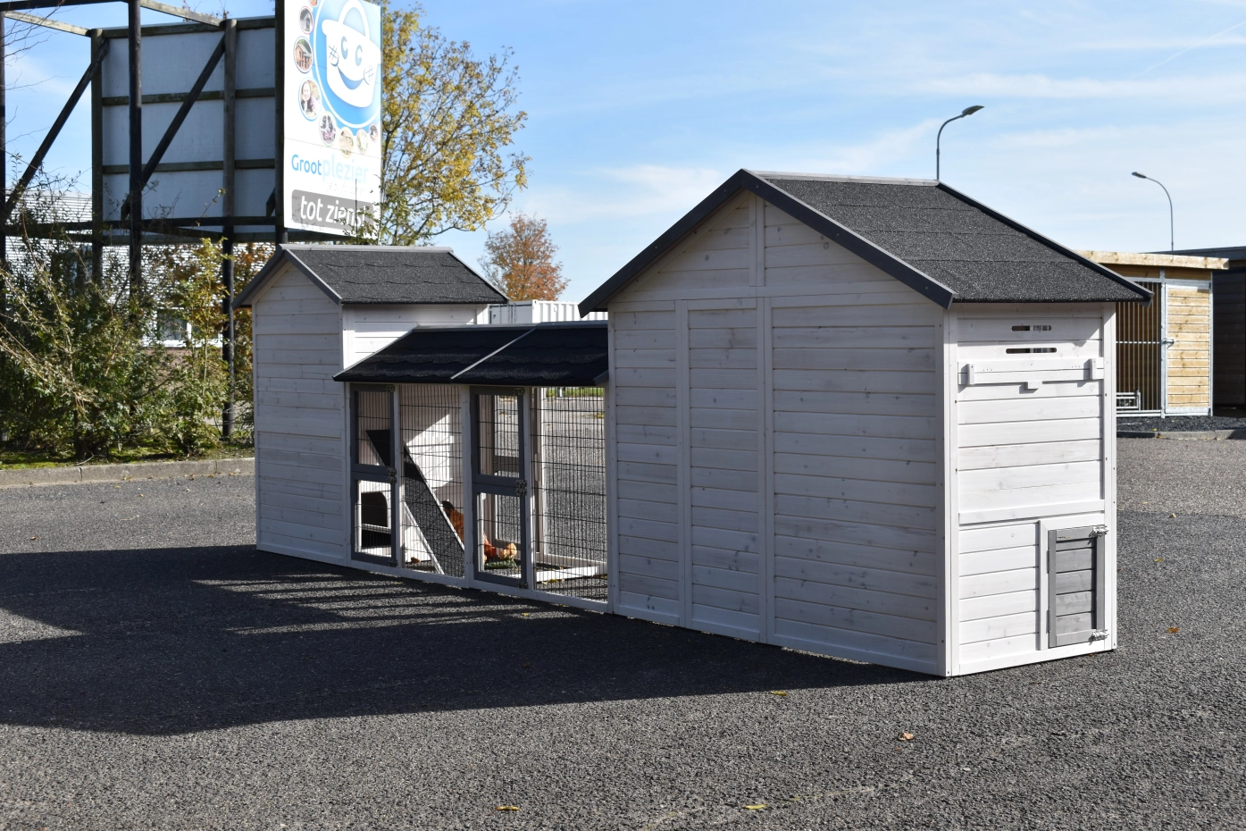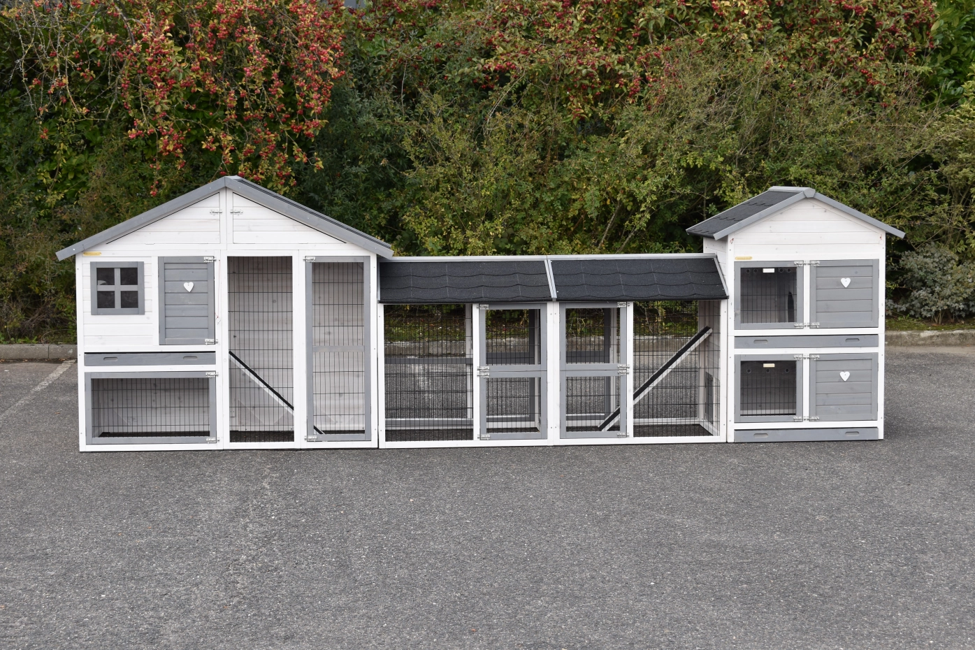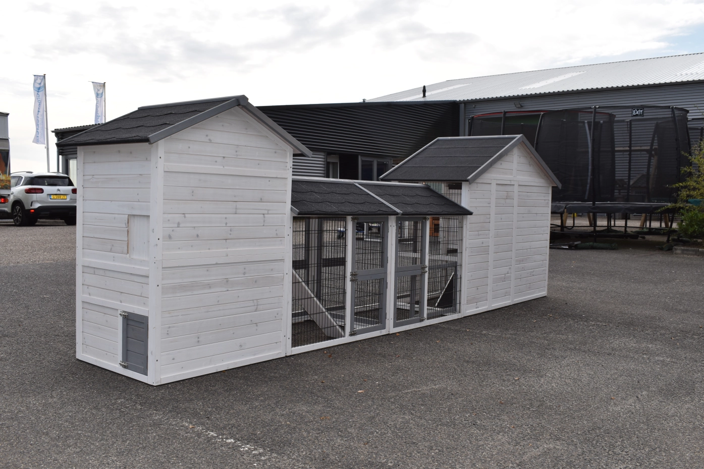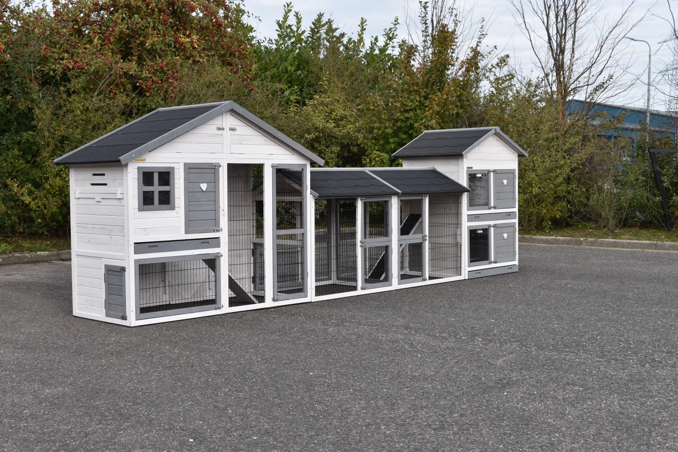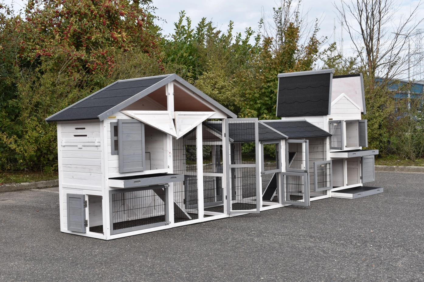 Der Hühnerstall Holiday Medium wurde um den Stall Double Medium und 2 Ausläufe erweitert. Der Hühnerstall Holiday Medium verfügt über eine Schublade und einen praktischen Stauraum. Der Hühnerstall Double Medium hat 2 getrennte Schlafraüme, von denen jeder eine Schublade hat. Dieser Stall hat auch einen Stauraum. Diese große Kombination eignet sich für 9 große oder 15 kleine Hühner.