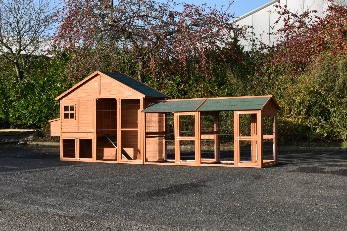 Große Hühnerstall Holiday Large ist ein schöne und praktische Stall mit ein Schlafraum und 2 Space Large Ausläufe. Der Stall ist auch ausgestattet mit ein Legenest. Diese schöne Stall ist ausgestattet mit viele Türen, der Schlafraum hat 2 Sitzstange. Oben der Schlafraum befindet sich ein Stauraum. Der Schlafraum von der Holiday Large ist geeignet für ca. 4-10 Hühner.