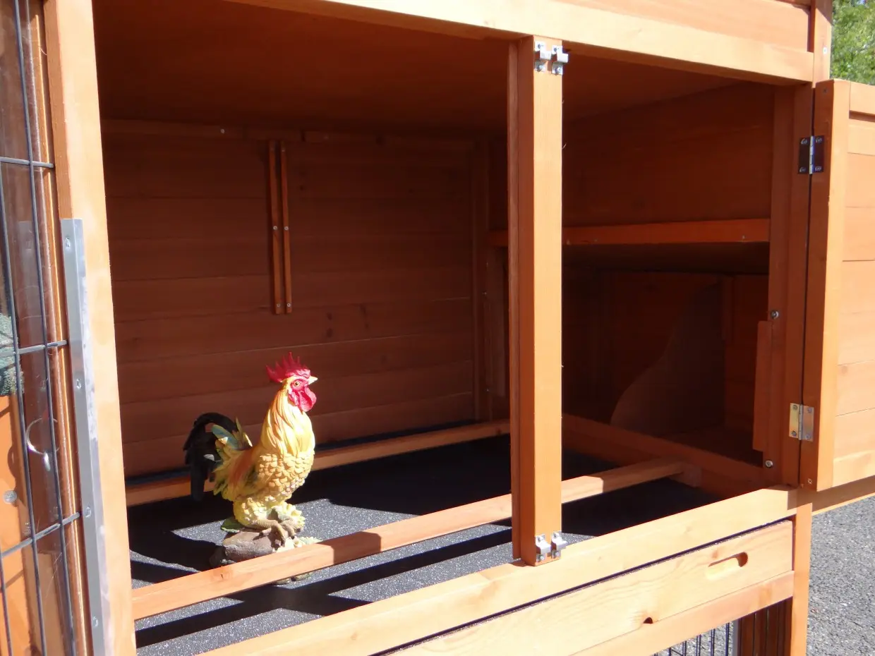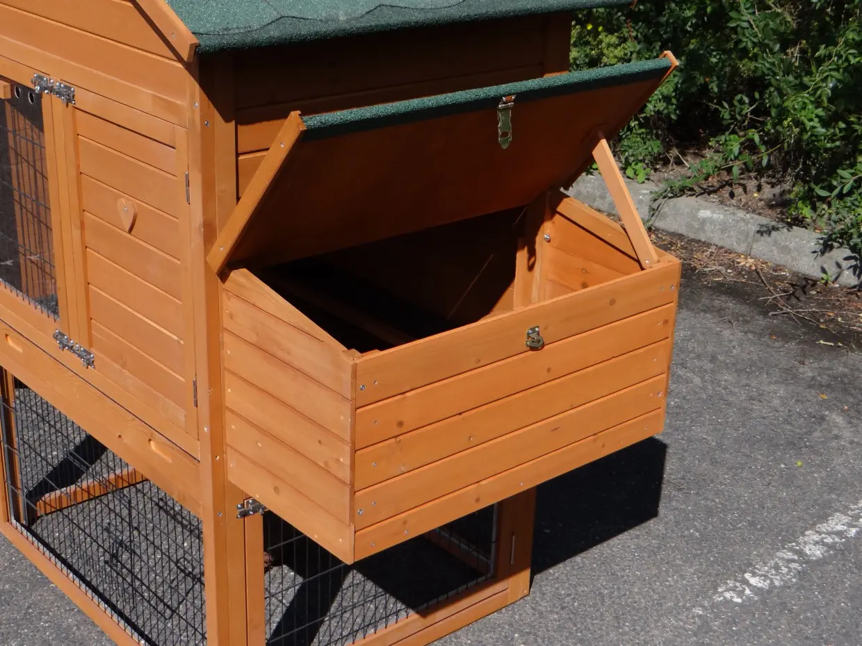 - Die Türen dieses Kaninchenstalls sind mit doppelten Schieberiegeln ausgestattet